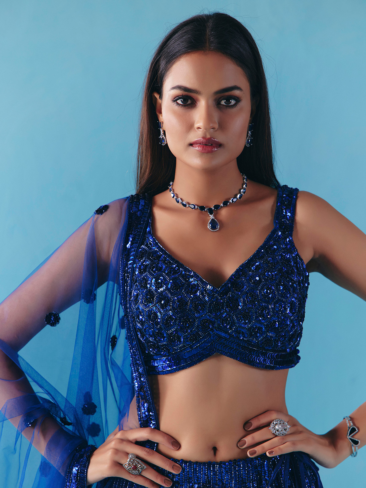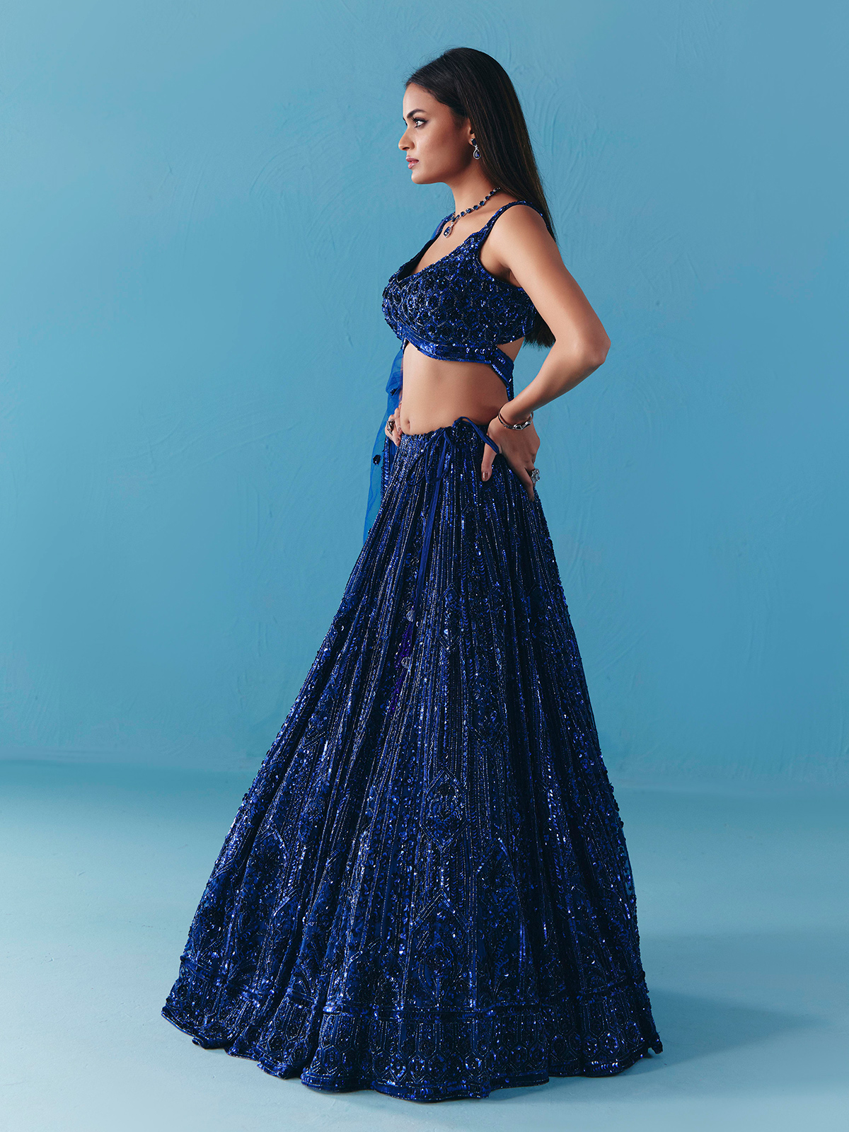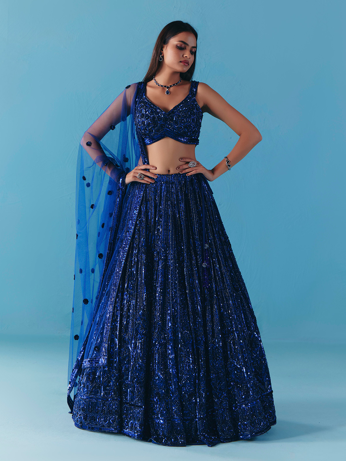Shimmering in blue net, this lehenga choli is adorned with dazzling cutdana and sequins work. Designed with a sweetheart neckline and sleeveless blouse, paired with a flowing dupatta, it is a glamorous pick for weddings, receptions, and parties radiating sophistication.
