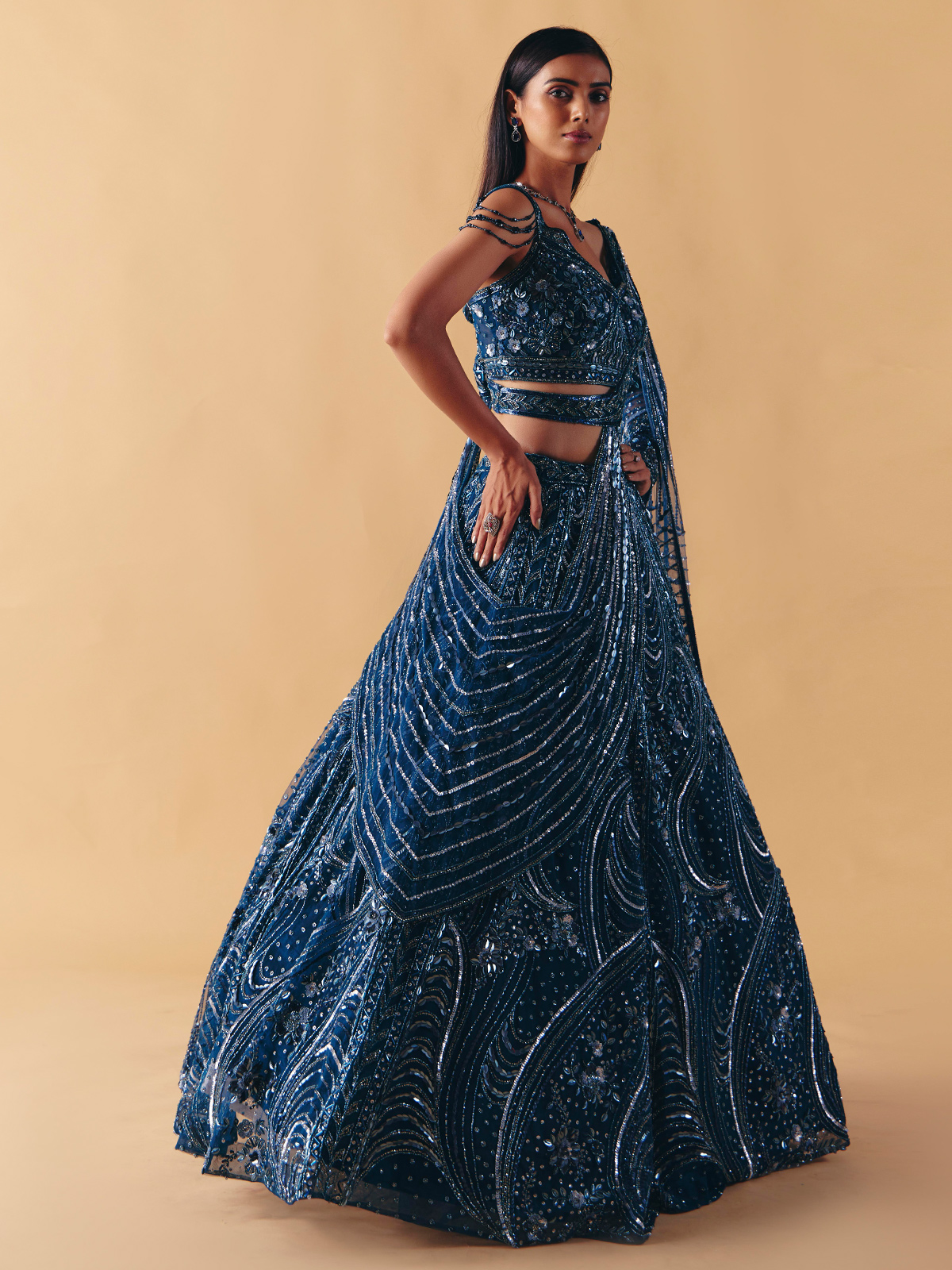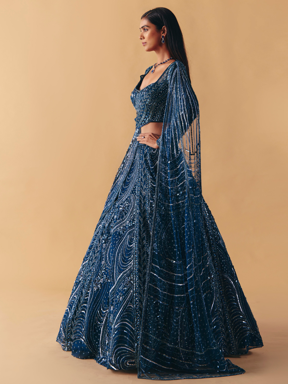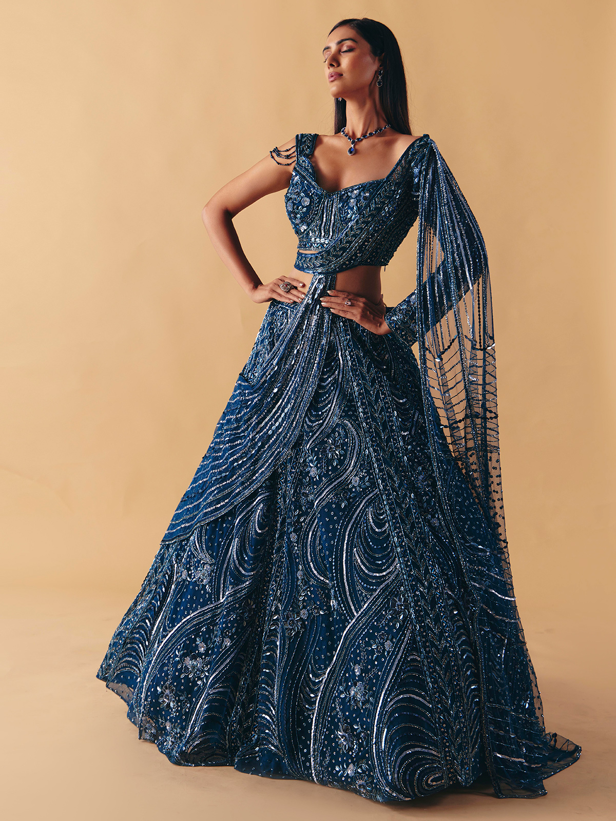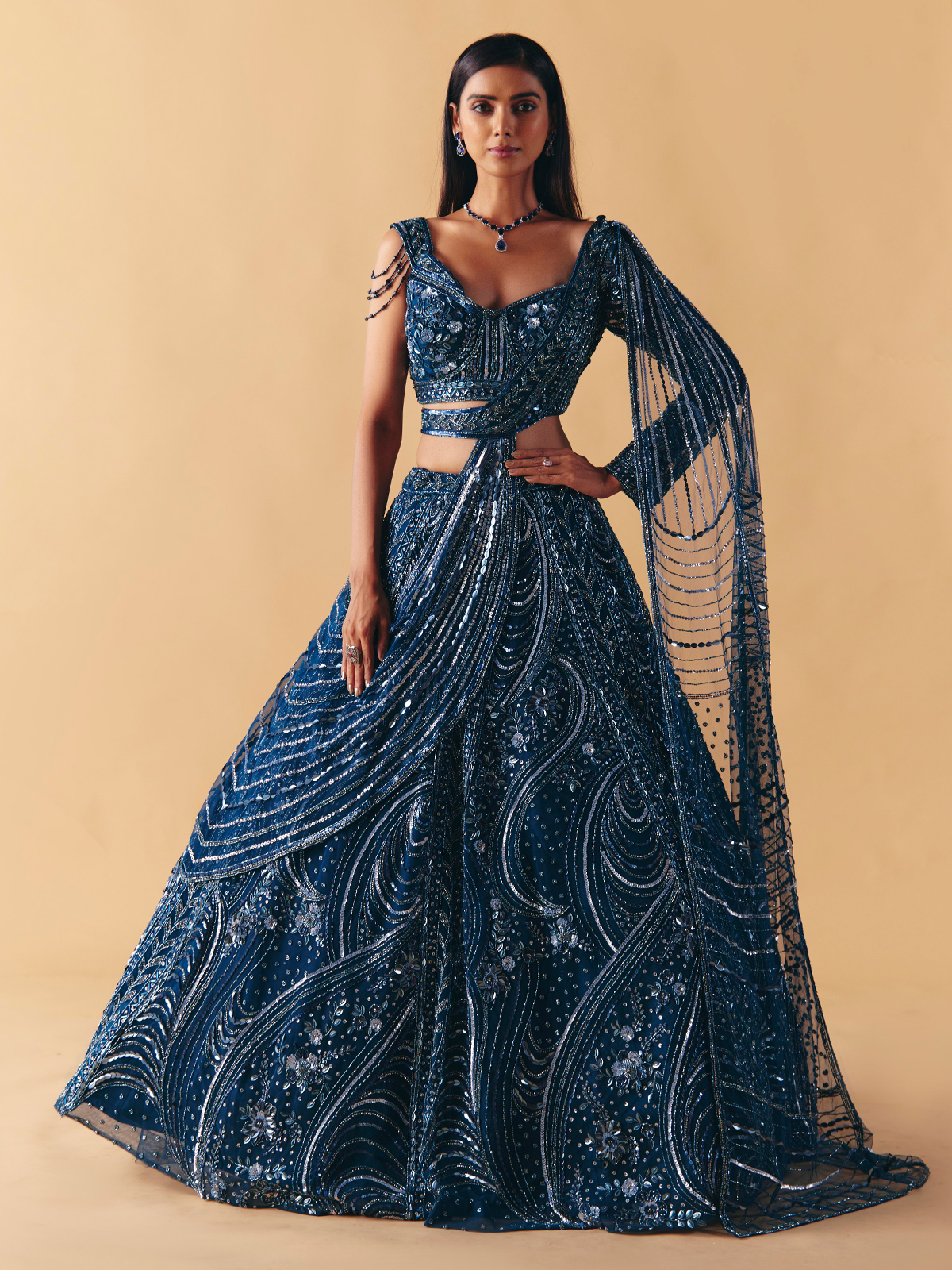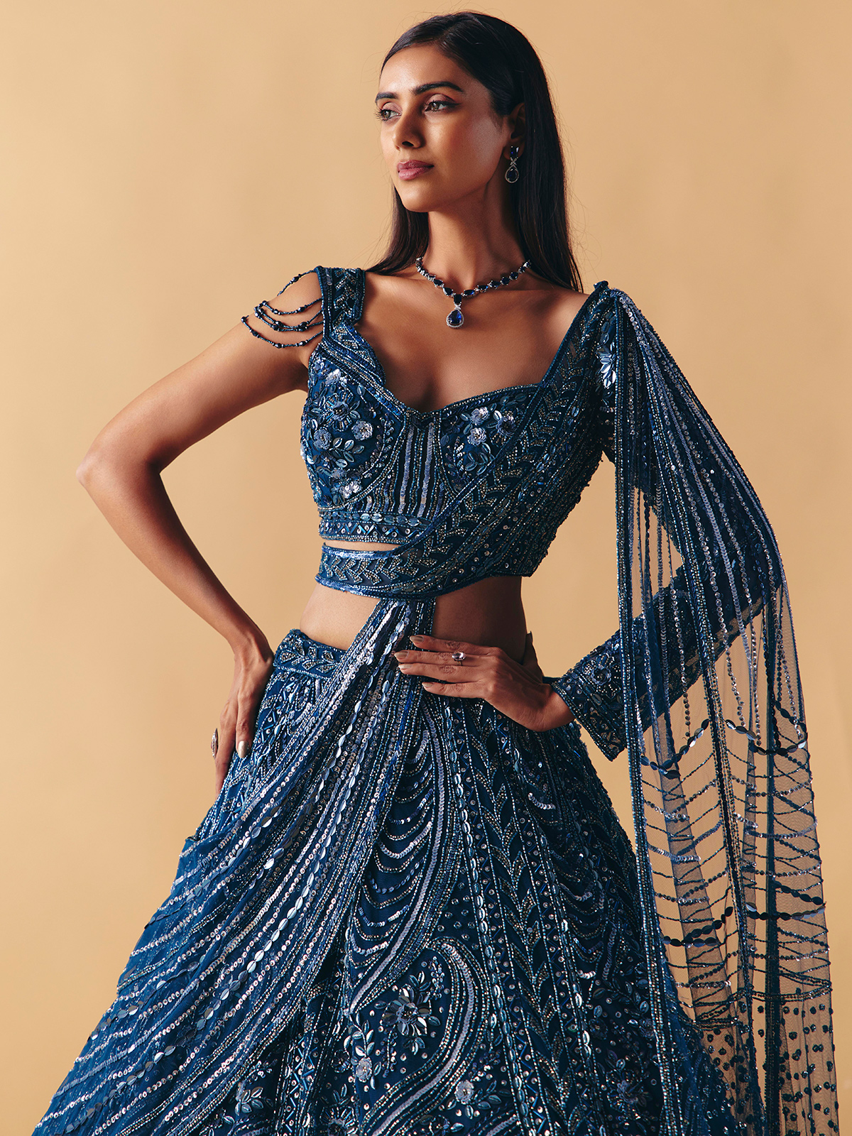 This blue net lehenga shimmers with diamond, cutdana, and sequins embellishments. Designed with a sleeveless sweetheart neckline and paired with a dupatta, it makes a grand choice for bridal events, receptions, and weddings, curating a luminous, majestic appeal.