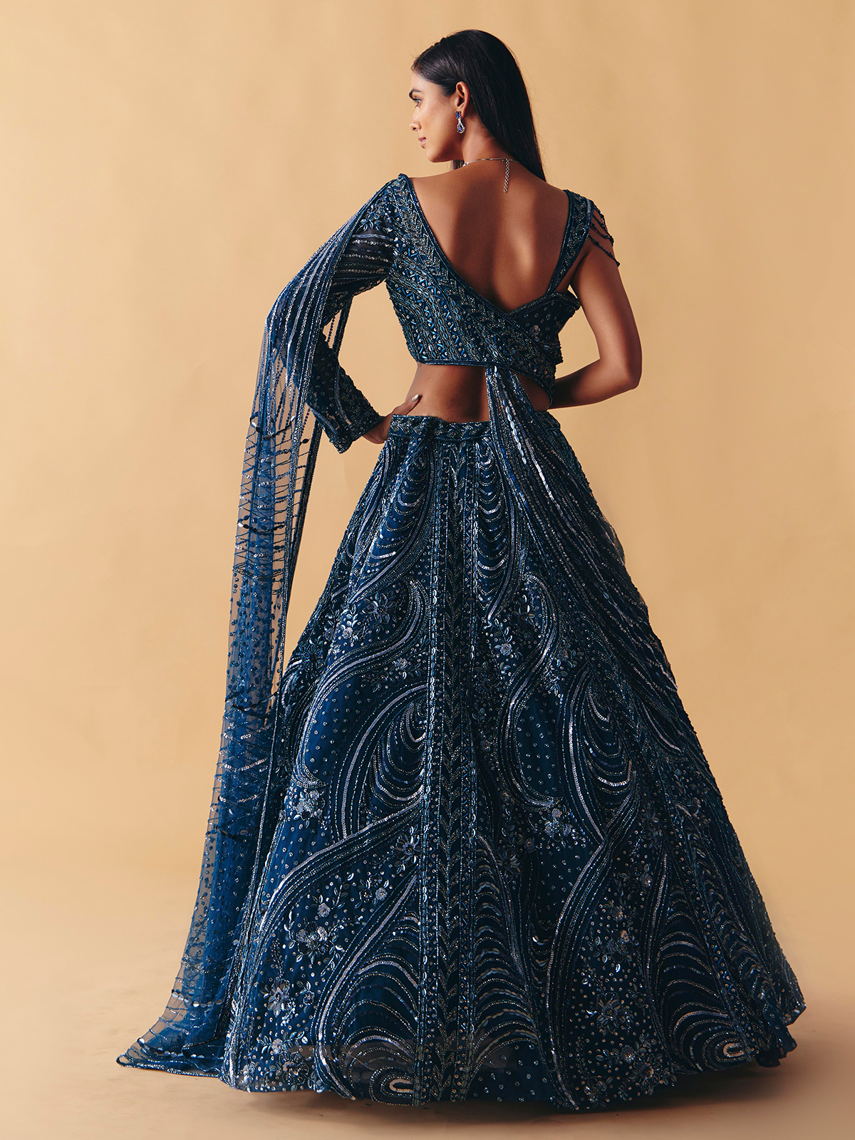 Blue Net Designer Lehenga With Diamond Sequins Glow