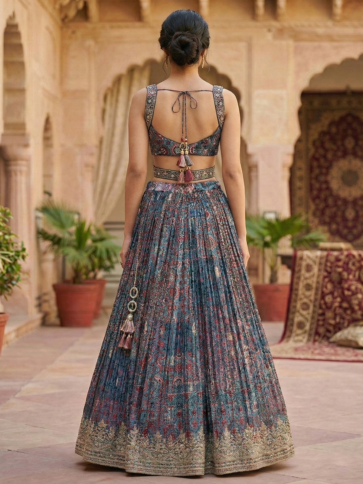 This elegant slate blue lehenga choli features a heavily embellished sleeveless blouse adorned with cutdana, sequins, mirror, and bead work, designed with a deep neckline and finished with a striking fringed hem of red beads. The floor-length lehenga is crafted from finely pleated fabric, highlighted with a traditional all-over ethnic print in red and gold tones and an intricately designed ornate border.