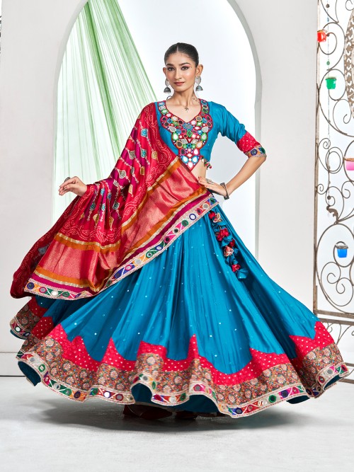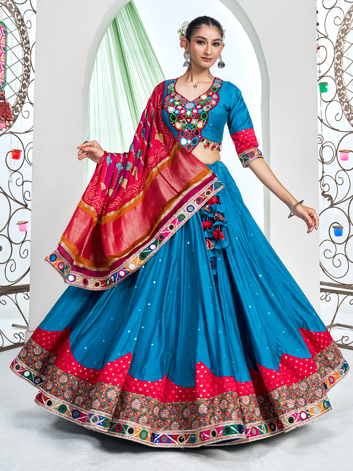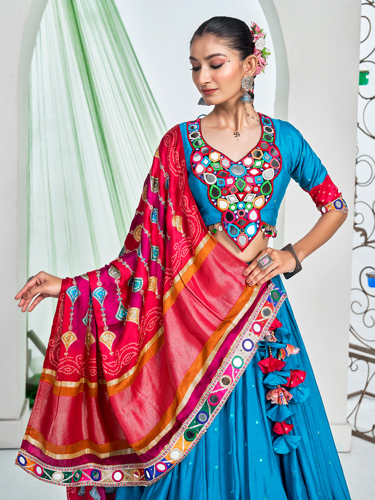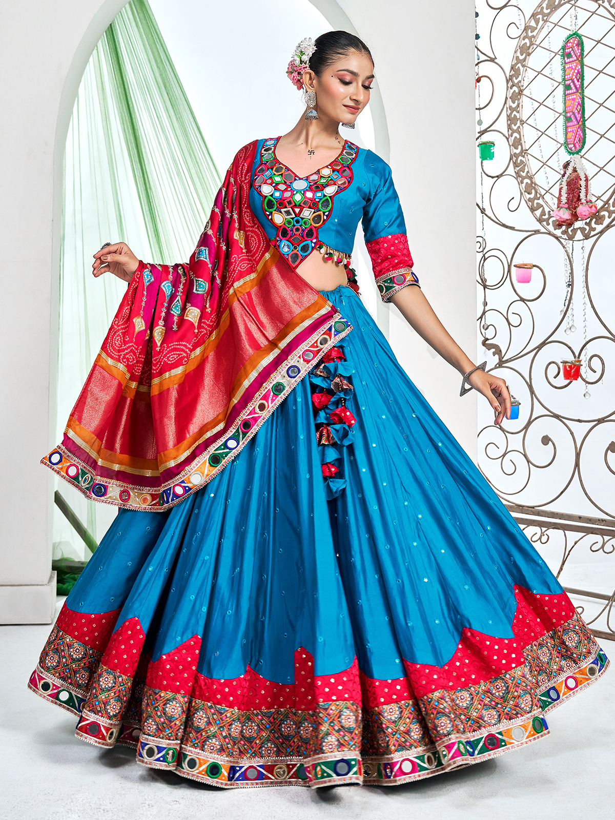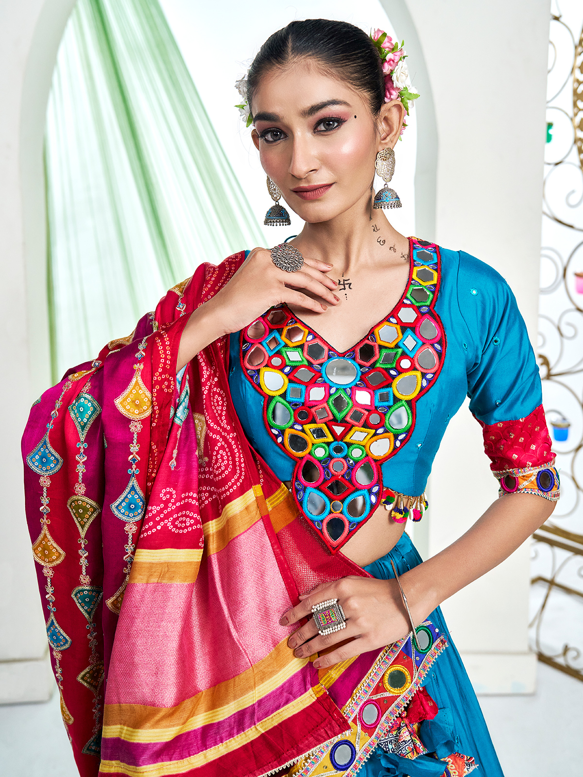 Blue Silk Navratri Lehenga Choli With Contrasting Red Dupatta