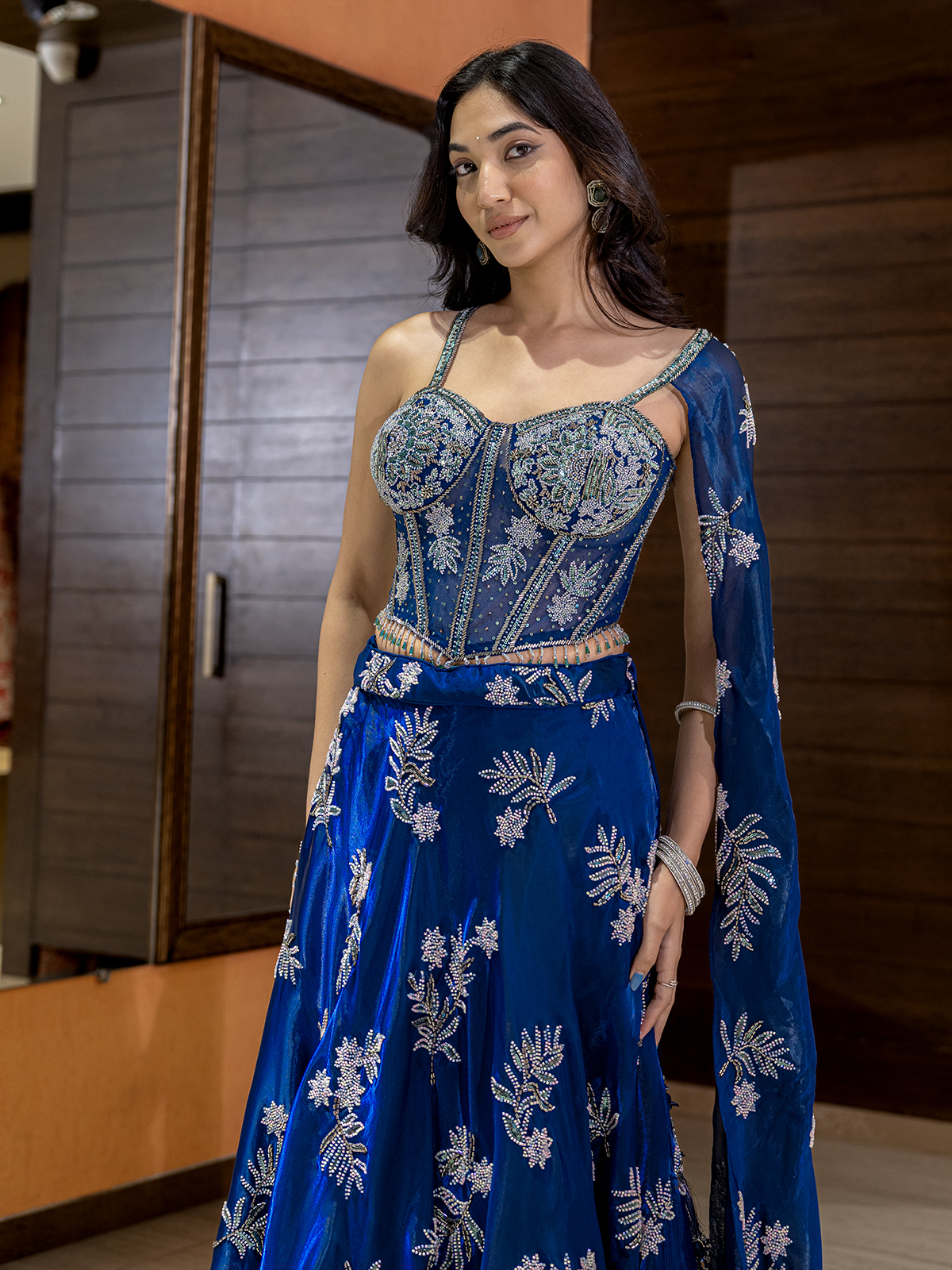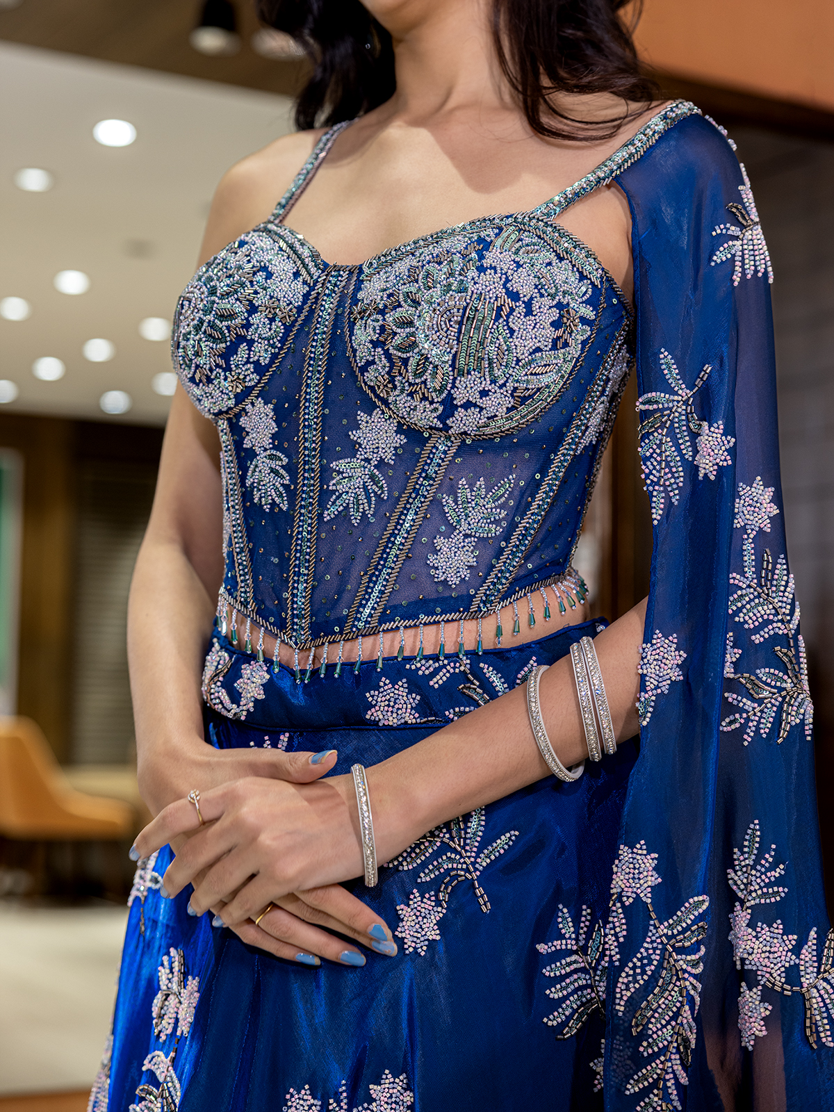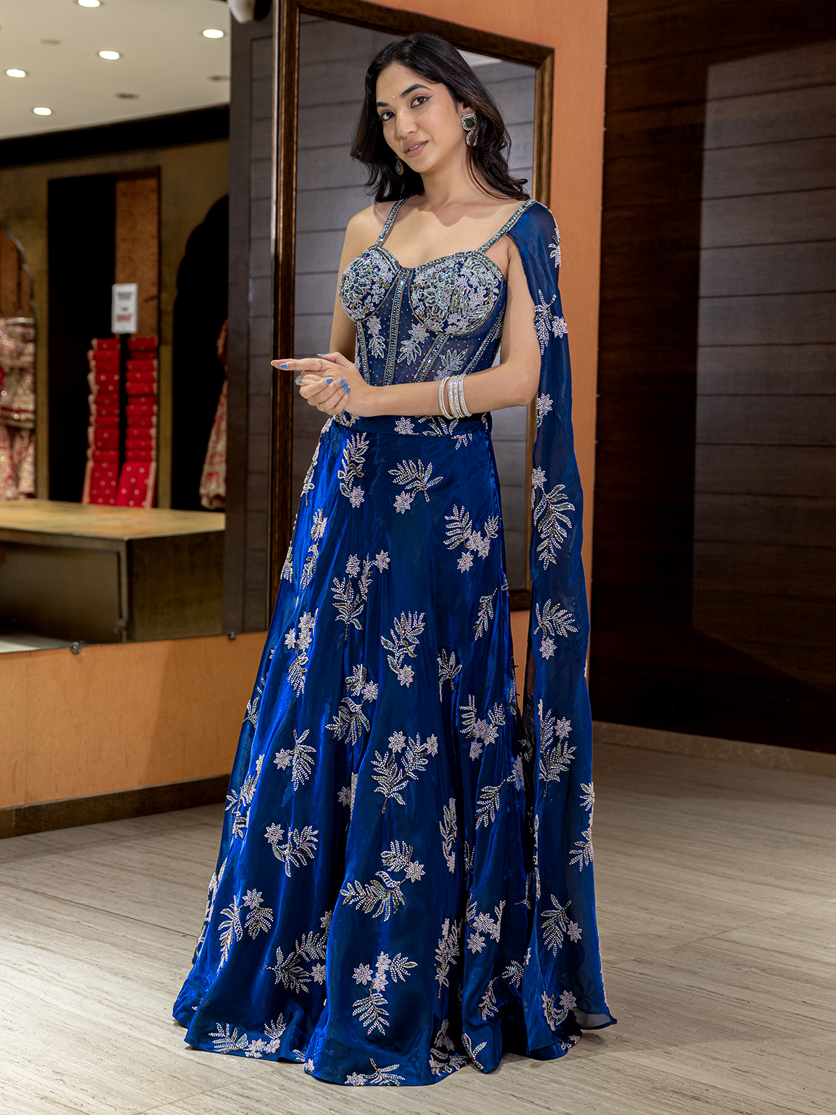 A radiant blue silk lehenga choli adorned with sequins, beads, and cutdana work captures the spirit of celebration. Its sleeveless silhouette adds modern allure to the traditional elegance. Completed with a flowing and shimmering dupatta, it creates a mesmerizing aura perfect for receptions and grand festivities.
