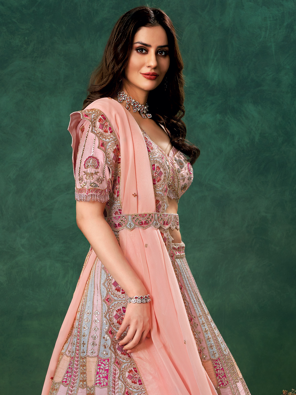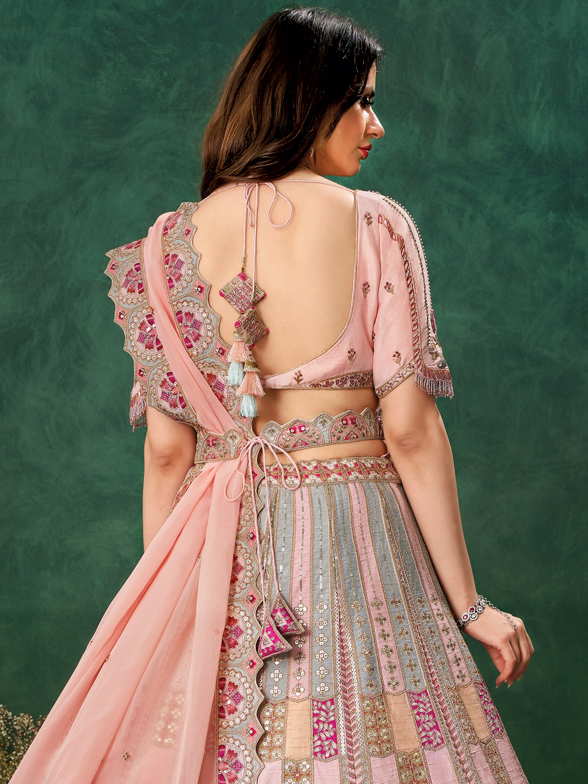Strike the perfect fusion of modernity and tradition in this light pink lehenga choli made of raw silk. Beautifully adorned with sequins, threadwork, cutdana, and beads, the choli features a sweetheart neckline and elegant elbow sleeves. Comes with an embellished dupatta for a complete look.