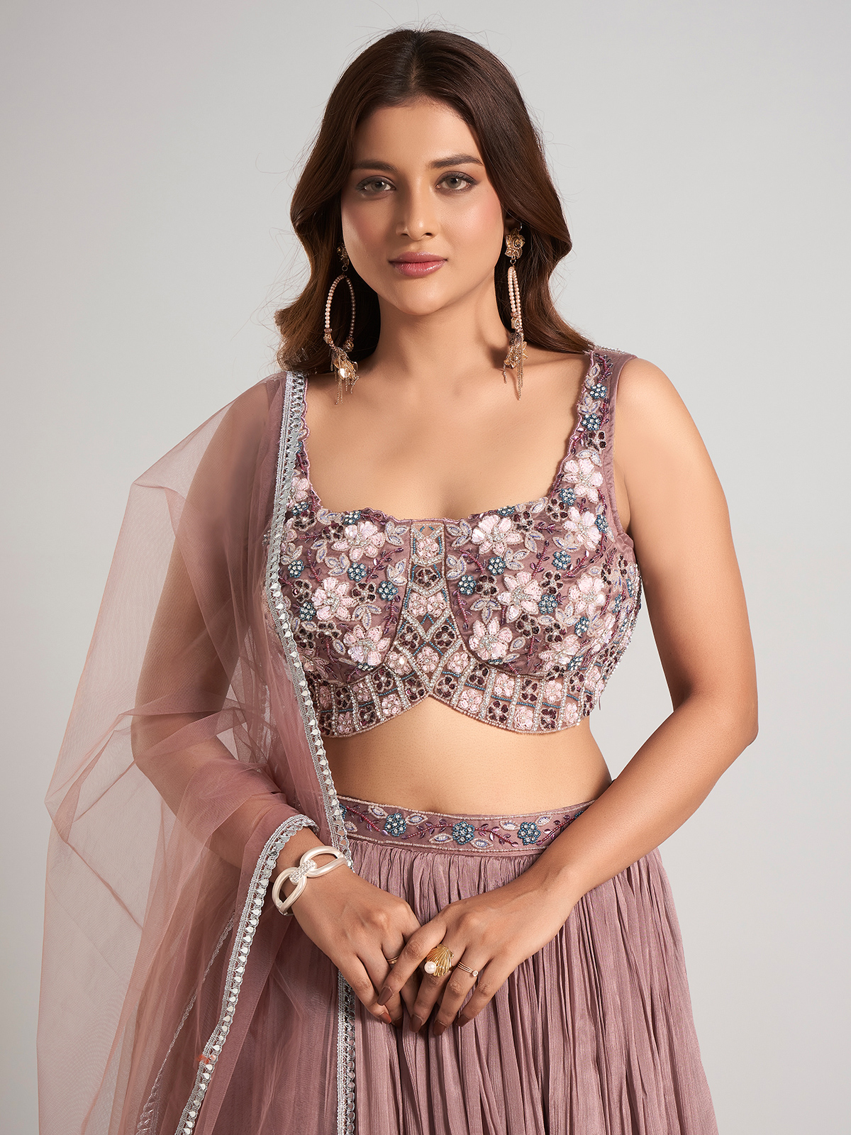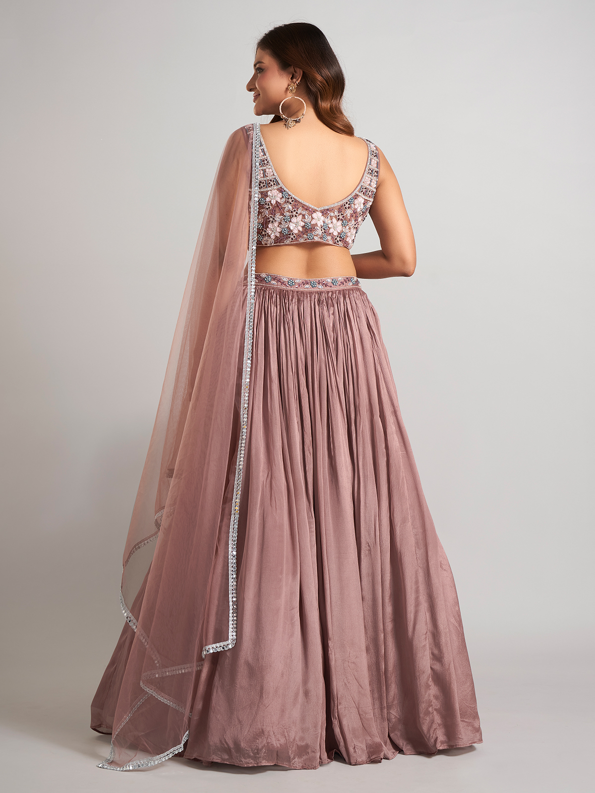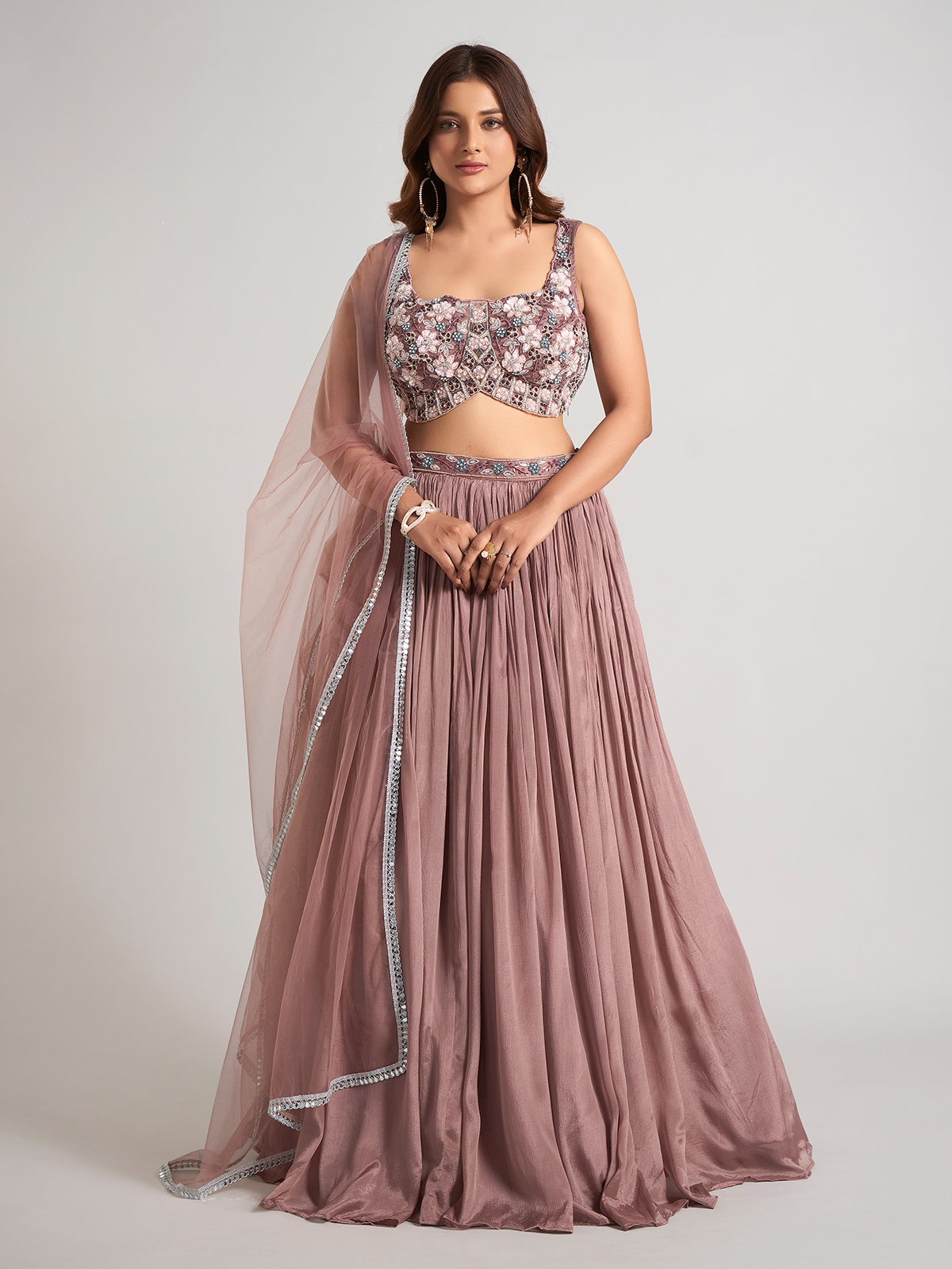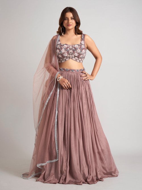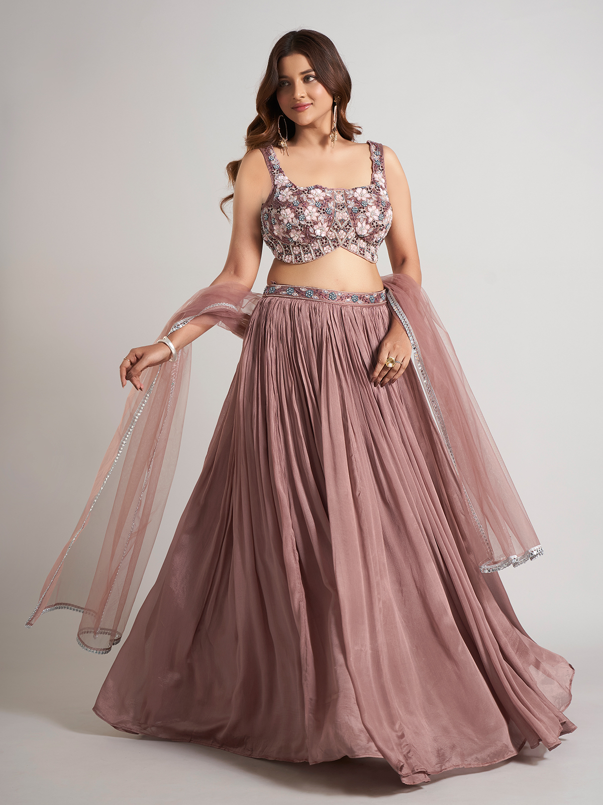 A rich brown silk lehenga choli accentuated with cutdana, beads, sequins, and stone embellishments. Square neckline and sleeveless silhouette add a contemporary touch. Includes a coordinating dupatta for festive affairs.