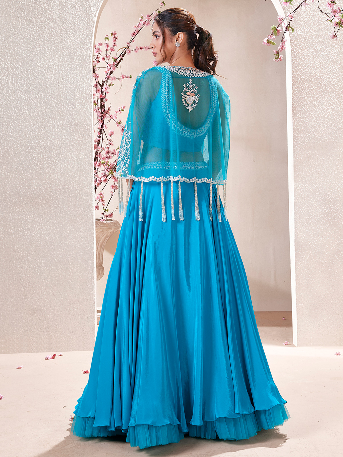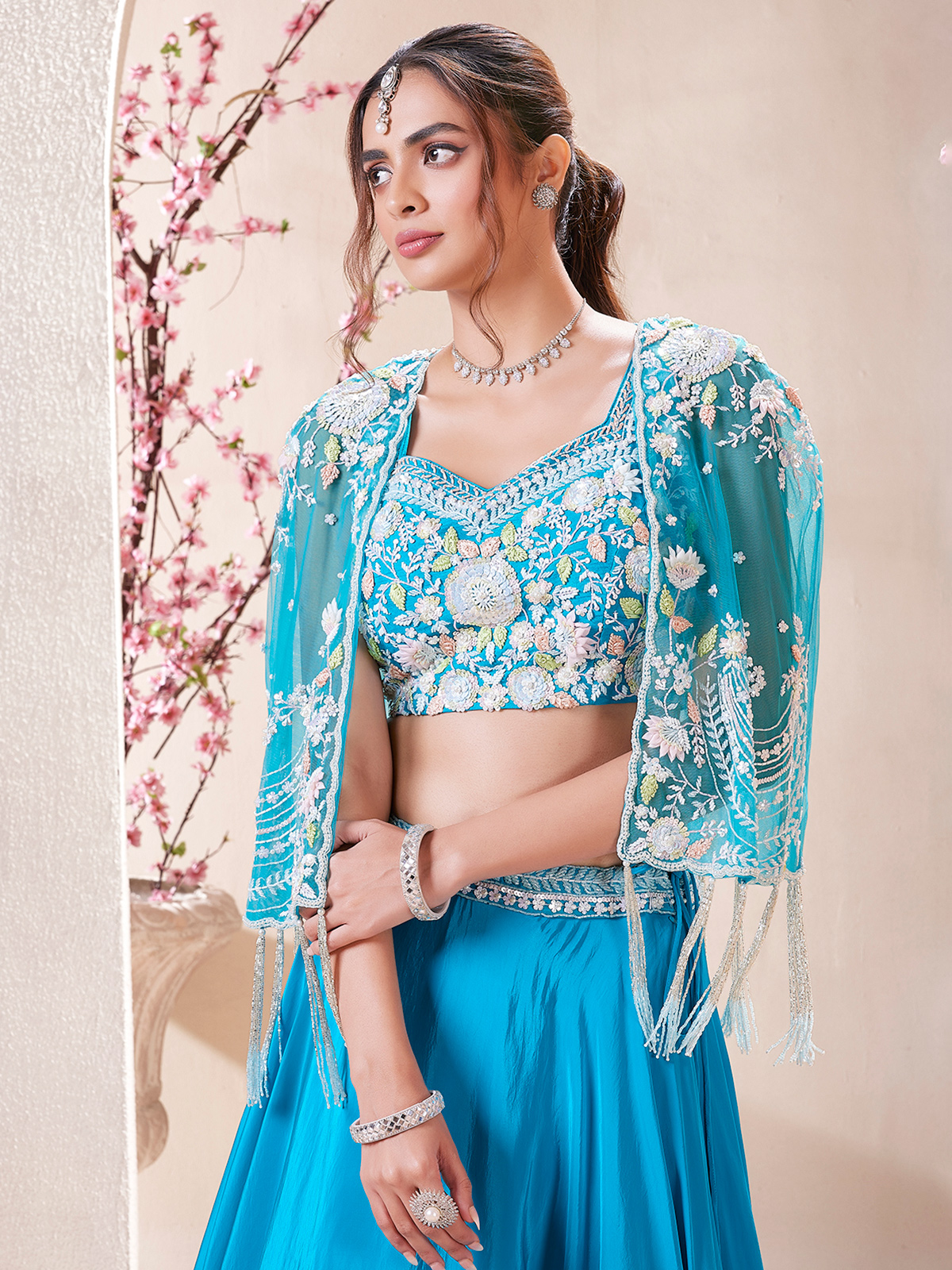 You will feel fashionable wearing this aqua satin lehenga choli and jacket. The Choli includes a ready-made blouse and is nicely embellished with embroidery, resham, sequins, beads, and pearls.