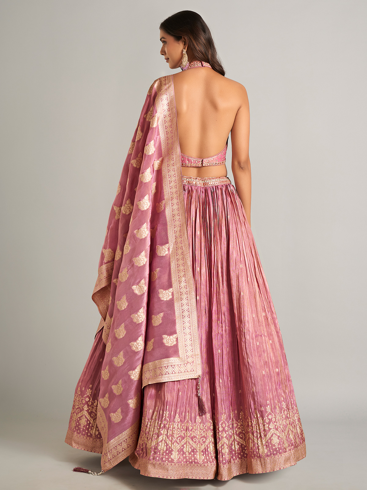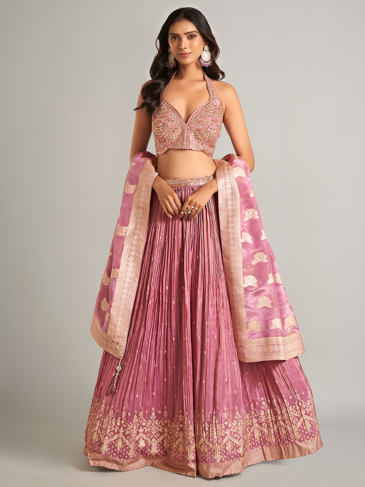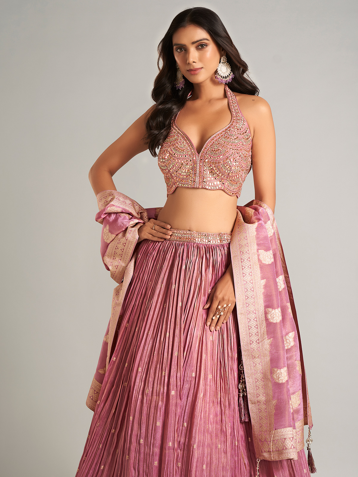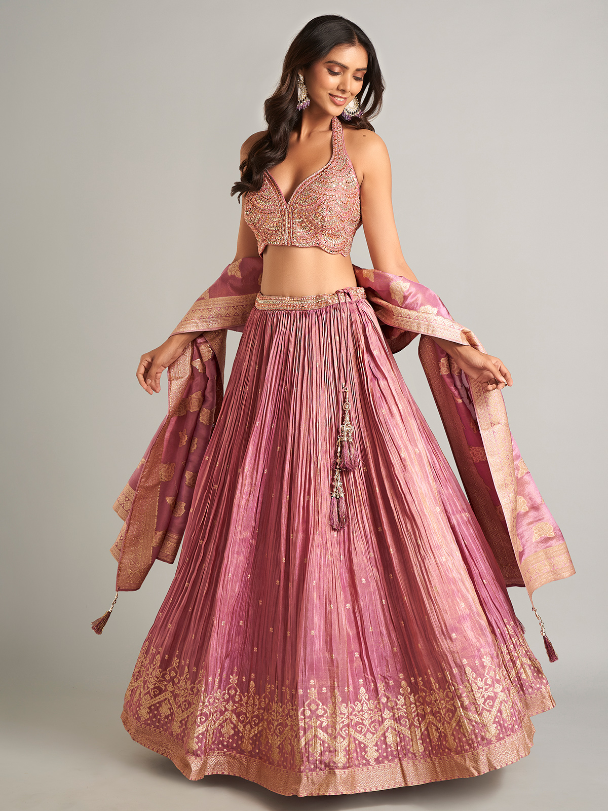 Make a striking impression in this onion pink lycra lehenga choli, adorned with intricate embroidery, aabla, stone, resham, and zari work. The sweetheart neckline and sleeveless cut add a modern flair, making it a stunning option for weddings.