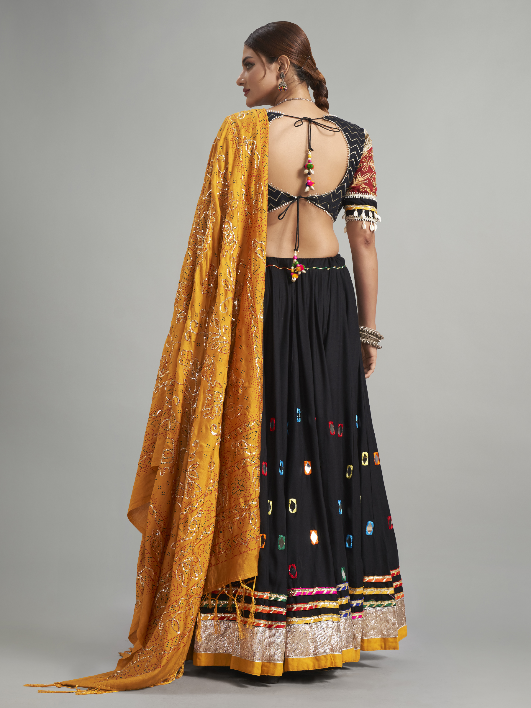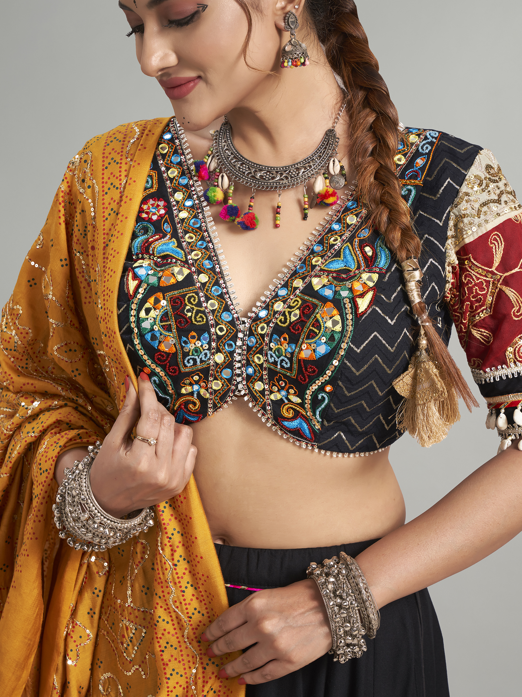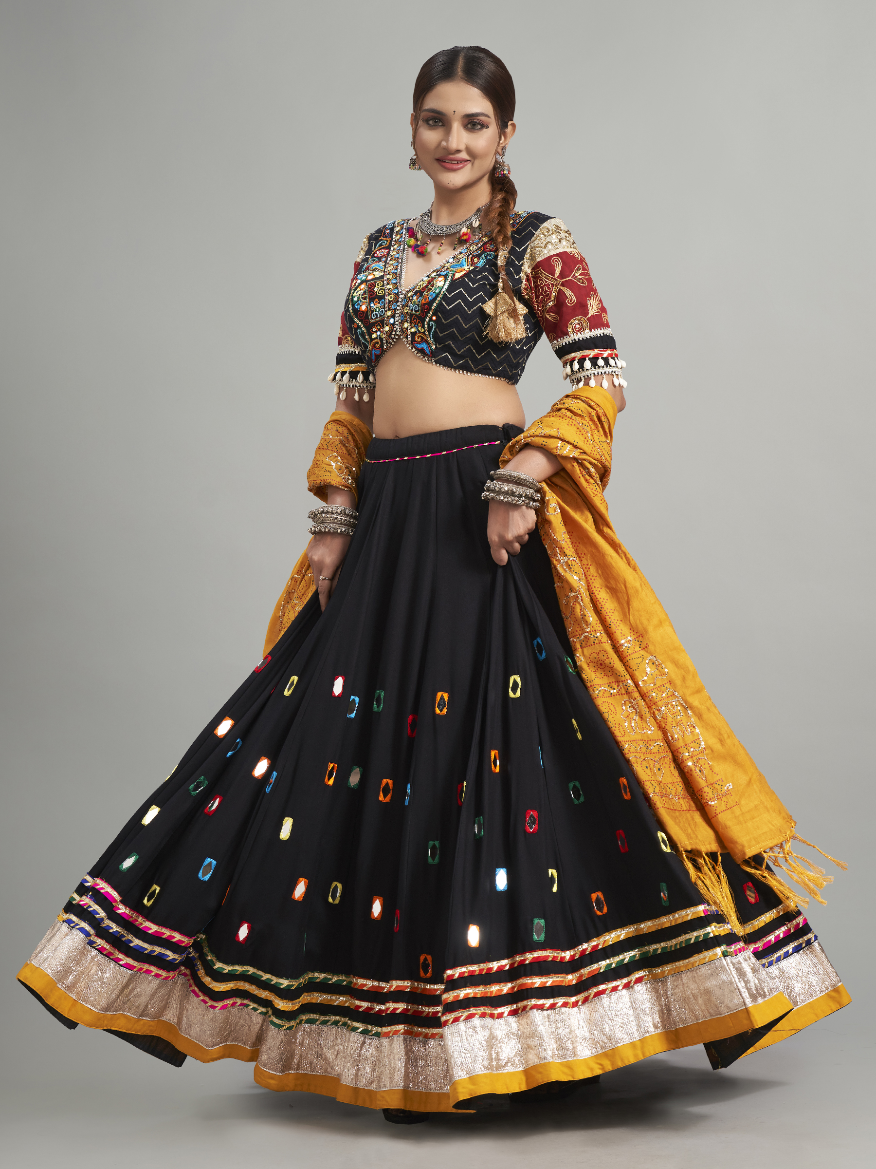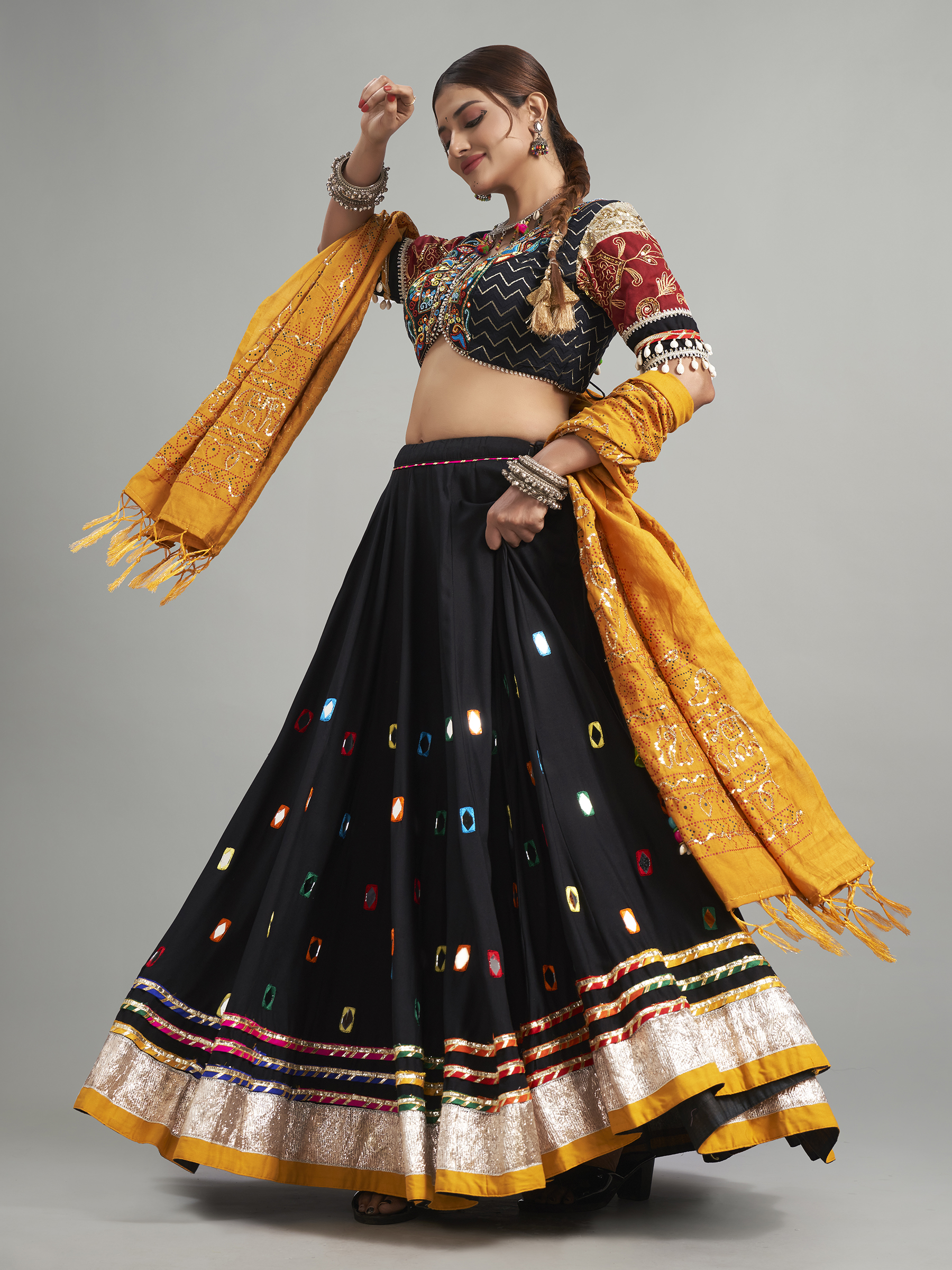 Get ready to steal the limelight and make memories that last a lifetime with this stunning black cotton silk chaniya choli. Enhanced with sequins, beads, resham, thread, mirror, cowrie shells, and gota work, it features a V-neck and elbow sleeves. Comes with a dupatta. Note that the print and work may slightly vary from the image.