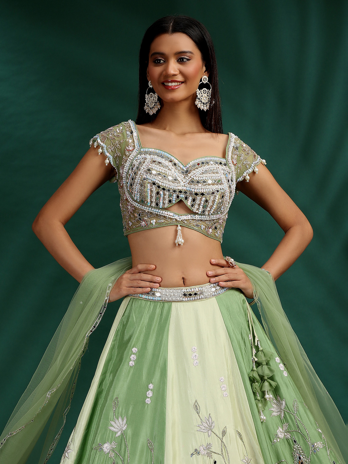 Celebrate grandeur with this cream and green silk lehenga choli, highlighted with shimmering beads, sequins, and mirror work. The sleeveless sweetheart-neckline choli paired with a matching dupatta enhances its regal charm. Perfect for weddings, it balances vibrant detail with classic grace for a radiant festive look.