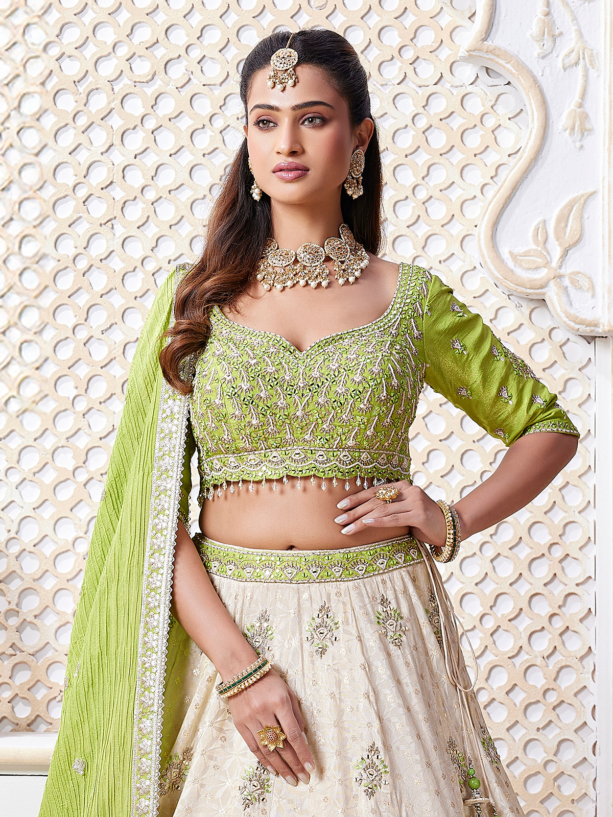 Cream And Green Sweetheart Neck Embroidered Lehenga Choli
