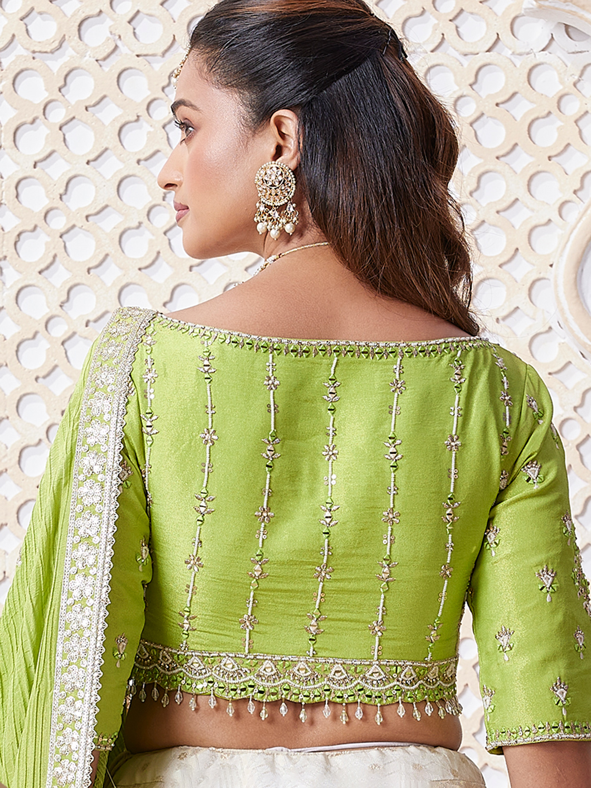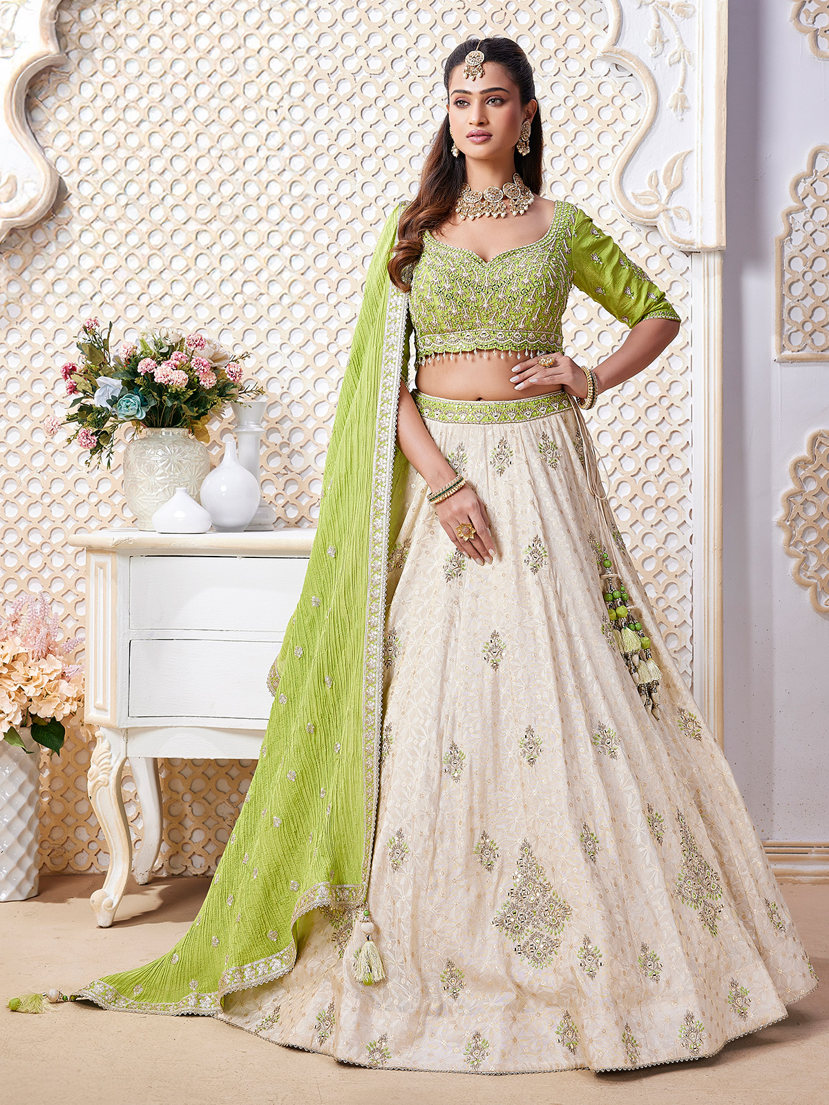This cream and green silk lehenga choli is richly decorated with embroidery, sequins, aabla, cutdana, beads, and zari accents. Designed with a sweetheart neckline and elbow sleeves, it comes paired with a dupatta, creating a graceful festive ensemble perfect for weddings, sangeet functions, and receptions.