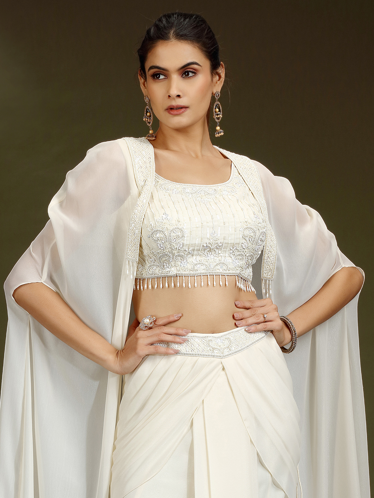 Delicate in soft cream chiffon, this lehenga choli is embellished with sequins, beads, and cutdana. Featuring a round neckline and sleeveless cut, it is styled with a flowing shrug for added elegance. An enchanting choice for parties, weddings, or receptions with refined festive charm.