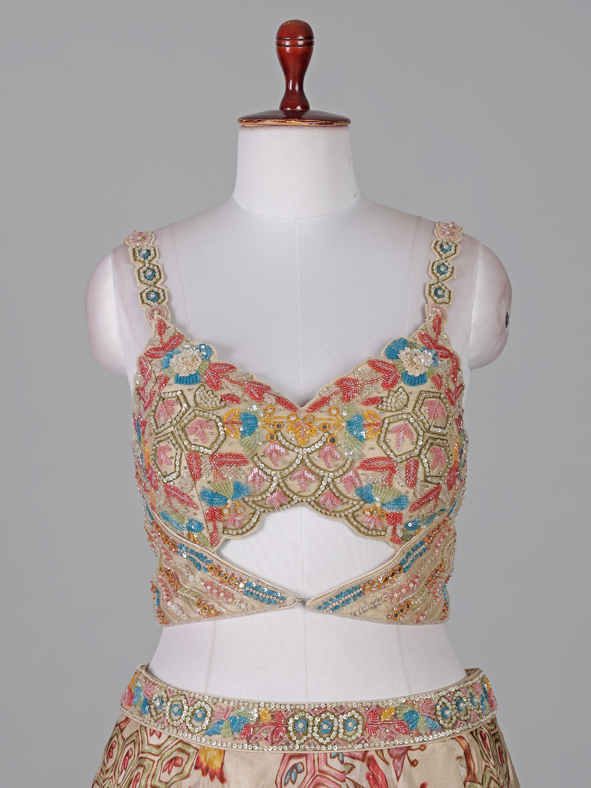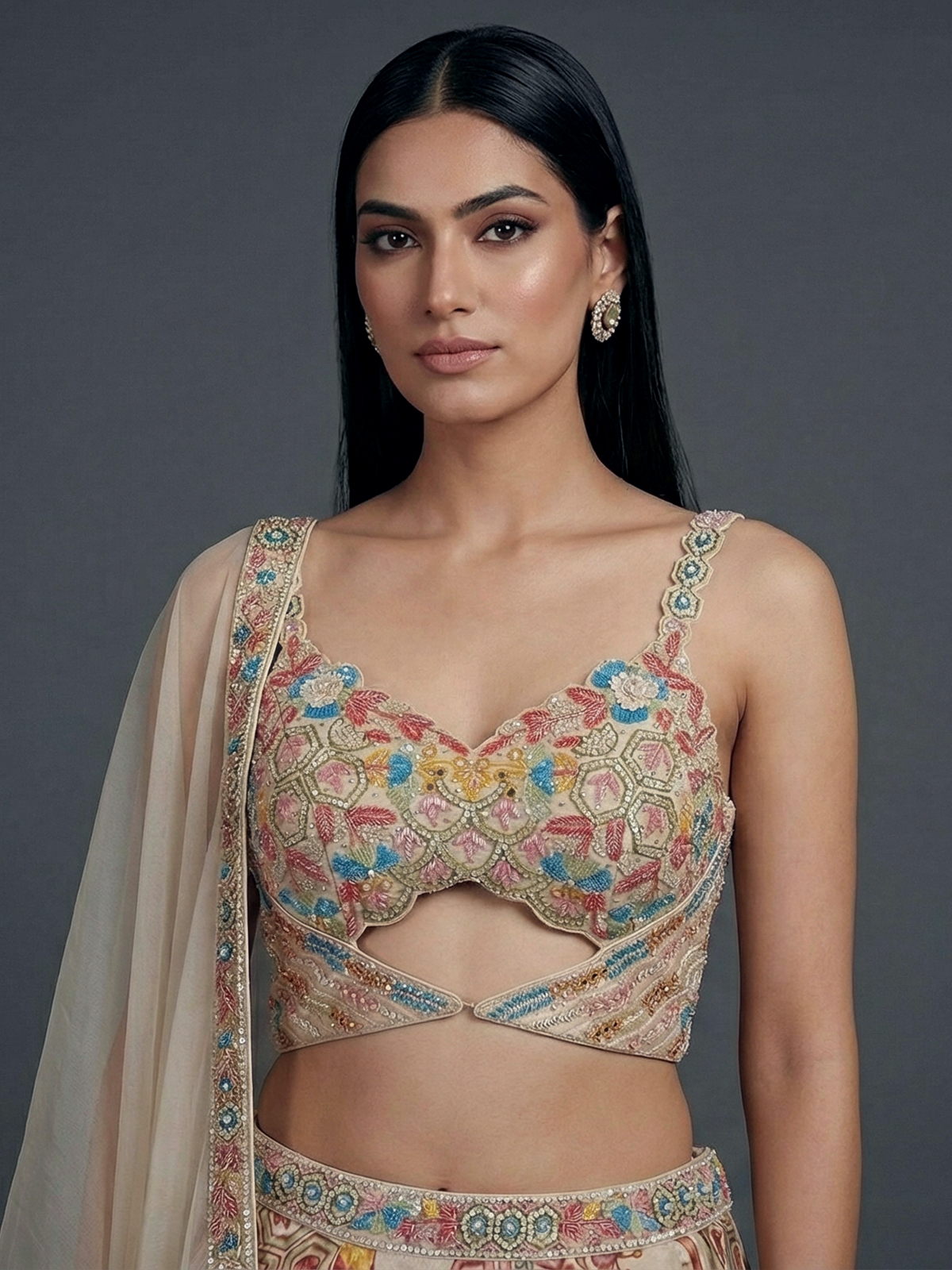 Elegant cream tones highlight this crepe silk lehenga choli crafted for sophisticated occasions. Adorned with cutdana, sequins, beads, diamond and mirror work. It sparkles with refined beauty. The sweetheart neckline and sleeveless blouse enhance its graceful silhouette. Paired with a dupatta, it is perfect for receptions and party wear.