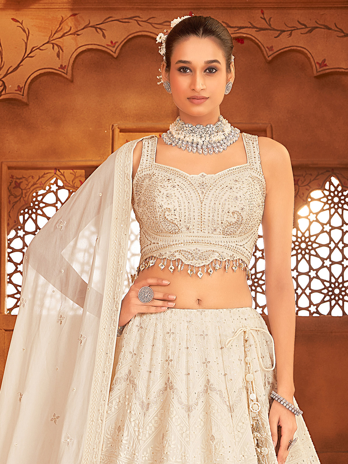 Lightweight and refined, this cream georgette lehenga choli is embellished with sequins, beads, embroidery, and diamond accents. The sweetheart neckline enhances its feminine appeal, making it a beautiful choice for weddings, receptions, or evening celebrations.