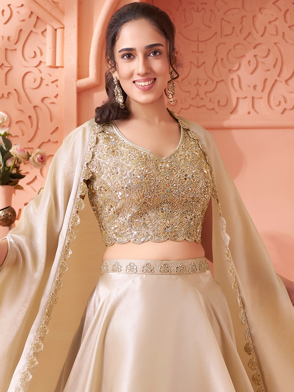Radiating soft elegance, this cream organza tissue silk lehenga choli is adorned with delicate cutdana, sequins and bead embellishments that add refined sparkle. The sleeveless U-neck choli is paired with a stylish designer shrug, creating a graceful layered silhouette, perfect for weddings, receptions and sangeet celebrations.