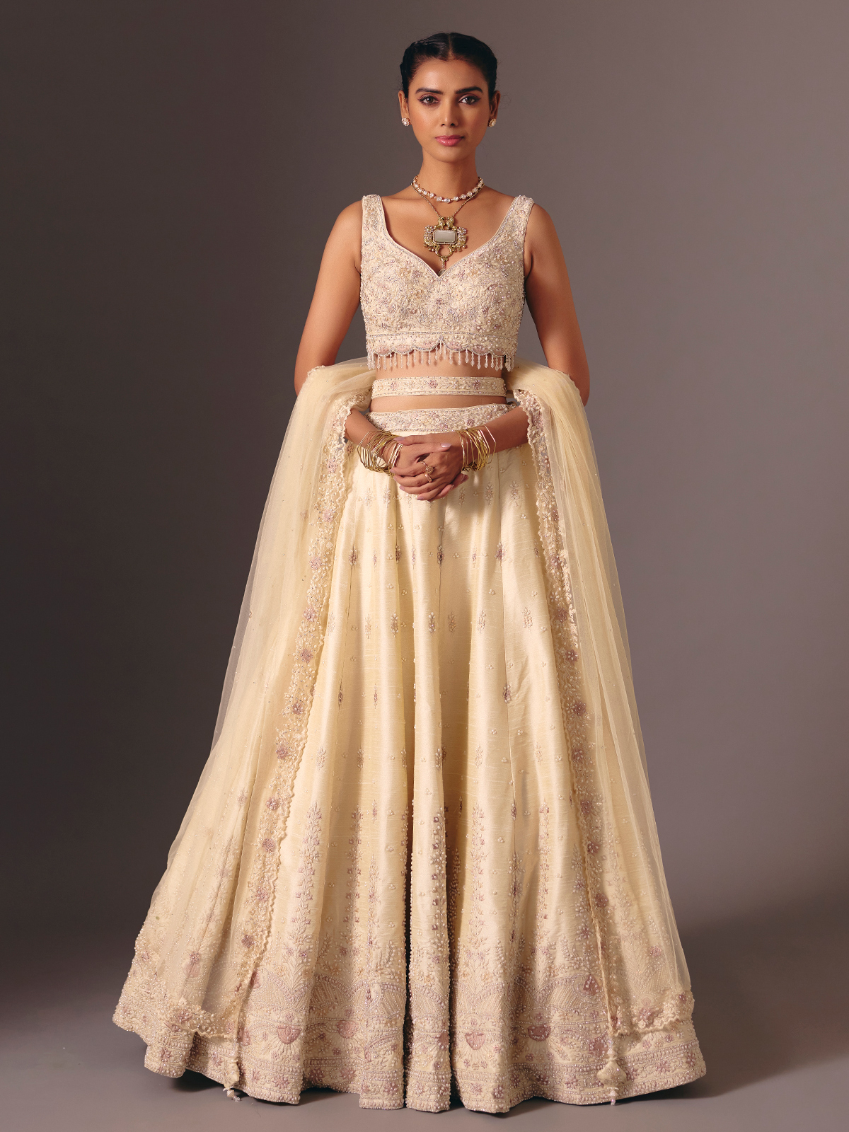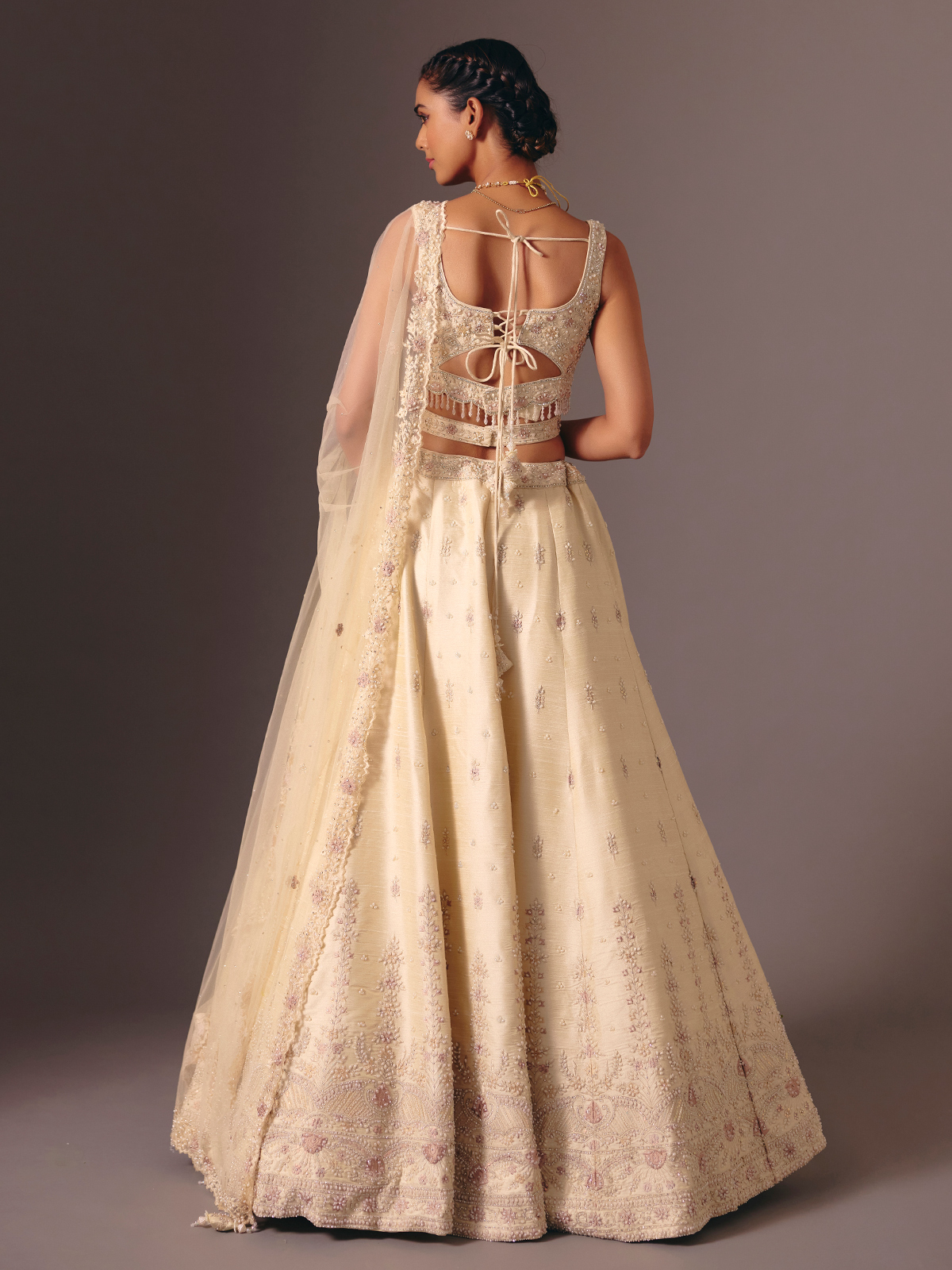 Ethereal in cream raw silk, this bridal lehenga gleams with embroidery, cutdana, stone, diamond and sequins. A sleeveless sweetheart blouse with dupatta enhances its refined allure, perfect for wedding vows and graceful receptions.