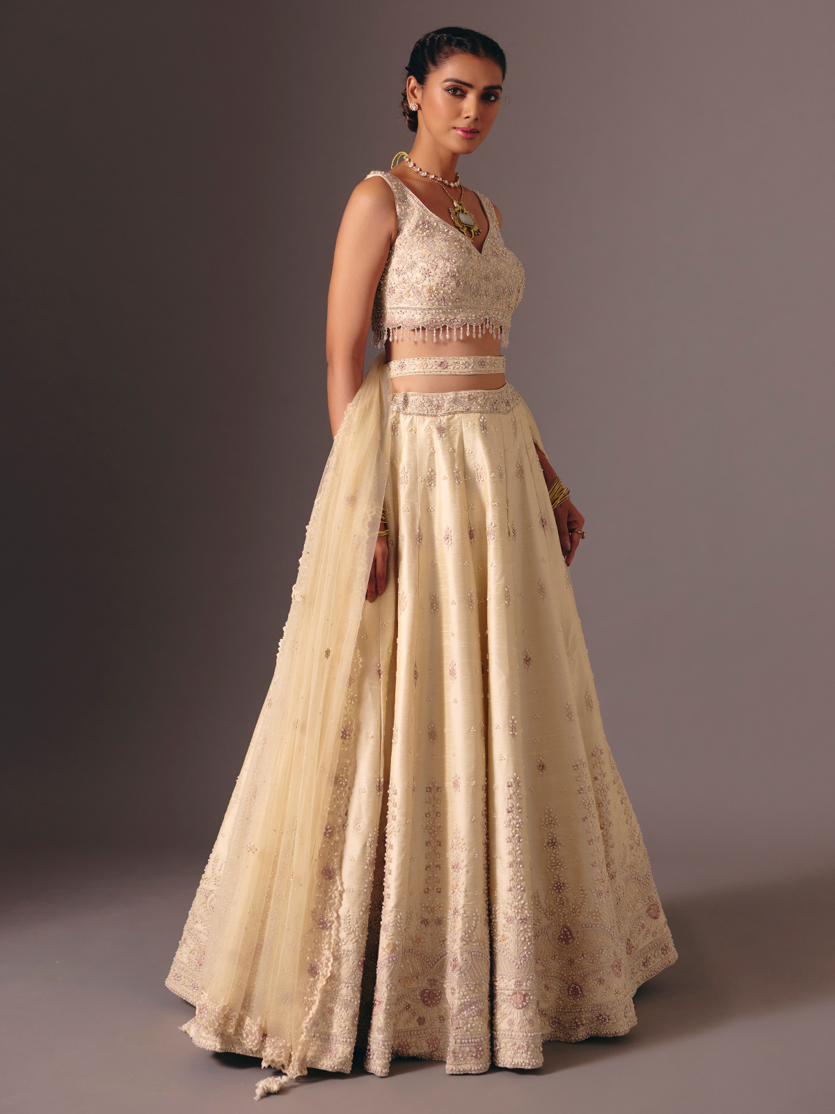 Cream Raw Silk Cutdana Bridal Lehenga Ensemble