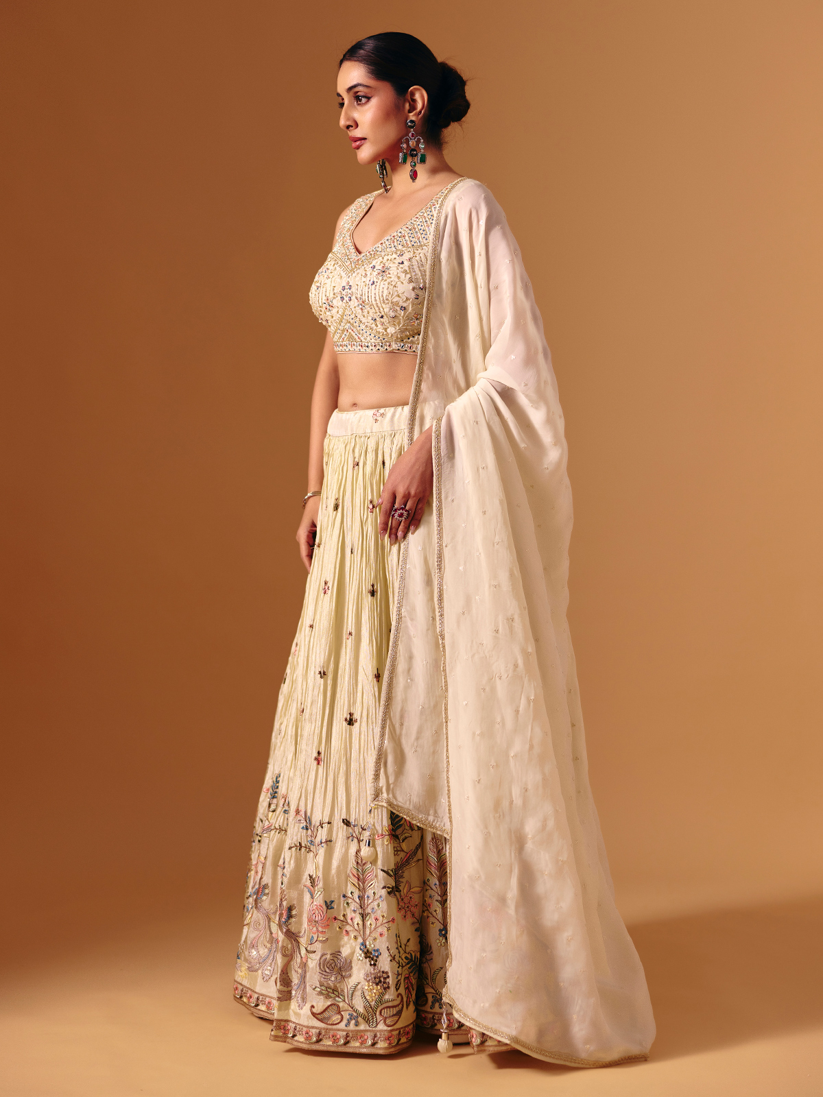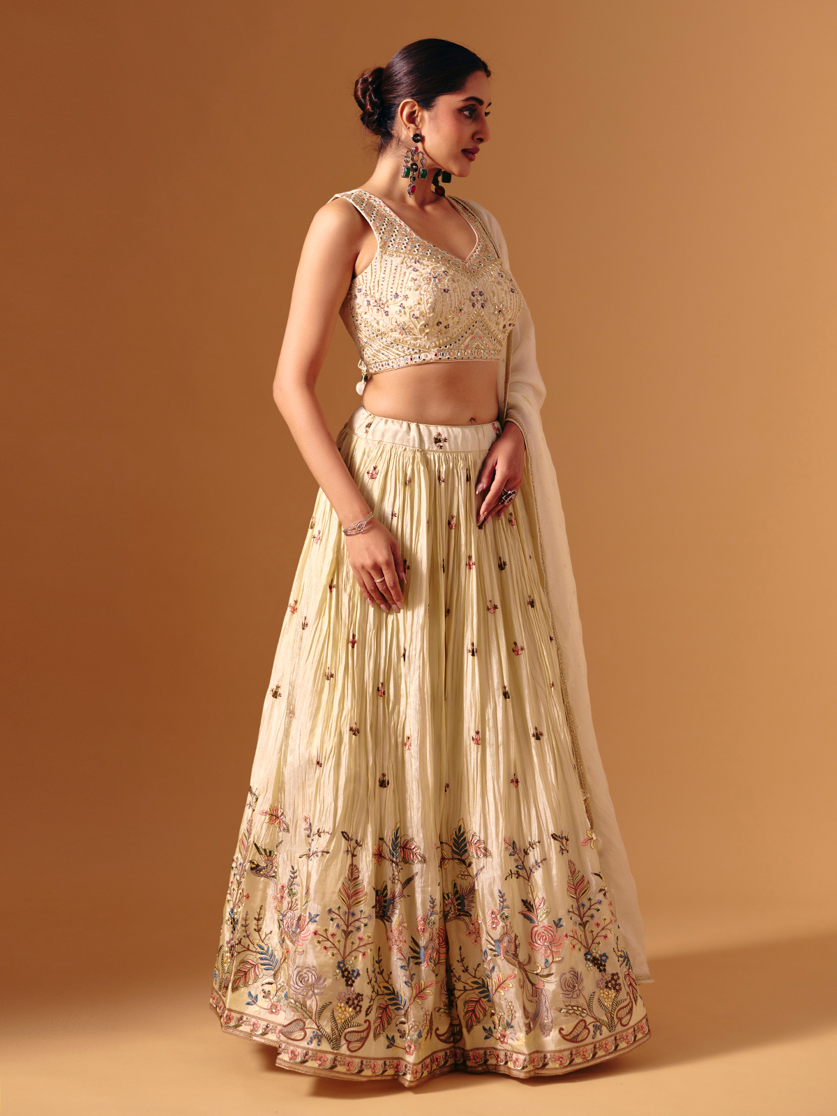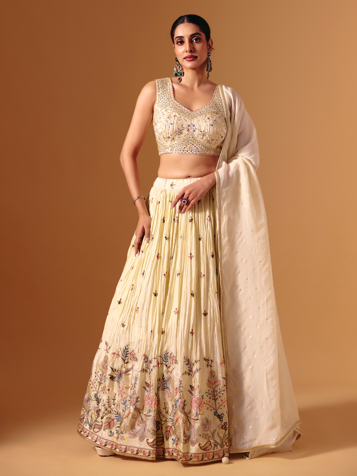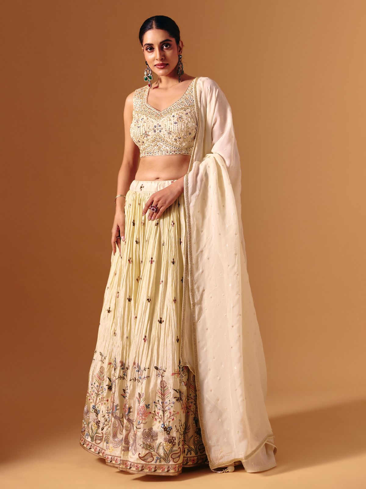 Cream Silk Mirror And Diamond Work Lehenga Choli