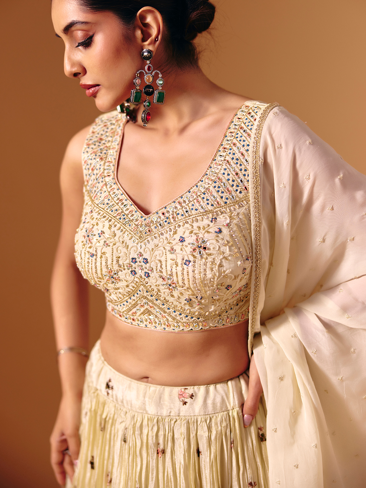 This elegant cream silk lehenga choli showcases exquisite cutdana, sequins, diamond highlights, mirror work and fine embroidery. Styled with a sleeveless sweetheart neckline and coordinated dupatta, it offers a polished festive look ideal for weddings, receptions and sangeet celebrations.
