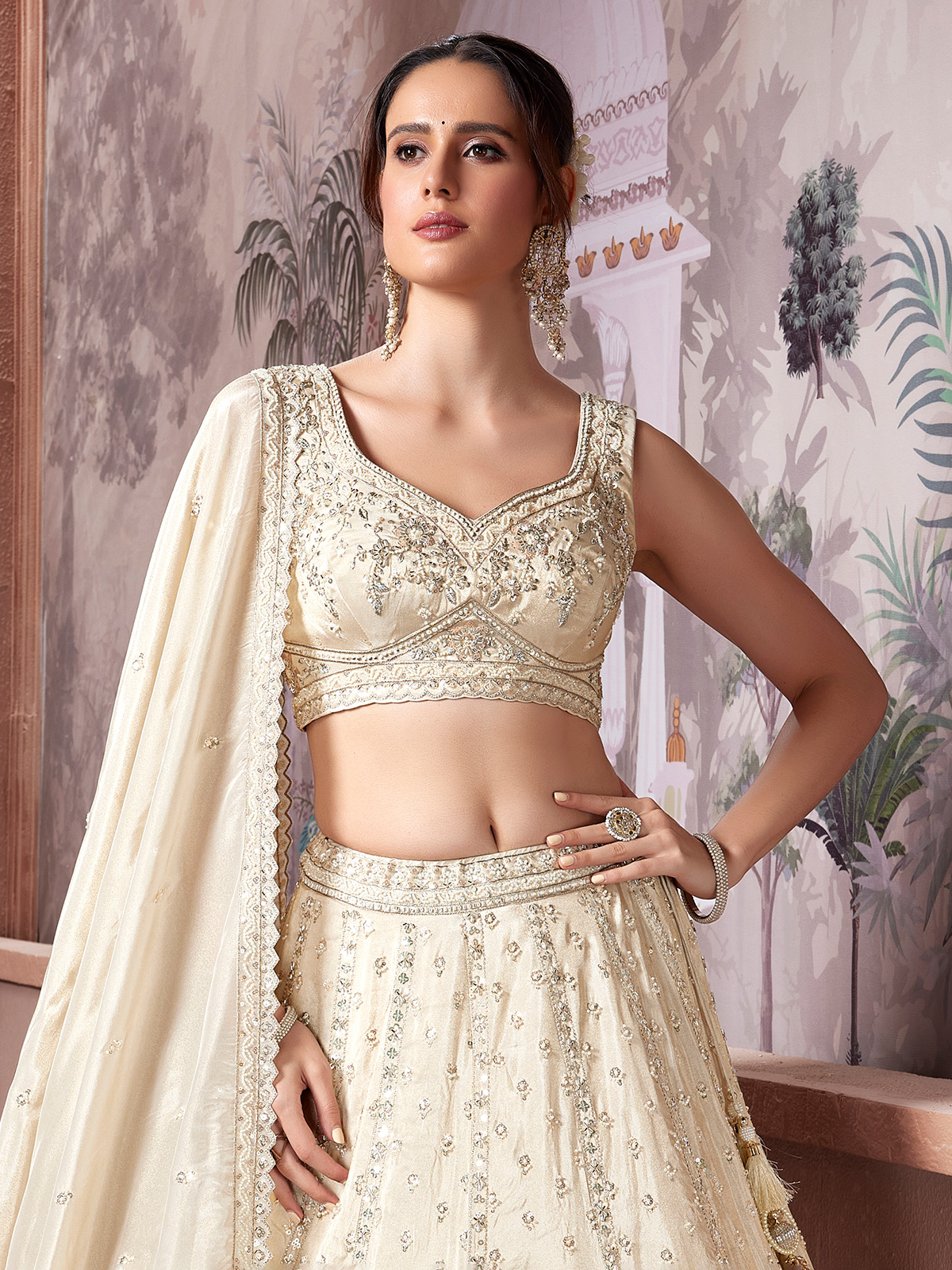 This cream silk lehenga choli with radiates subtle luxury with cutdana, sequins, beads and resham work. Designed with a sweetheart neckline and sleeveless blouse, it pairs beautifully with a soft dupatta, creating a graceful silhouette perfect for weddings, receptions and elegant sangeet evenings.