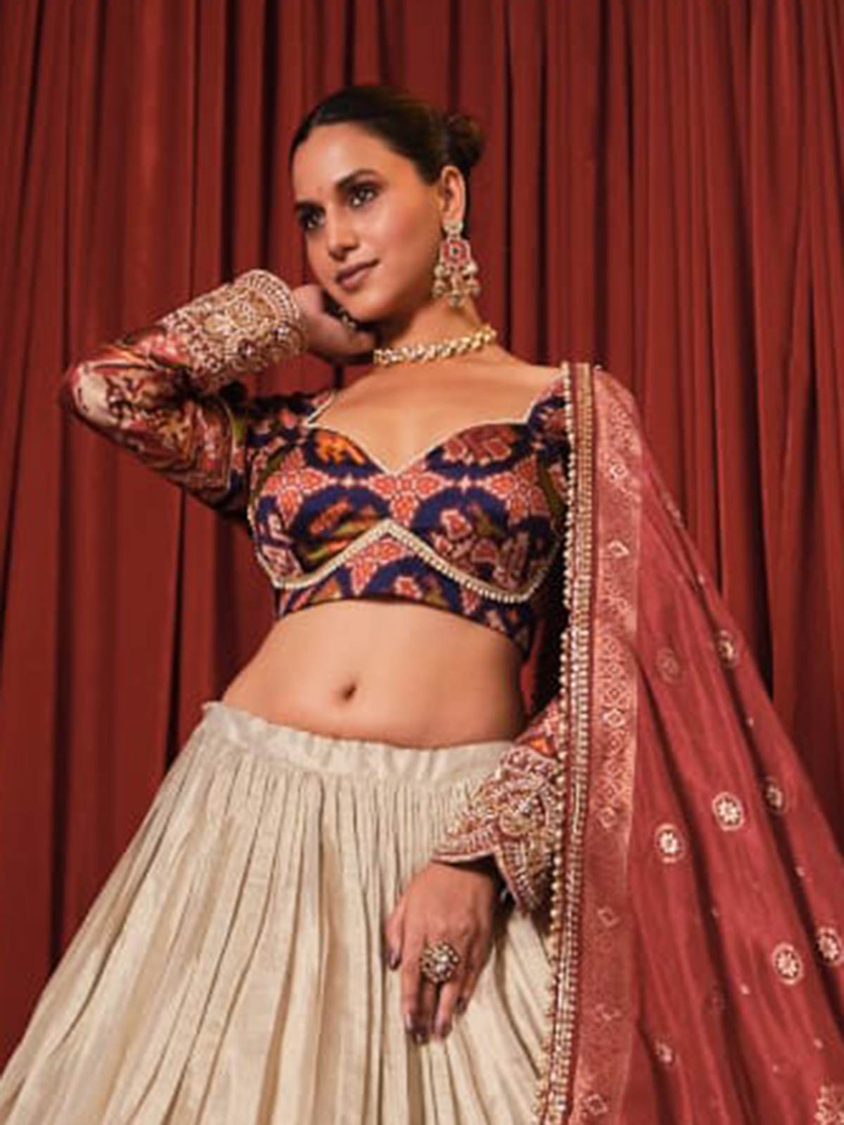 This cream silk lehenga choli is intricately embellished with cutdana, sequins, beads, zardosi and pearls work. Featuring a sweetheart neckline and full sleeves, it comes with a contrast blouse and dupatta, creating a luxurious bridal inspired ensemble for wedding and reception wear.