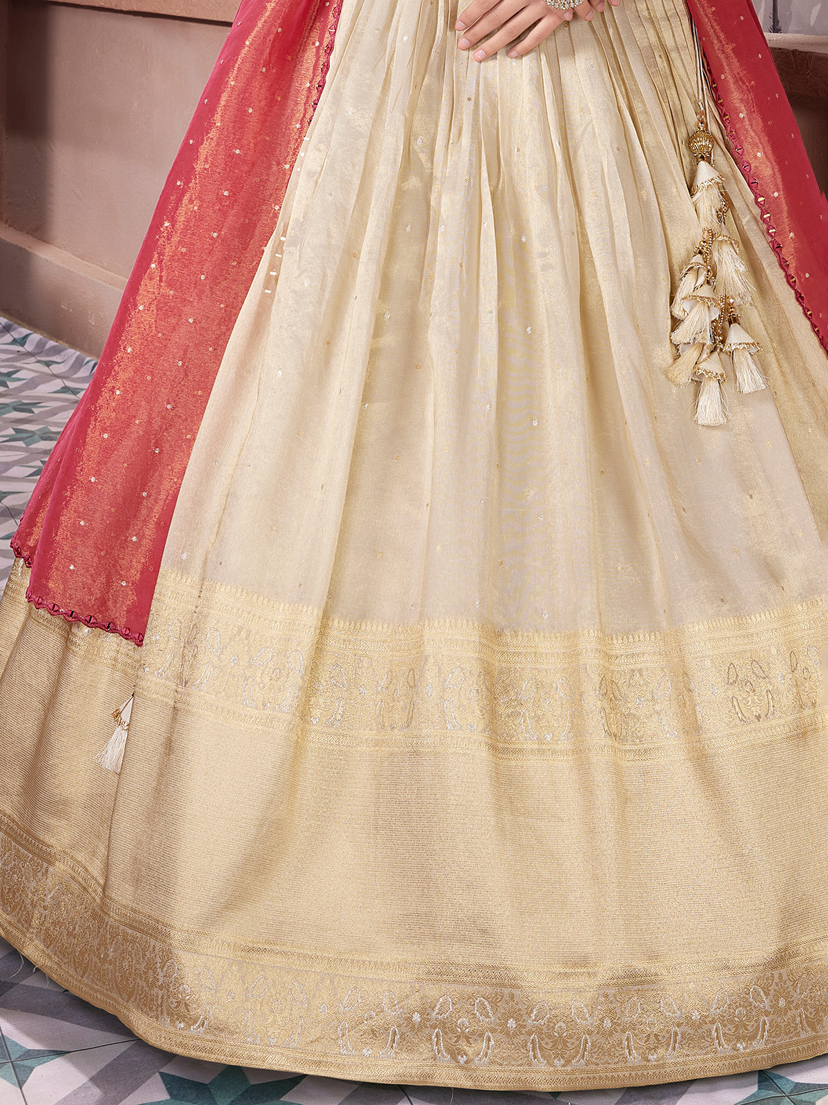 Cream Tissue Silk Designer Sweetheart Neck Lehenga Choli