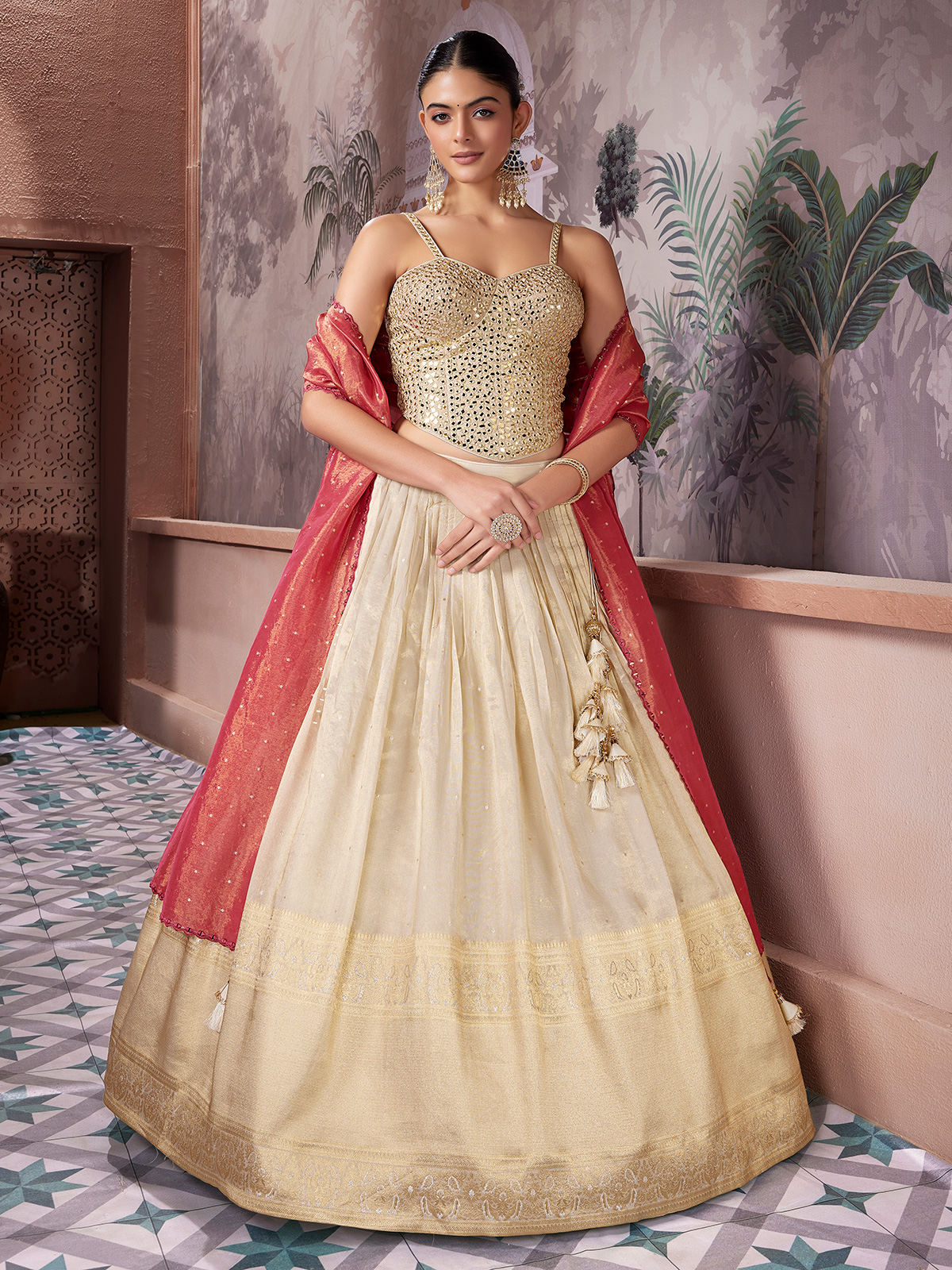 This cream tissue silk lehenga choli is beautifully accented with aabla and zari work. Paired with a contrasting dupatta for added elegance. The sweetheart neckline and sleeveless blouse create a refined festive silhouette, ideal for weddings, receptions and sophisticated sangeet functions.