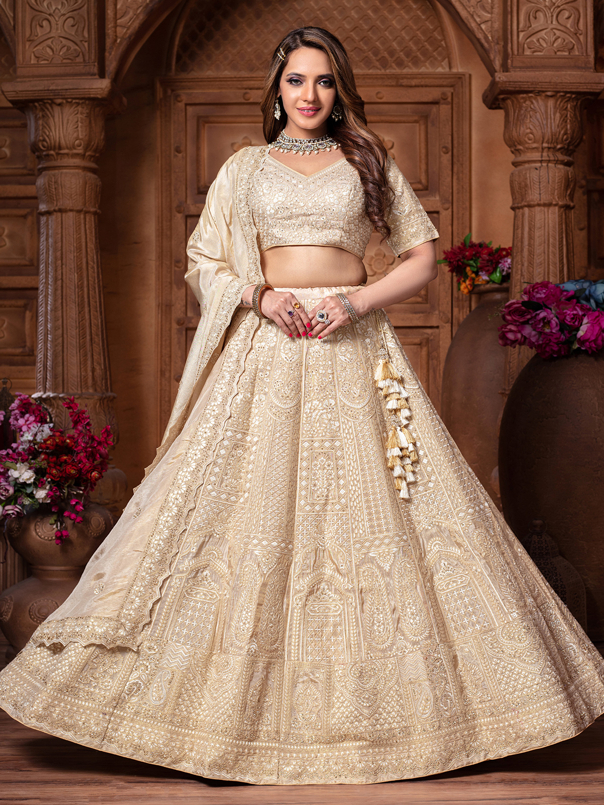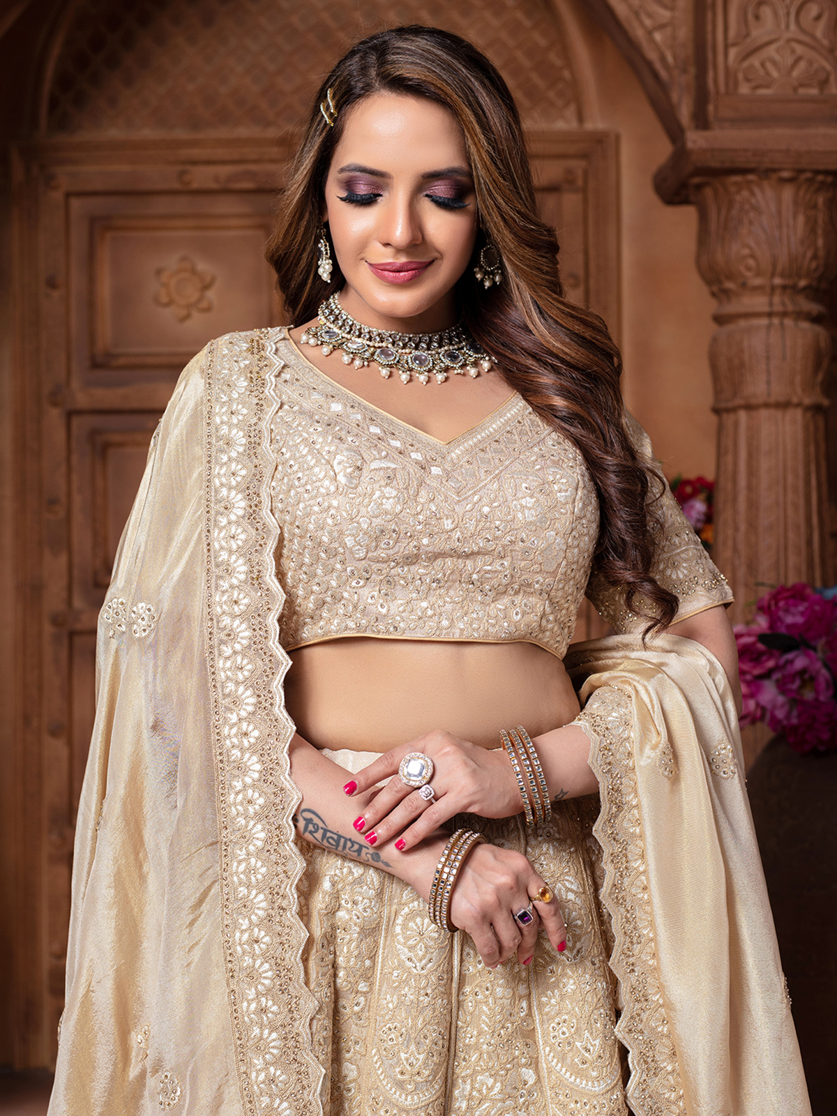 Elegant cream tissue silk lehenga choli adorned with intricate thread embroidery and diamond detailing. Featuring a V neckline, half sleeves, and paired with a delicate dupatta, it is perfect for bridal events, receptions, and elegant weddings.