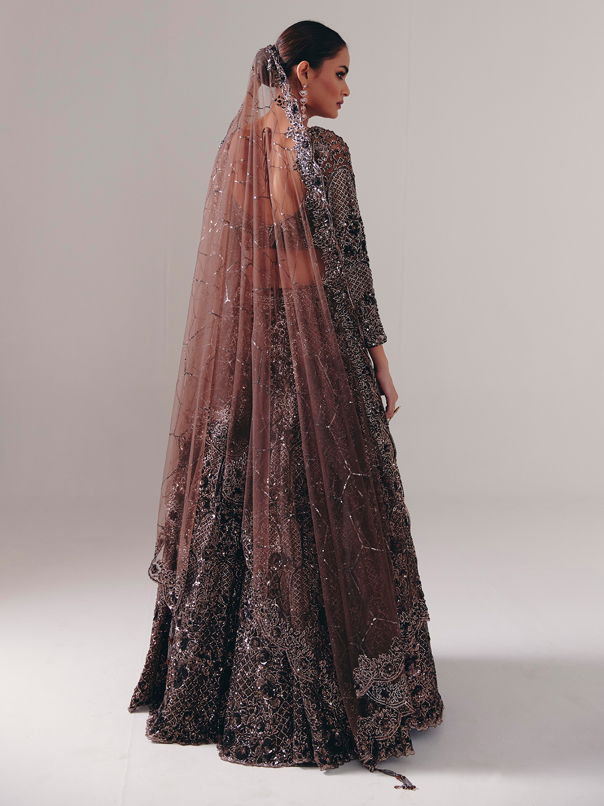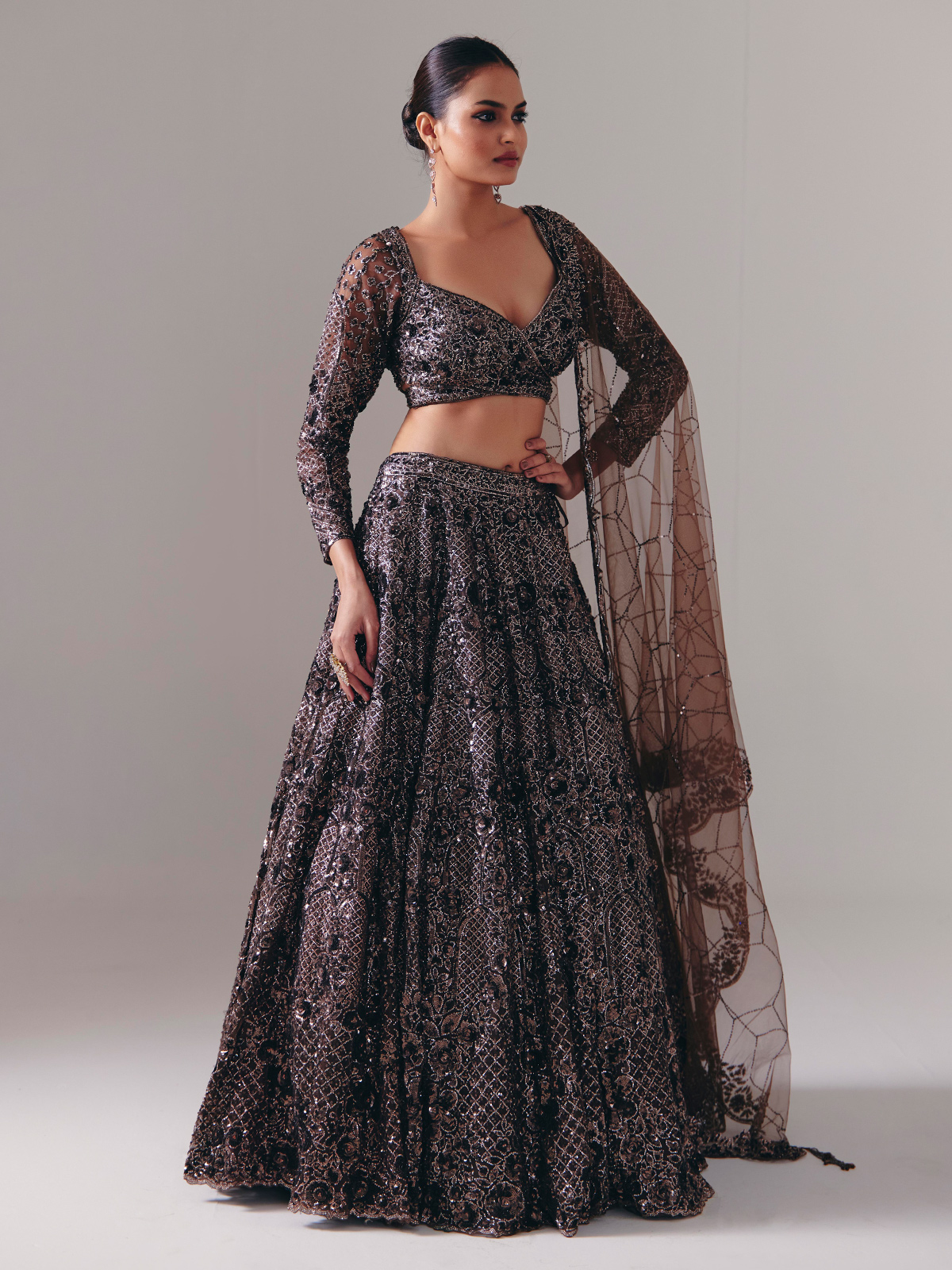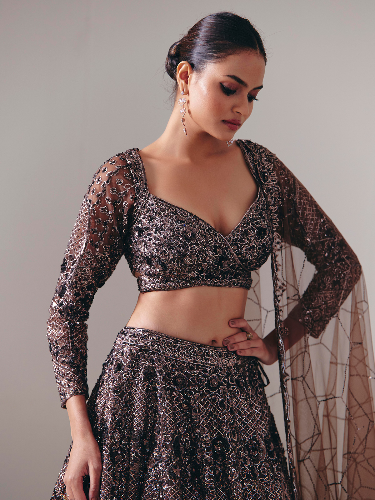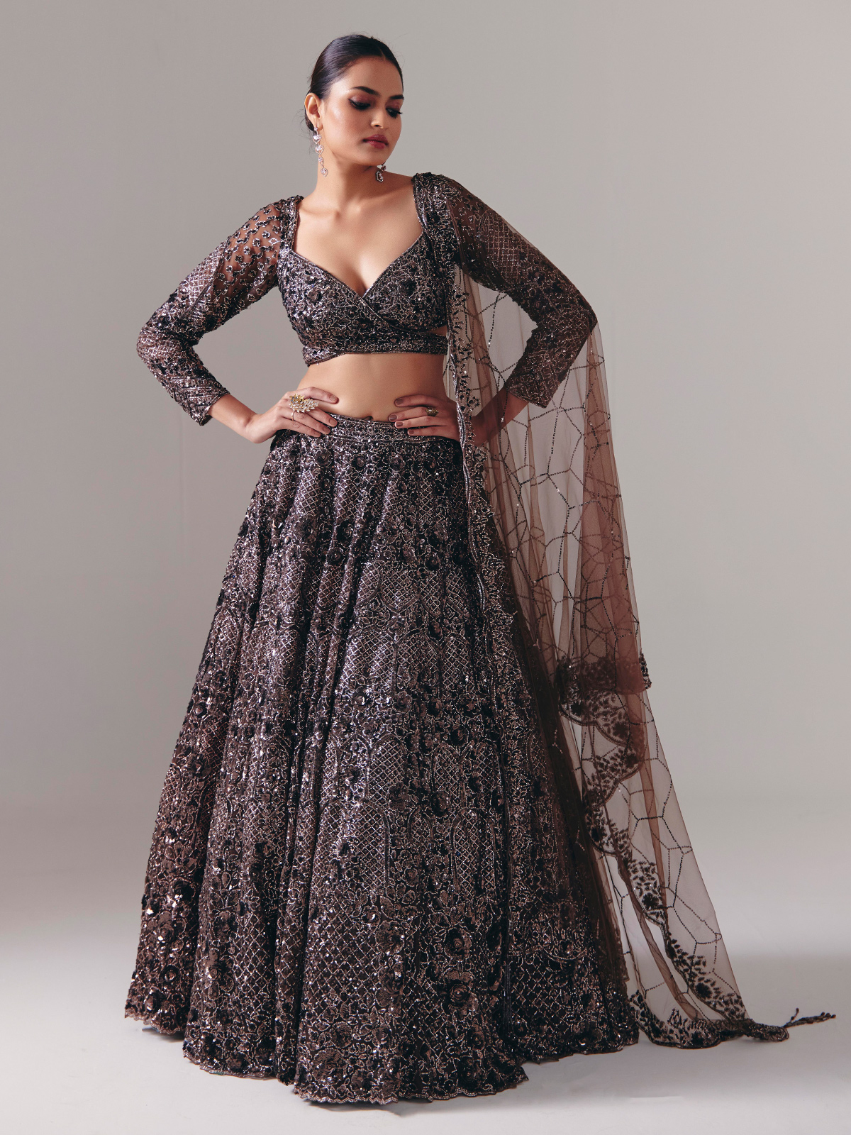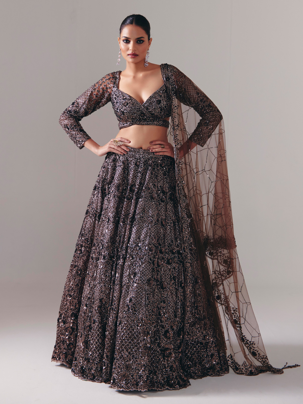 Exude refined elegance in this dark brown net lehenga choli with dupatta. Adorned with cutdana, sequins, beads, and diamond accents, its sweetheart neckline and quarter sleeves bring a sophisticated charm, ideal for weddings, receptions, and festive celebrations.