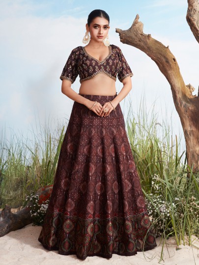 Dark Brown Silk Lehenga Choli With Rich Printed Patterns