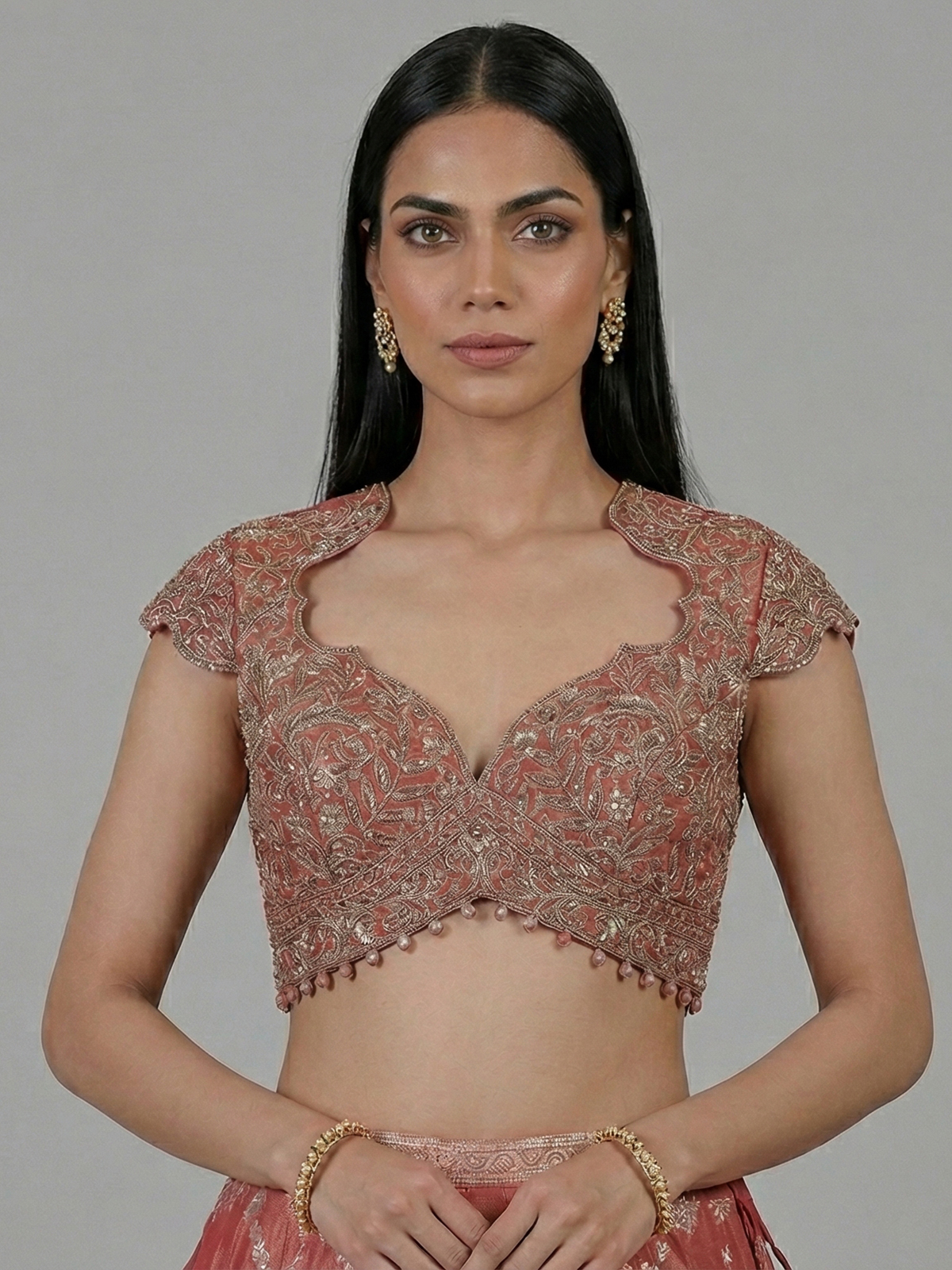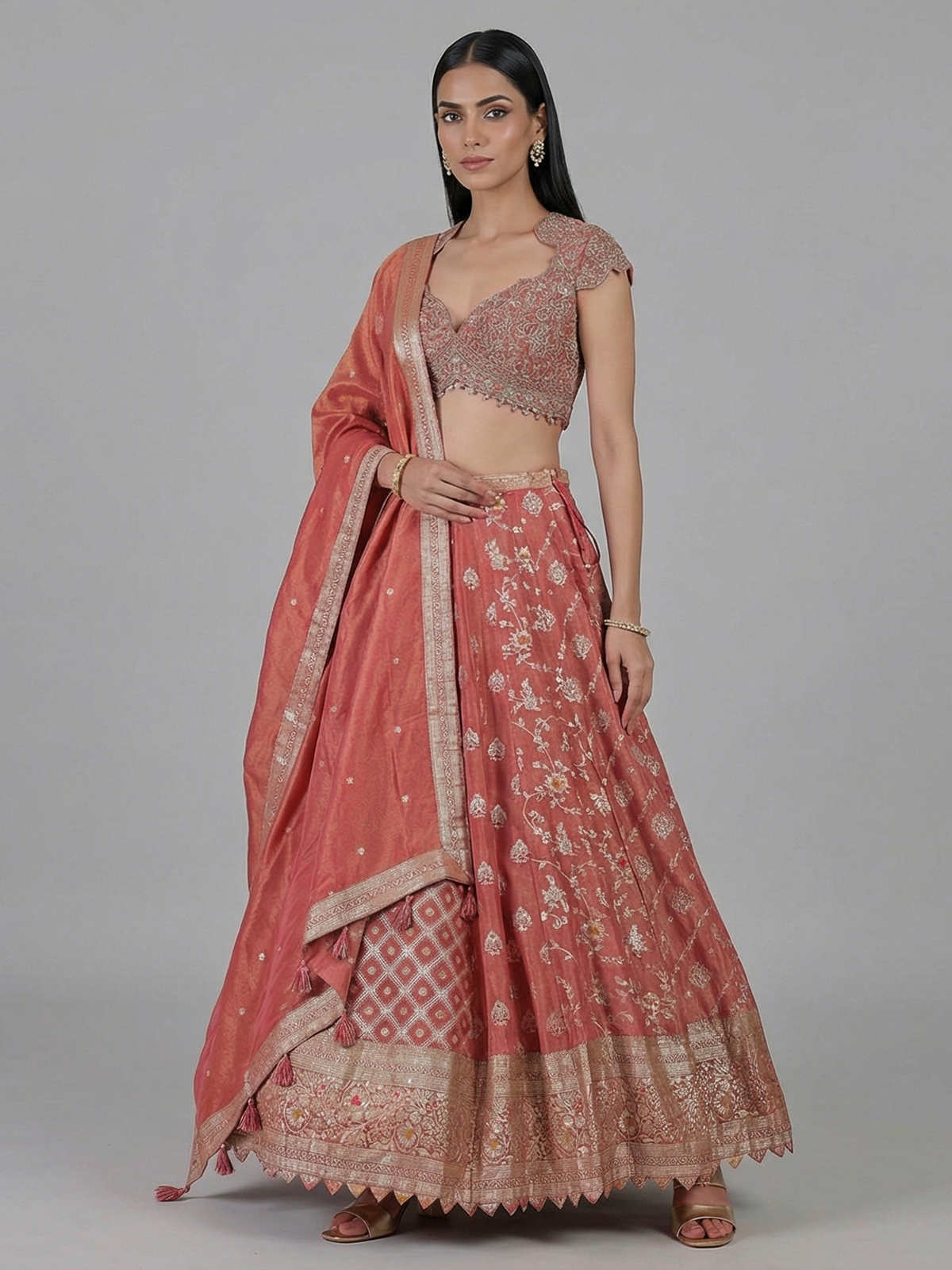 Warm and graceful dark peach banarasi silk lehenga choli. Showcases rich resham, sequins, cutdana, zari, stone and zardosi work. Styled with a sweetheart neckline and cap sleeves. It blends tradition with modern charm. Paired with a lehenga and dupatta. It is ideal for weddings, receptions and festive celebrations.
