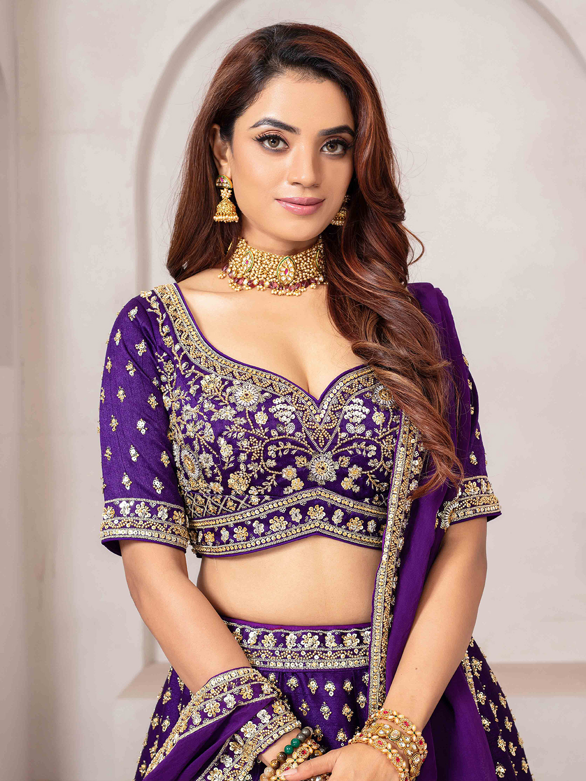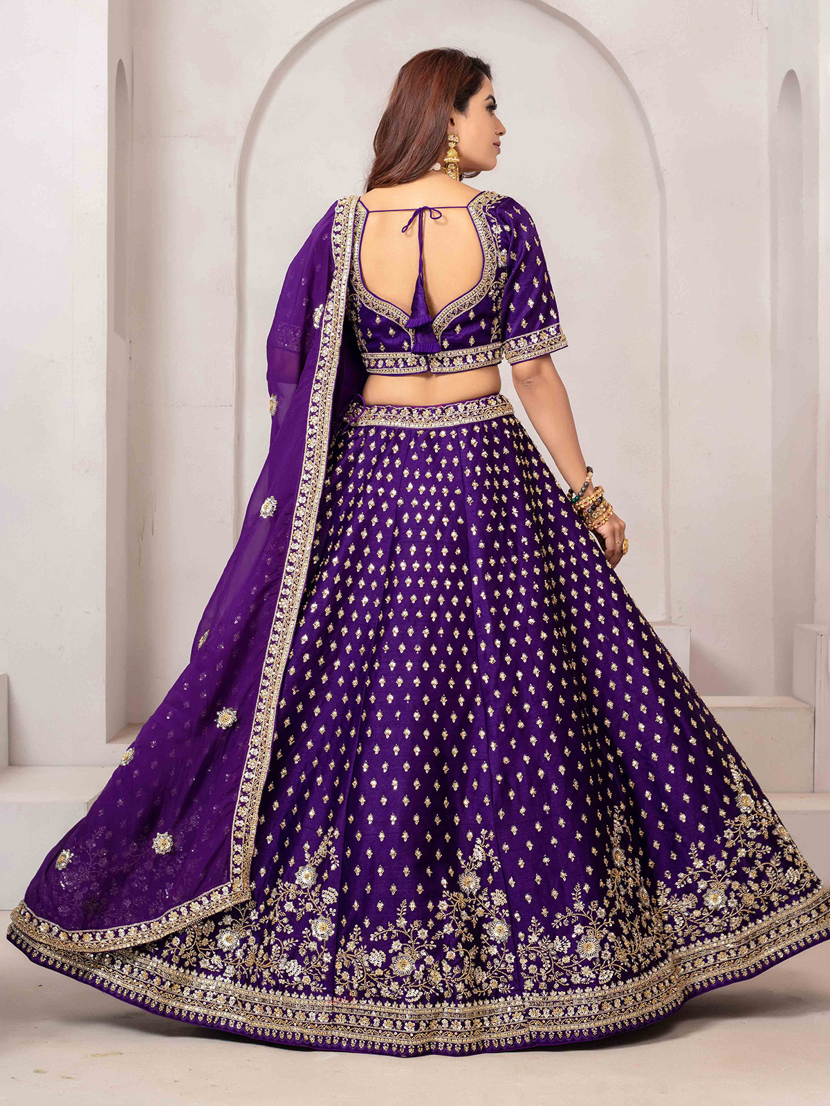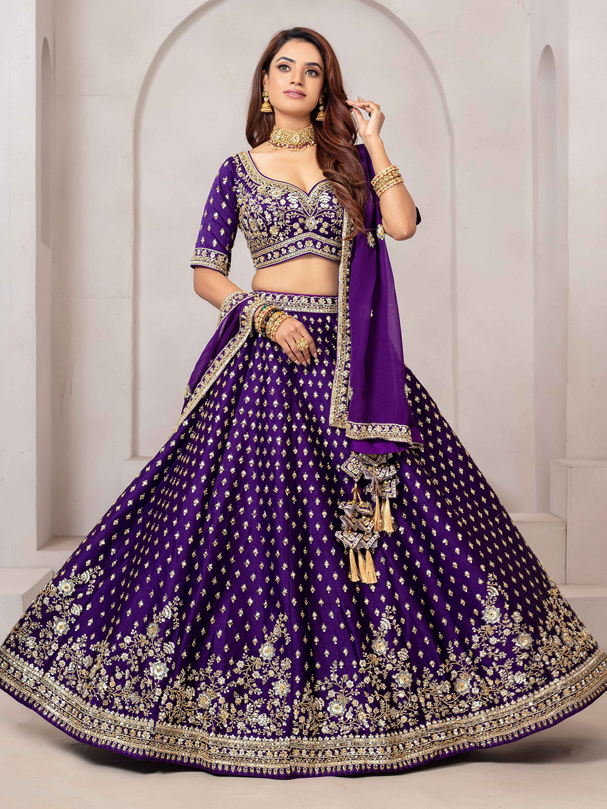 Deep purple raw silk lehenga choli adorned with luxurious cutdana, sequins, and bead work. Styled with a sweetheart neckline, elbow sleeves, and paired with a dupatta, it is ideal for receptions or evening weddings.