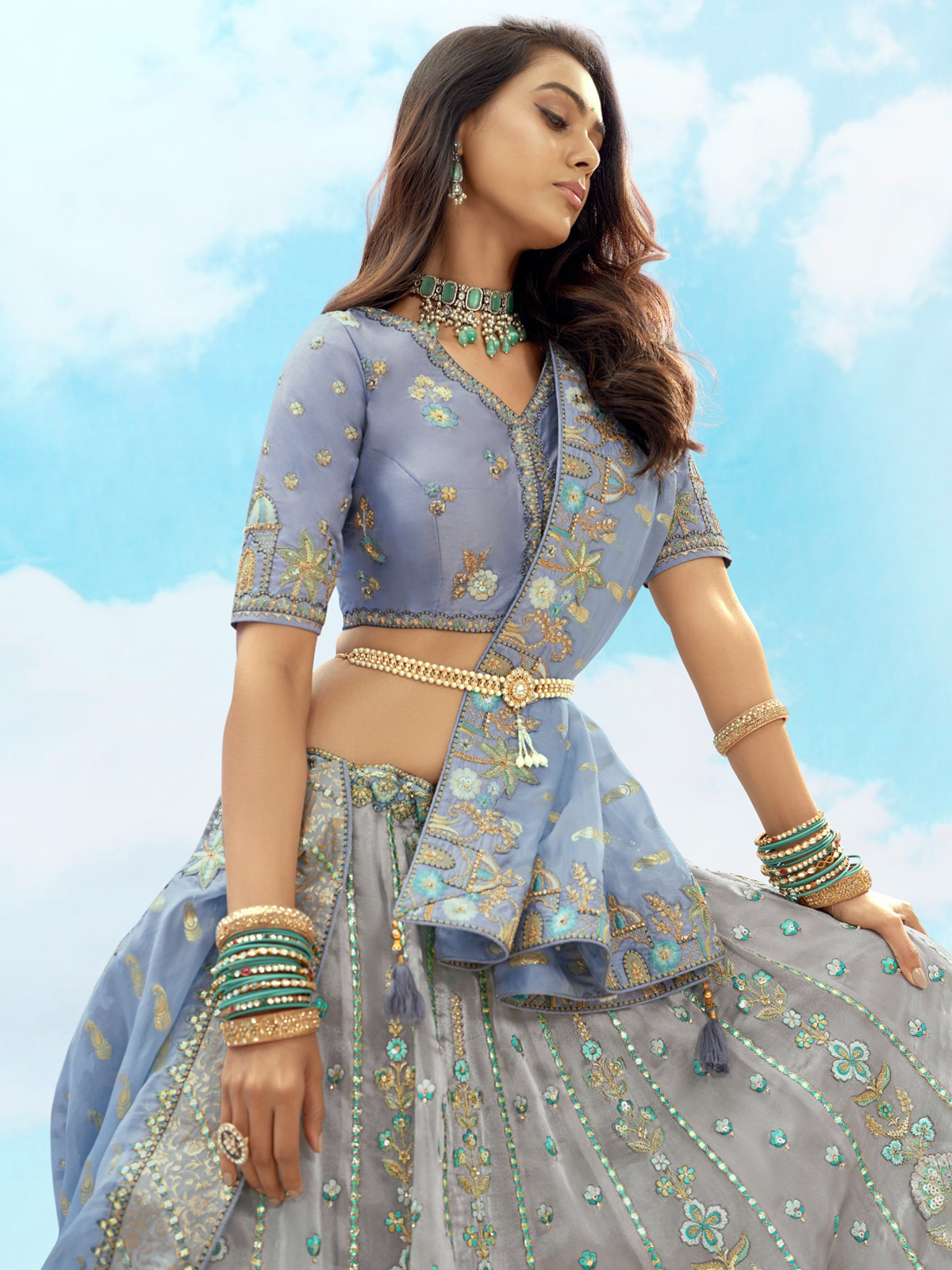 Radiate refined elegance with our luxurious grey silk unstitched lehenga choli, featuring impeccable cutwork, stone, sequins, and embroidery work. Paired with a stylish dupatta.