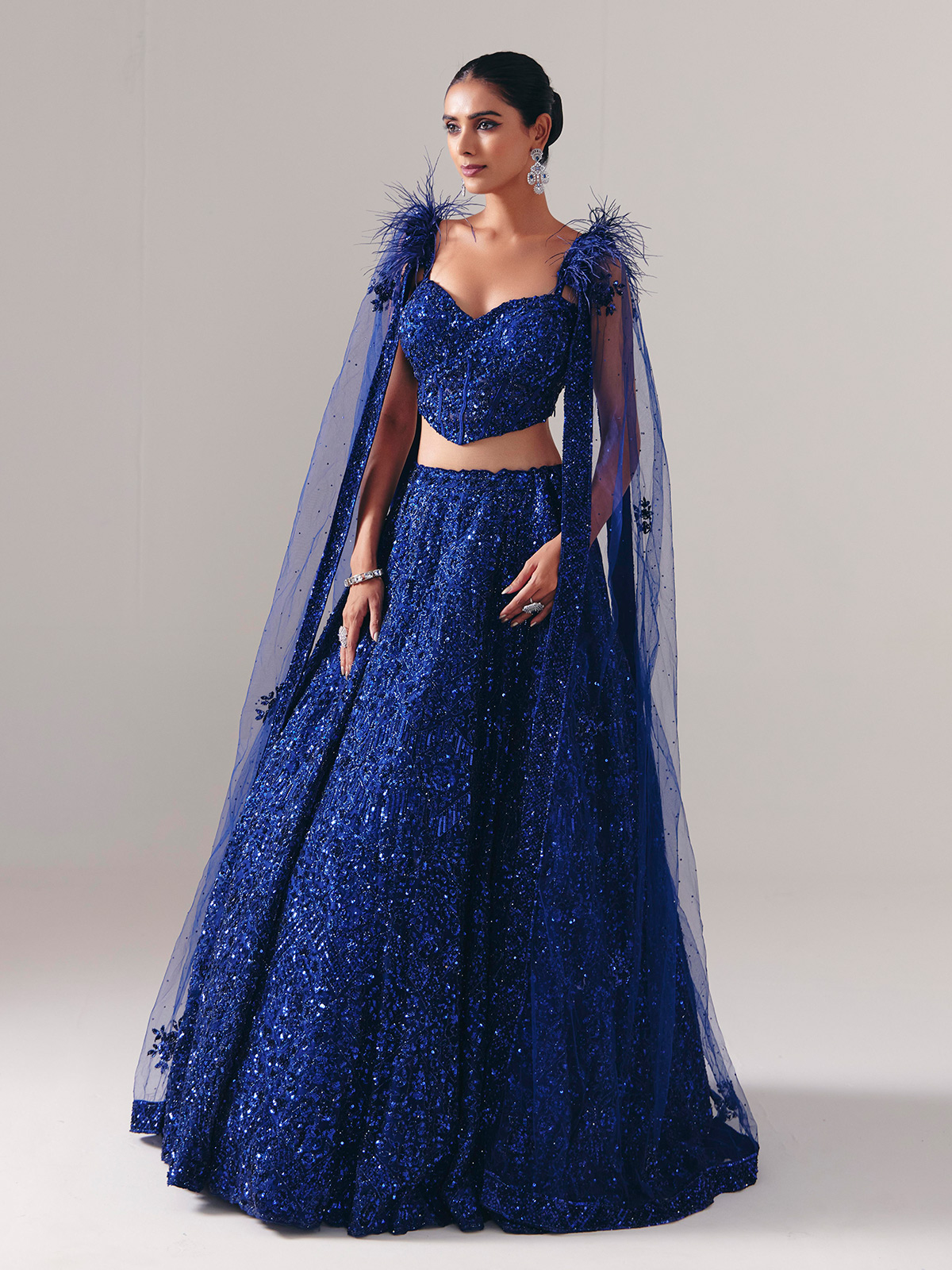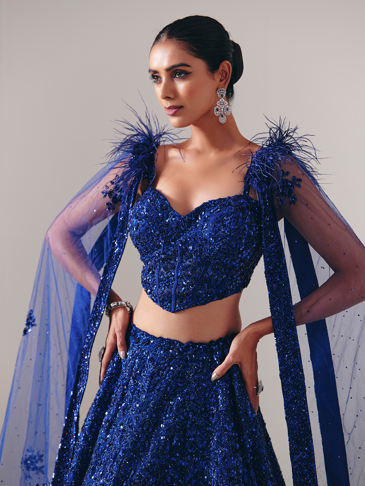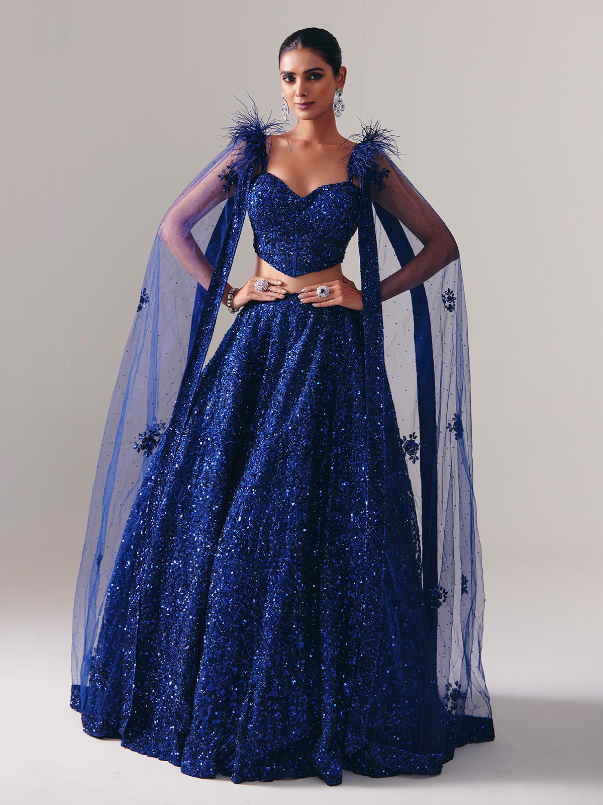 A designer creation in luminous blue net, this lehenga choli glitters with sequins and stone embellishments. Styled with a sweetheart neckline, it reflects light beautifully, making it the perfect attire for weddings, receptions, and party wear filled with grandeur.