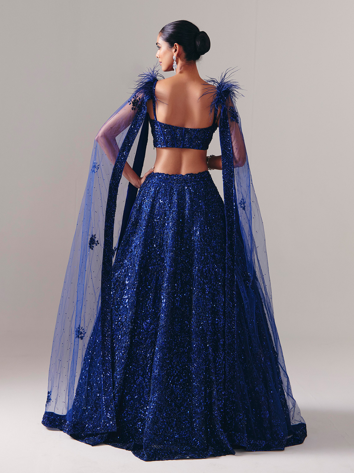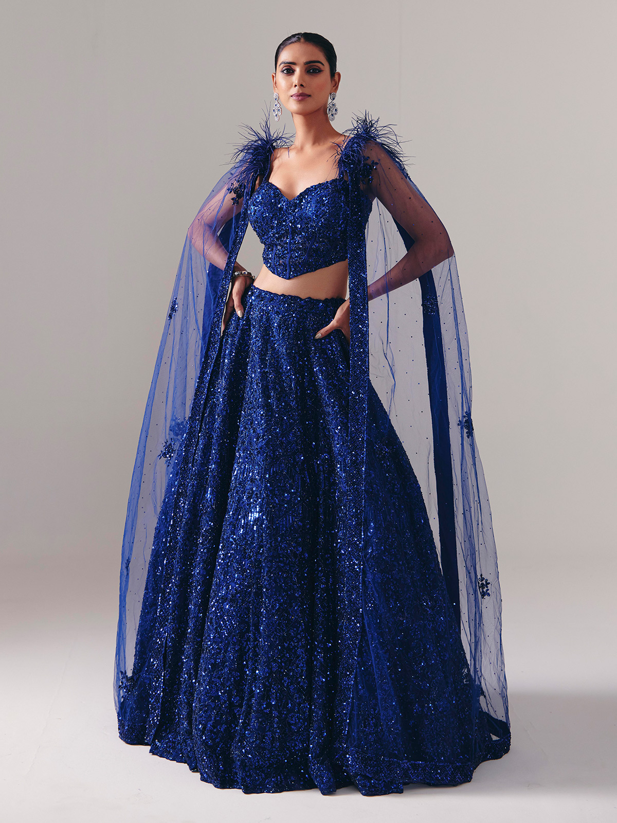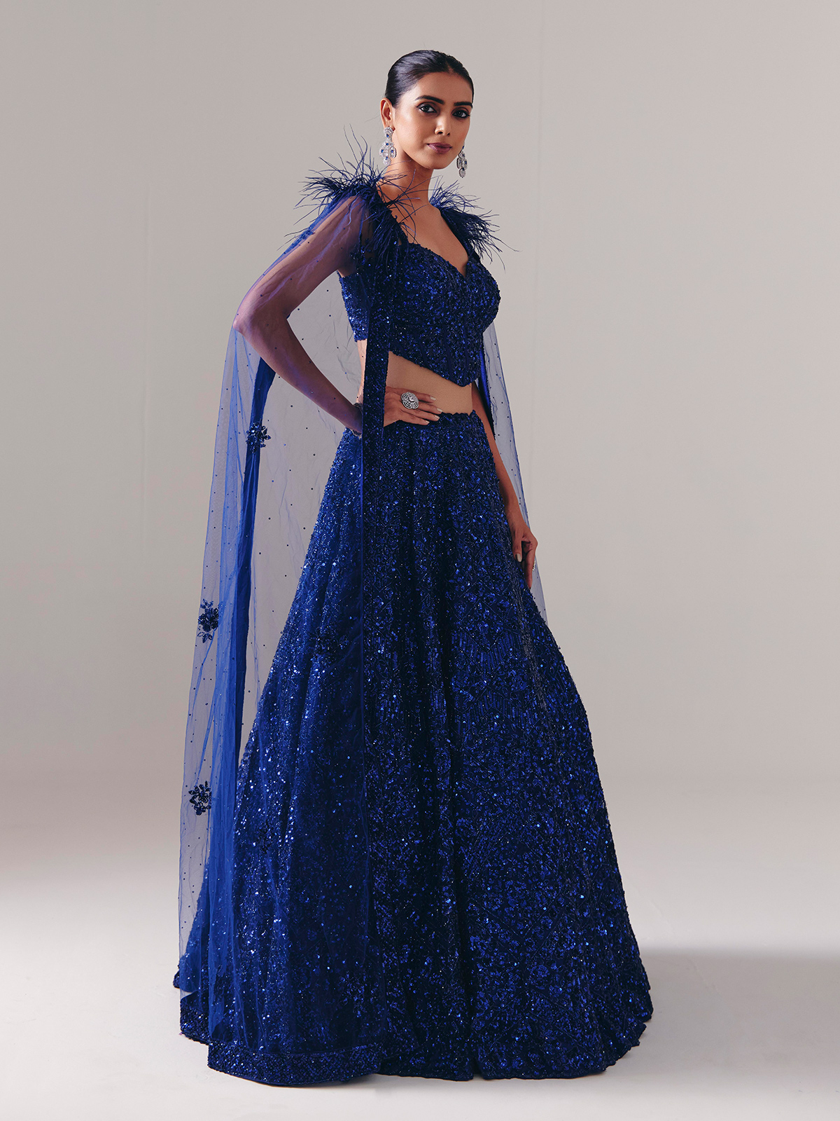 A designer creation in luminous blue net, this lehenga choli glitters with sequins and stone embellishments. Styled with a sweetheart neckline, it reflects light beautifully, making it the perfect attire for weddings, receptions, and party wear filled with grandeur.