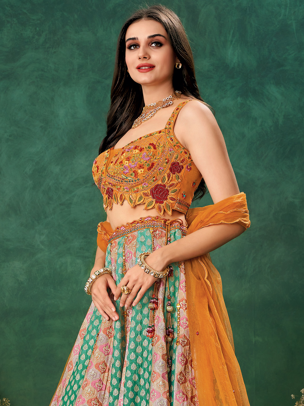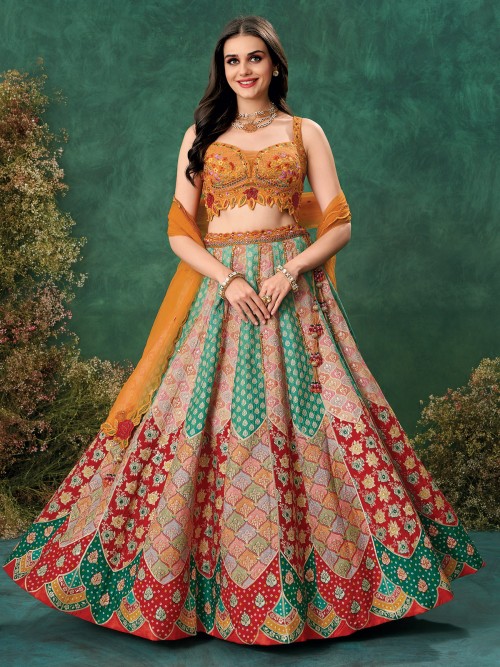 Designer Multicolor Lehenga Crafted In Soft Raw Silk