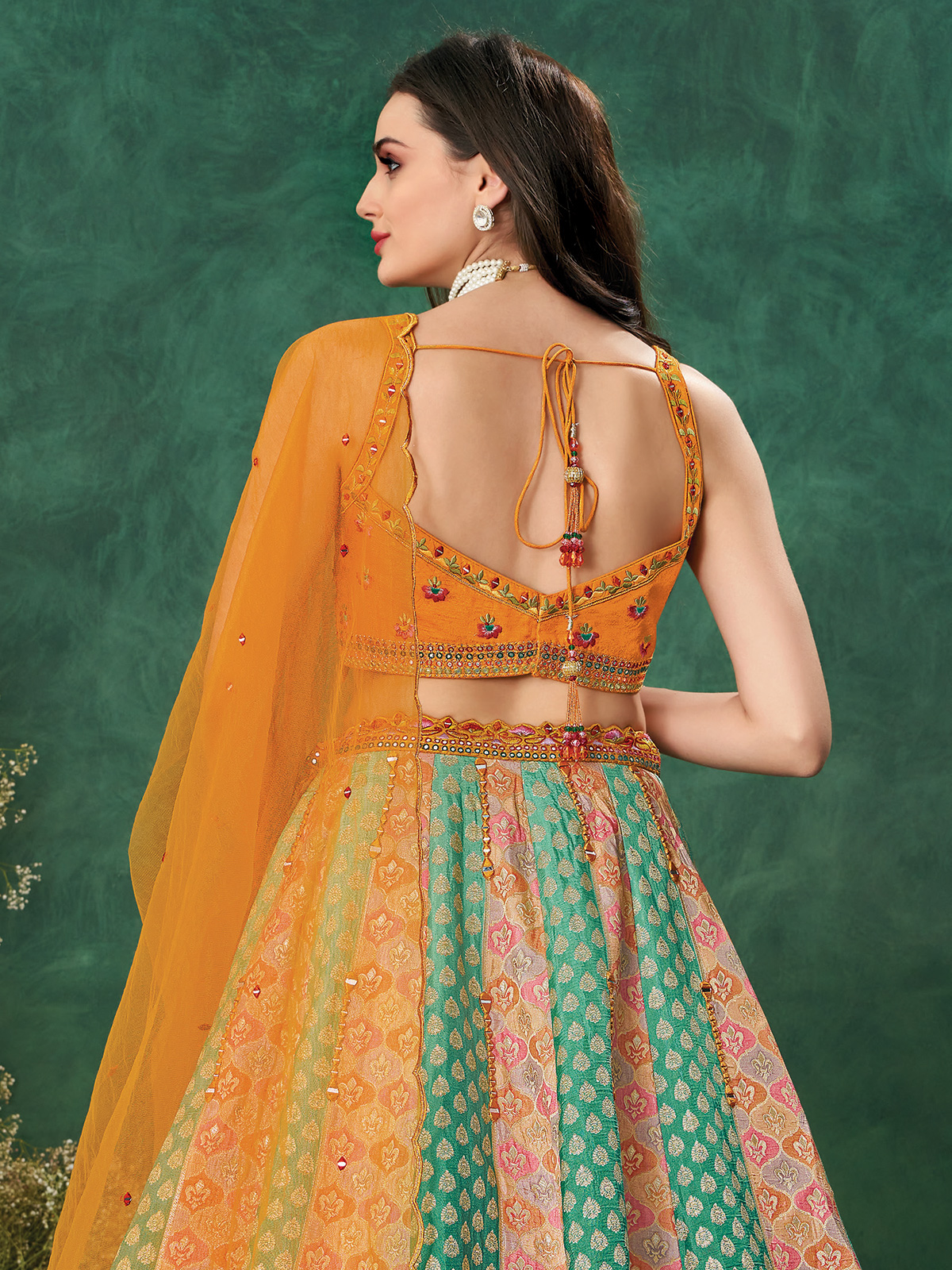 Brighten your wedding wardrobe with this multicolored raw silk lehenga choli. Exquisite embroidery, mirror, and zari detailing spread across the fabric lend it a luxurious appeal. The sleeveless blouse and net dupatta complete the ethnic elegance of this ensemble.