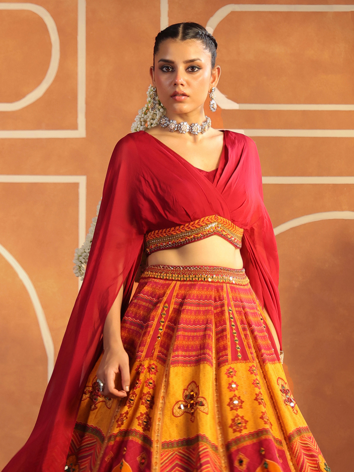Romantic in reddish pink, this silk printed lehenga choli features a U neckline. Aabla, sequins, beads, cutdana, and thread detail shimmer gracefully. Ideal for weddings, it radiates charm and festive artistry.