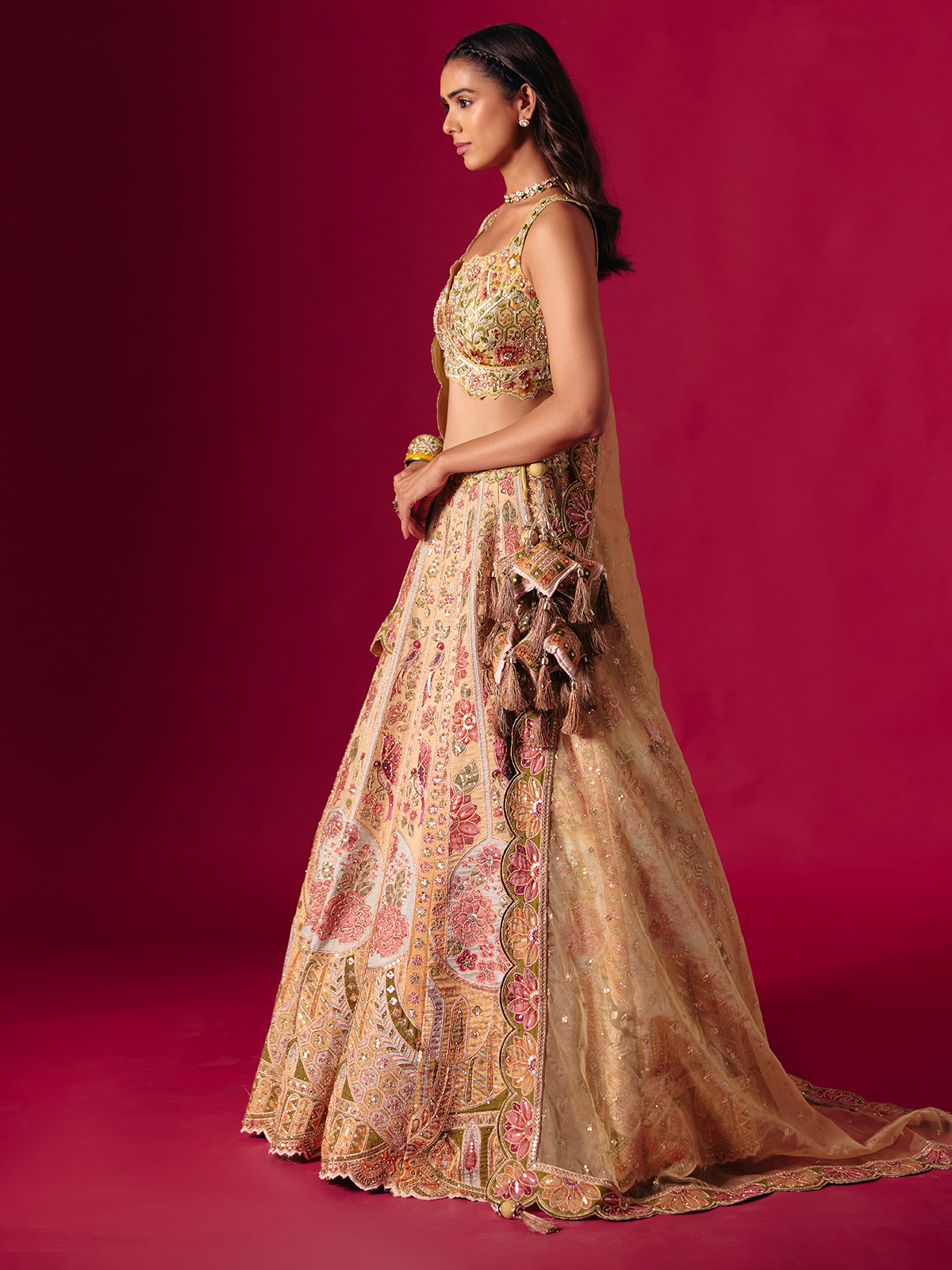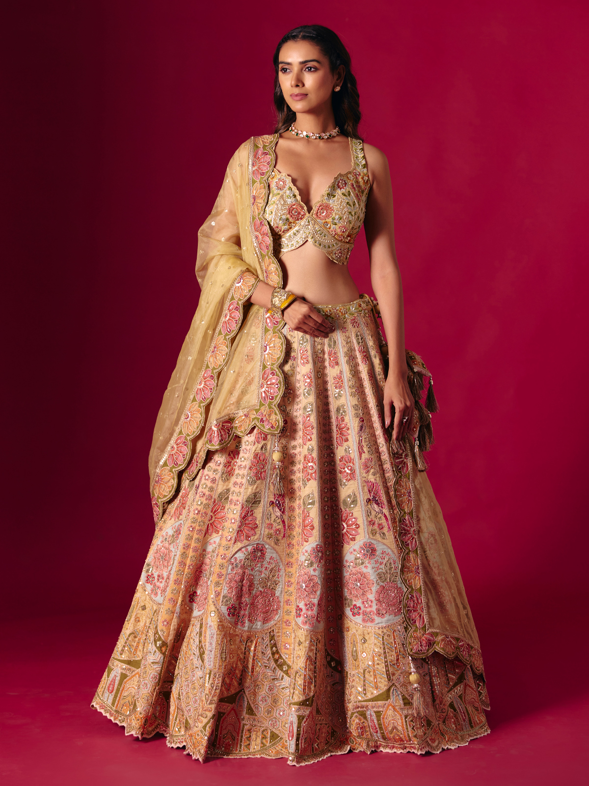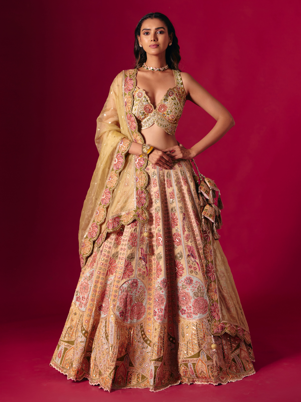This dusty yellow silk lehenga choli glows with intricate embroidery, cutdana, sequins, zardosi, diamond and resham detailing. The sleeveless sweetheart neckline adds feminine grace, paired with a coordinating dupatta for a festive, bridal ready ensemble perfect for weddings, sangeet evenings and reception functions.