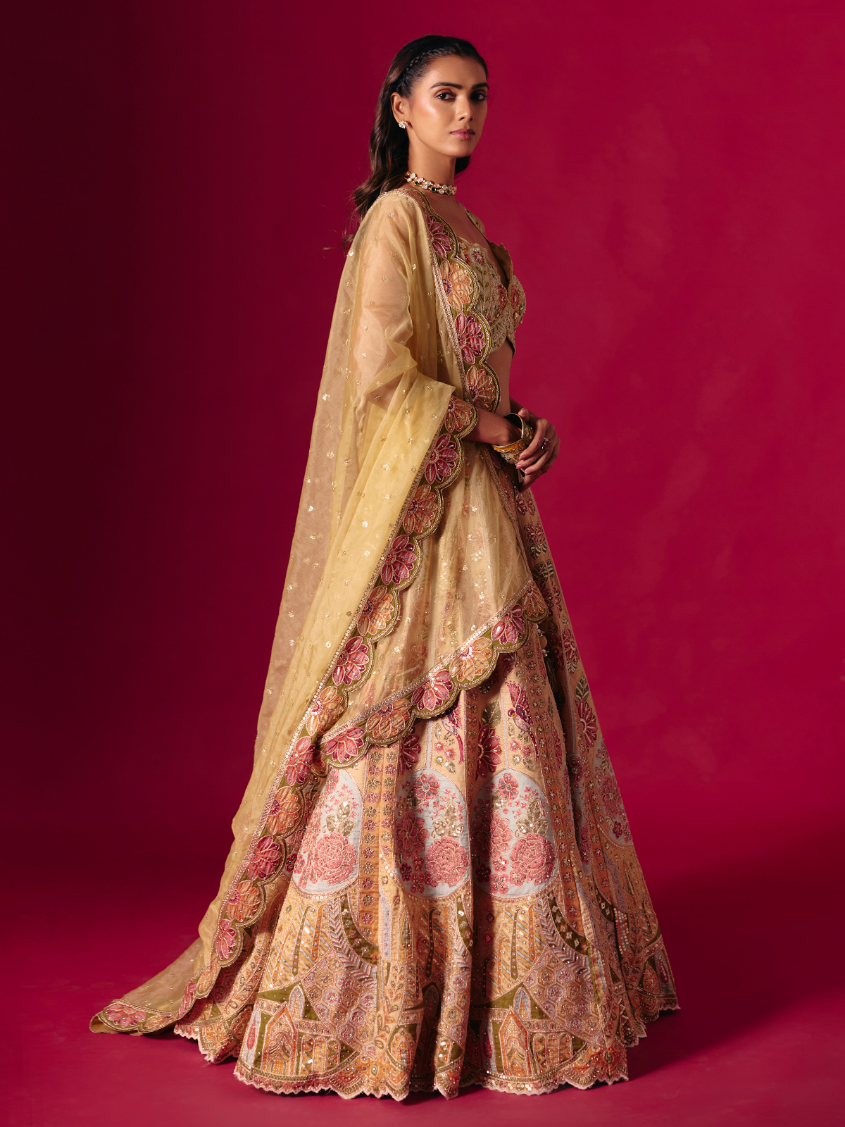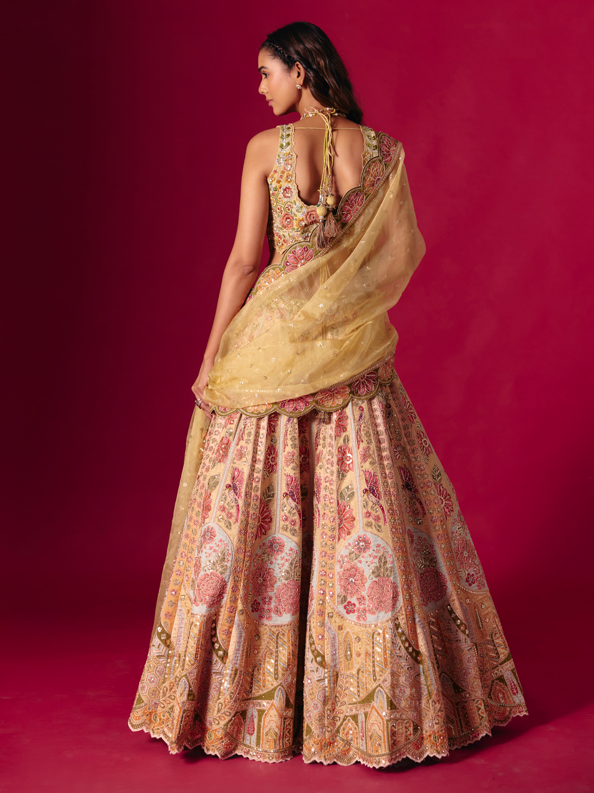 This dusty yellow silk lehenga choli glows with intricate embroidery, cutdana, sequins, zardosi, diamond and resham detailing. The sleeveless sweetheart neckline adds feminine grace, paired with a coordinating dupatta for a festive, bridal ready ensemble perfect for weddings, sangeet evenings and reception functions.