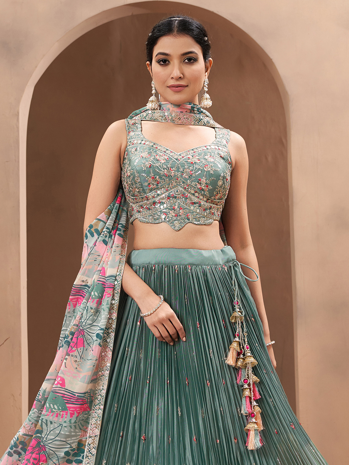 Embrace regal elegance with this mint green silk lehenga choli, adorned with delicate embroidery, sparkling sequins, rich zari and intricate aabla accents. The stitched blouse and matching dupatta complete this majestic ensemble, ideal for weddings, festive ceremonies and grand cultural celebrations.