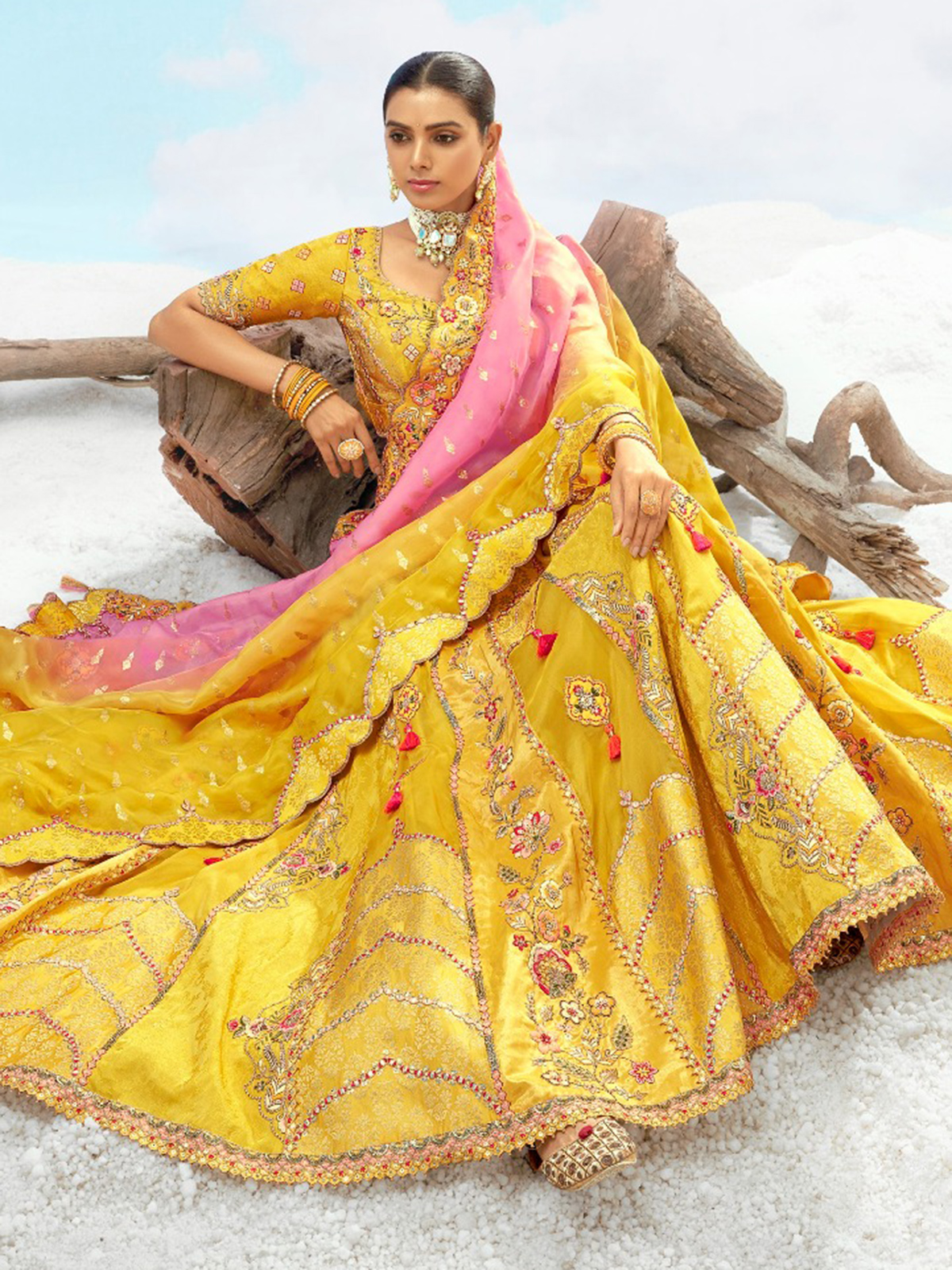 Reveal your regal side with this elegant mustard yellow silk unstitched lehenga choli, enriched with stunning cutwork, stone, sequins, and embroidery detailing. Comes with a beautiful dupatta.