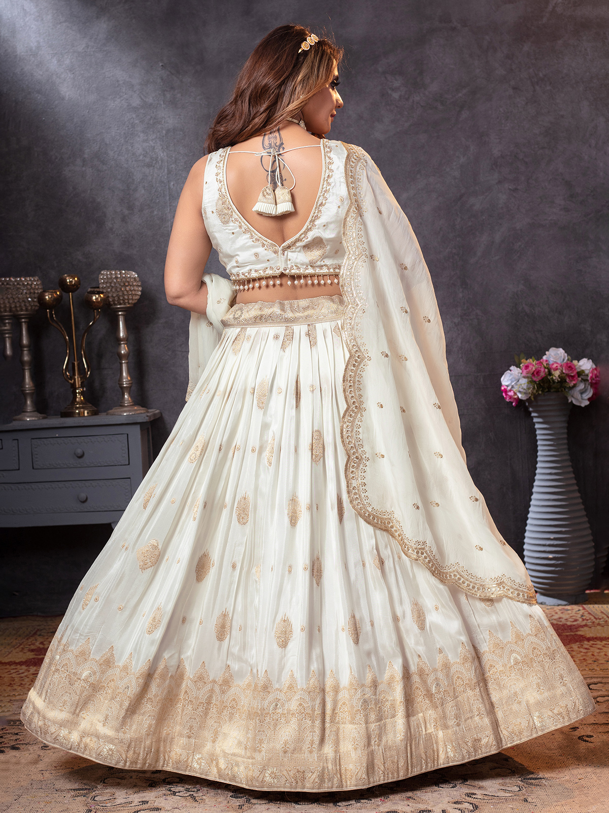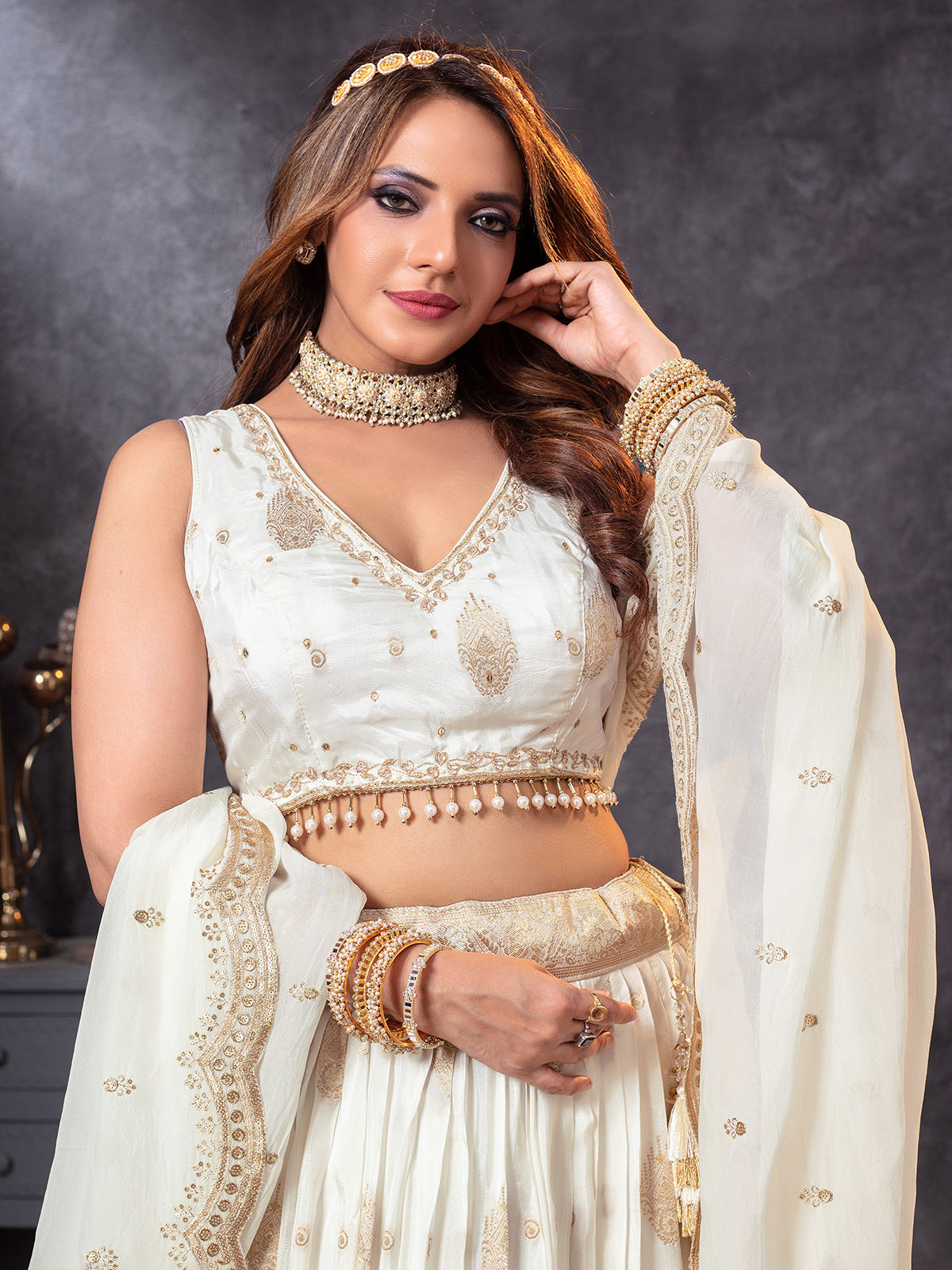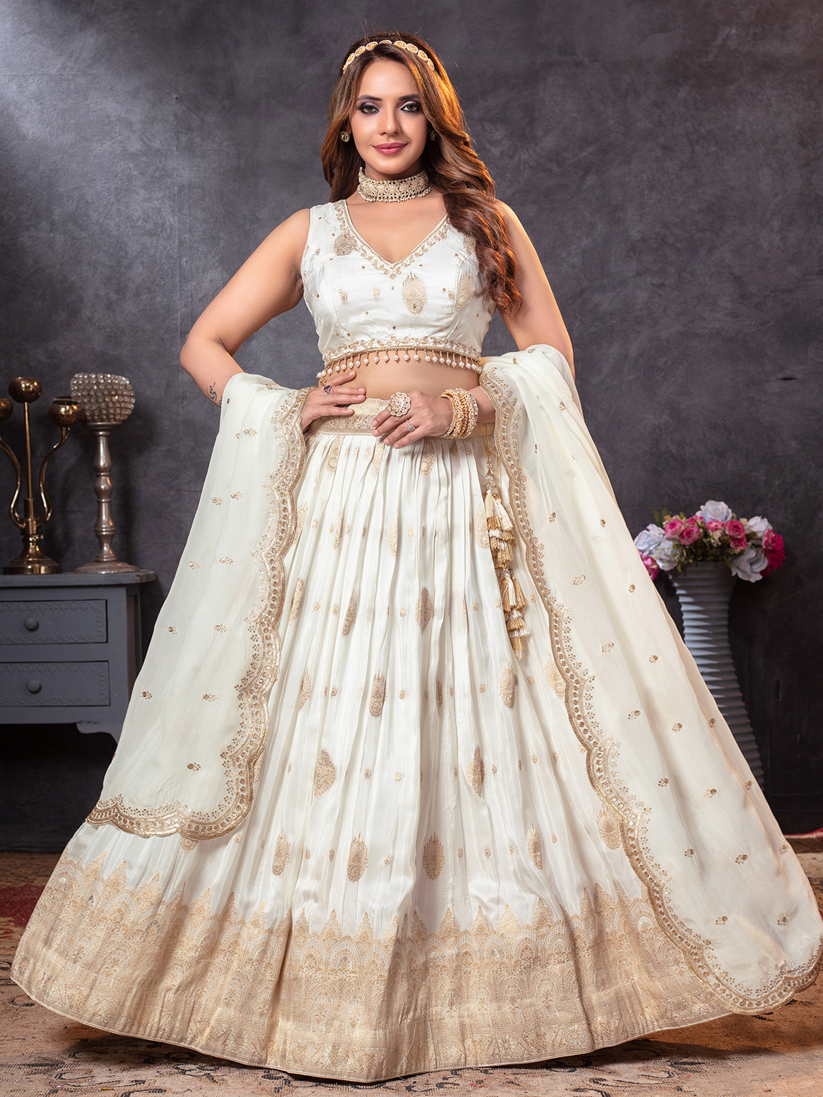 Elegant Off White Crepe Silk Traditional Lehenga Choli