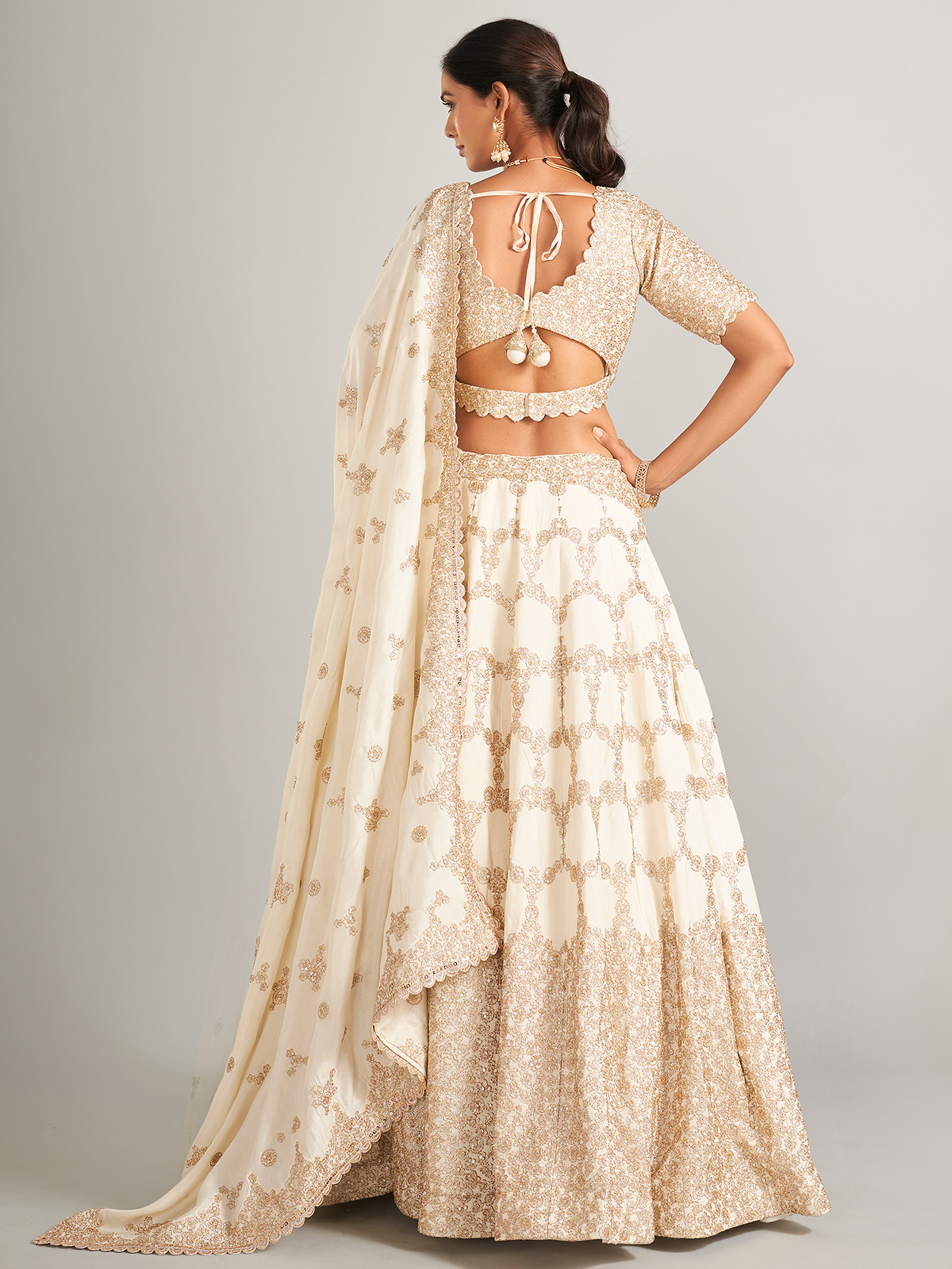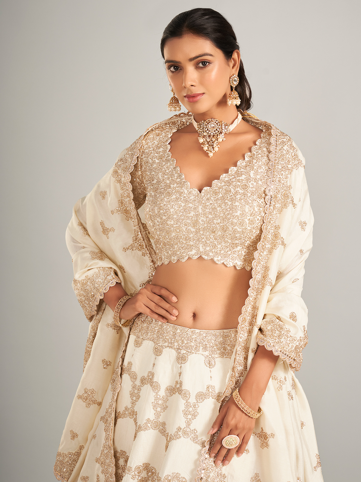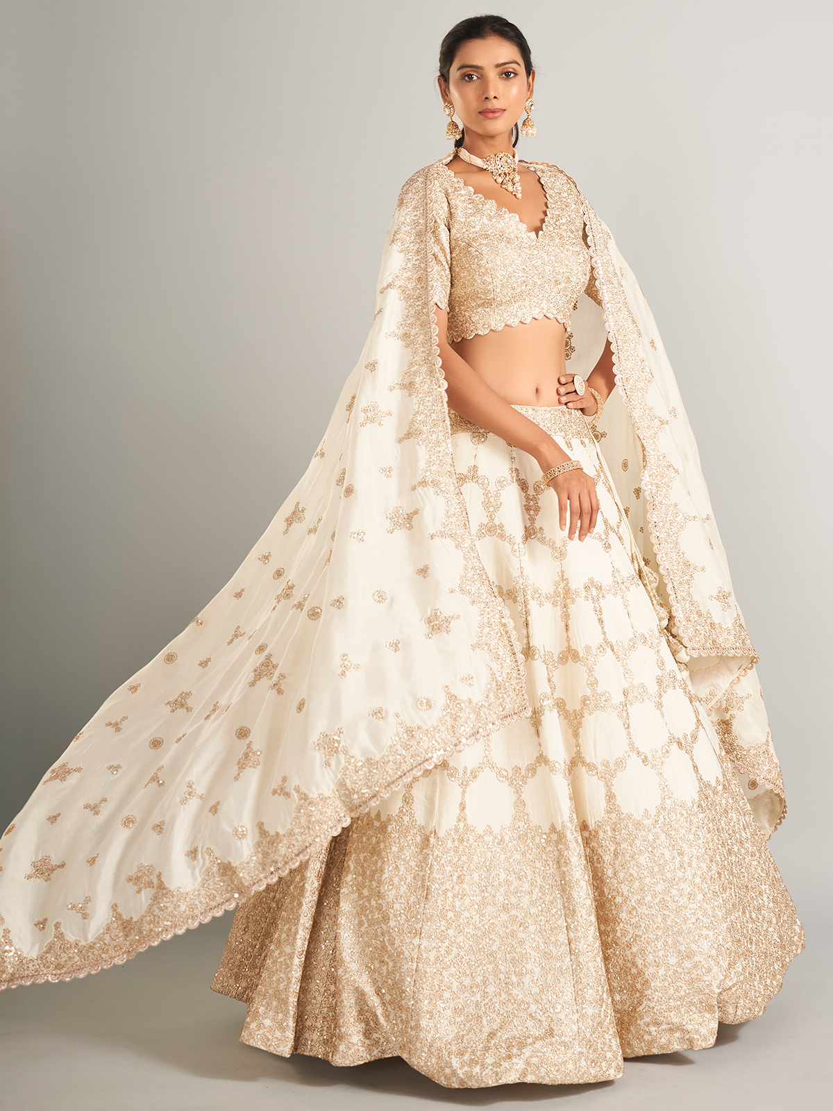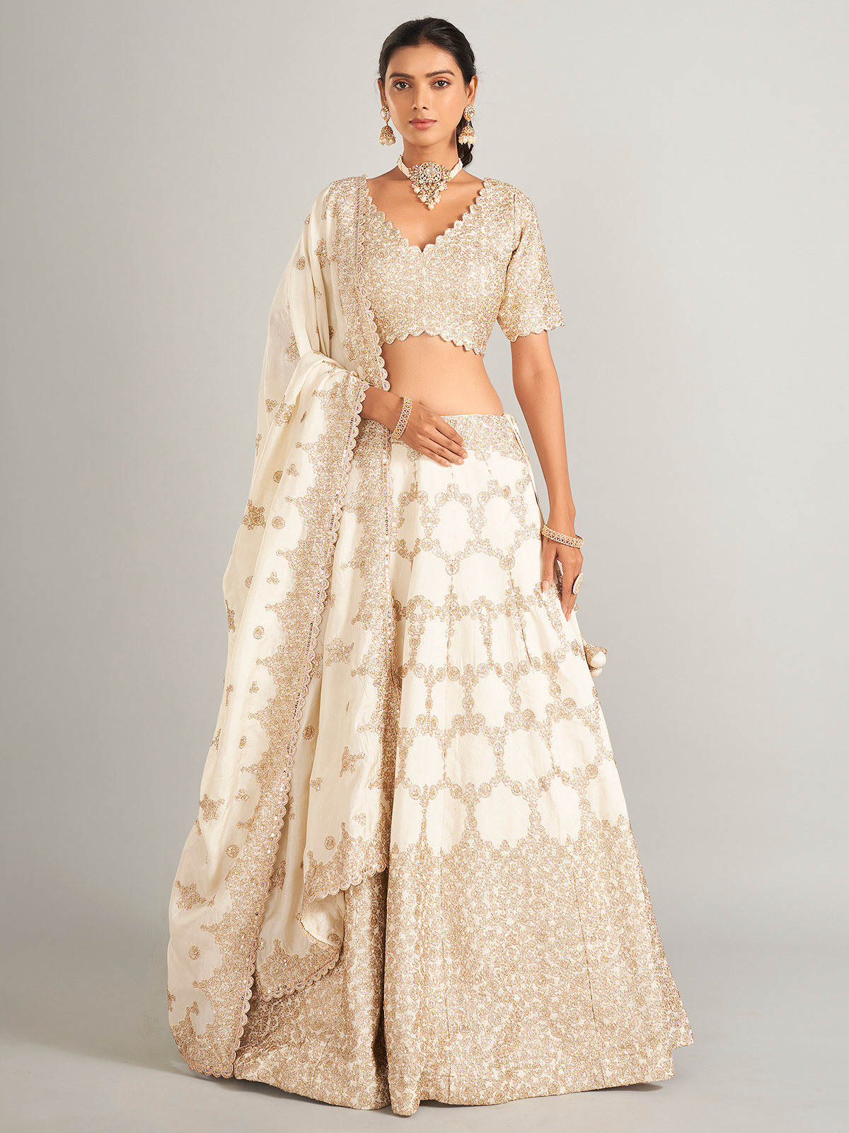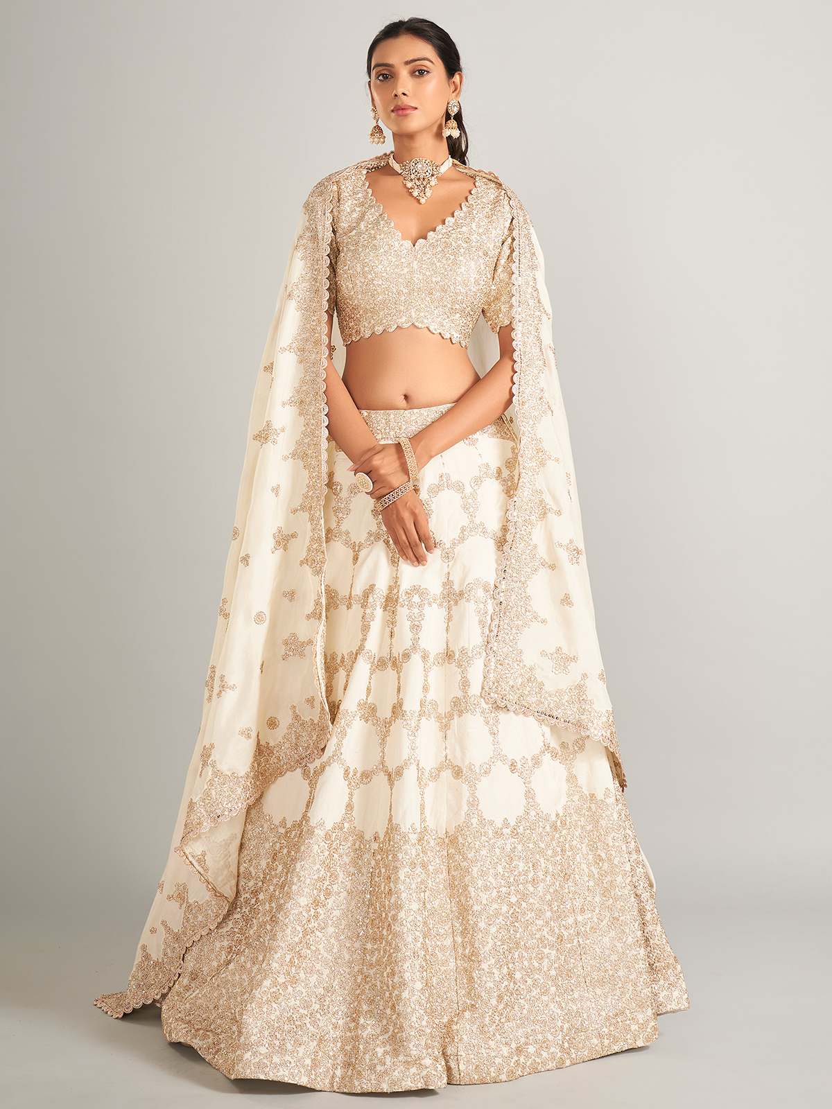 The off-white lehenga choli is a stunning example of how to blend refinement and charm. It is made of raw silk, with a V neck, half sleeves, choli, and a dupatta. It is adorned with resham and sequins and is appropriate for a variety of occasions.