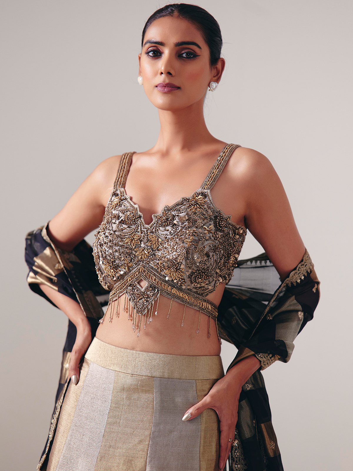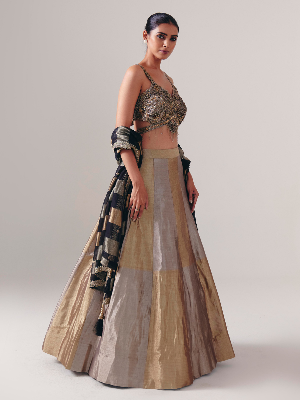 Shimmering with festive charm, this gold and silver silk lehenga choli is adorned with exquisite cutdana, sequins, beads and pearl embellishments. The sleeveless choli with a graceful sweetheart neckline enhances its elegance, while the coordinated dupatta completes the look—perfect for weddings, receptions and glamorous party celebrations.