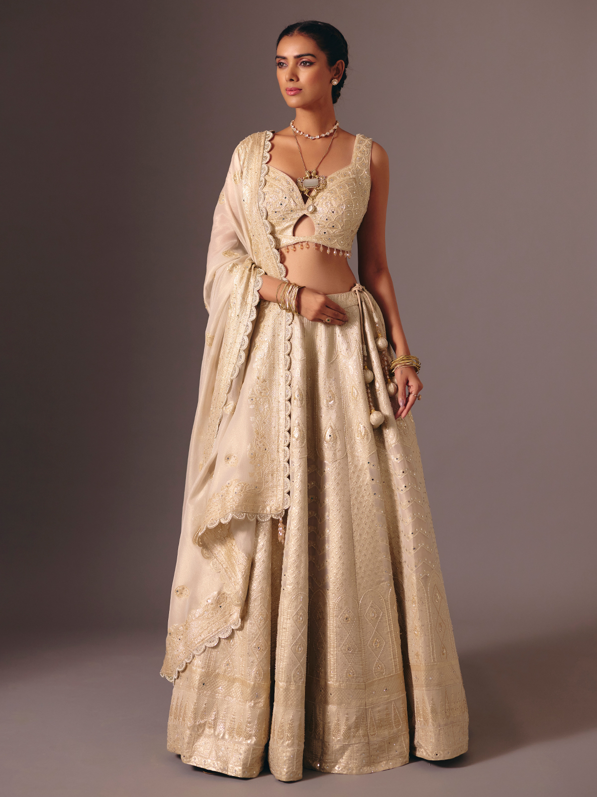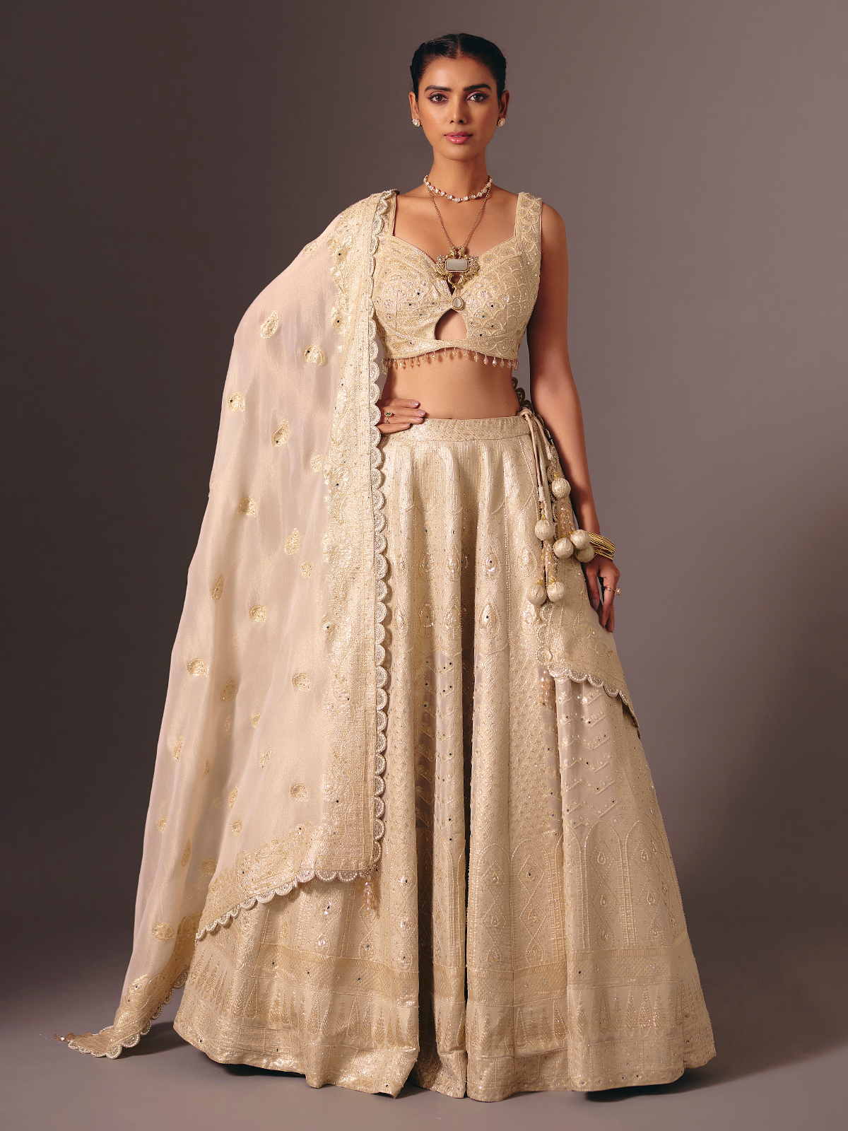 Regal in gold Banarasi tissue silk lehenga choli shimmers with cutdana, mirror, stone, diamond and zari detailing. Featuring a sweetheart neckline and sleeveless choli. Paired with a dupatta, it is ideal for weddings, receptions and bridal occasions, radiating traditional opulence with modern elegance.