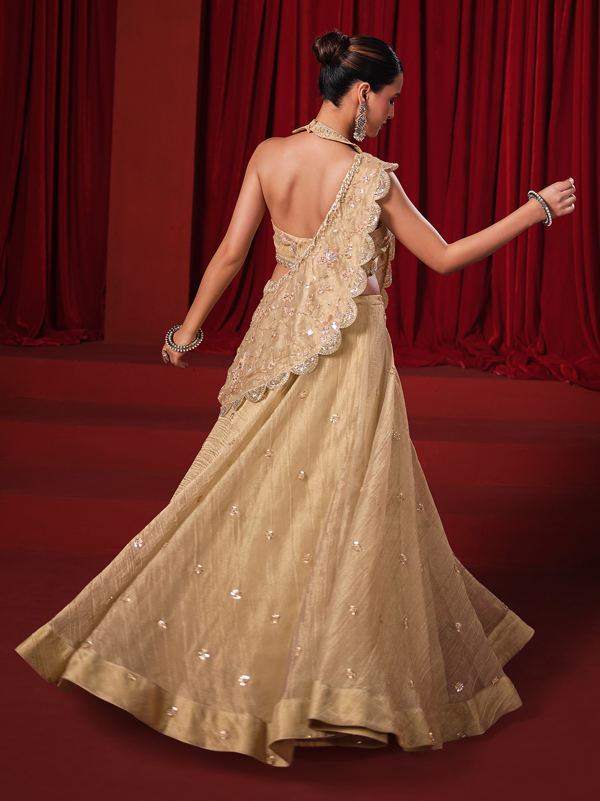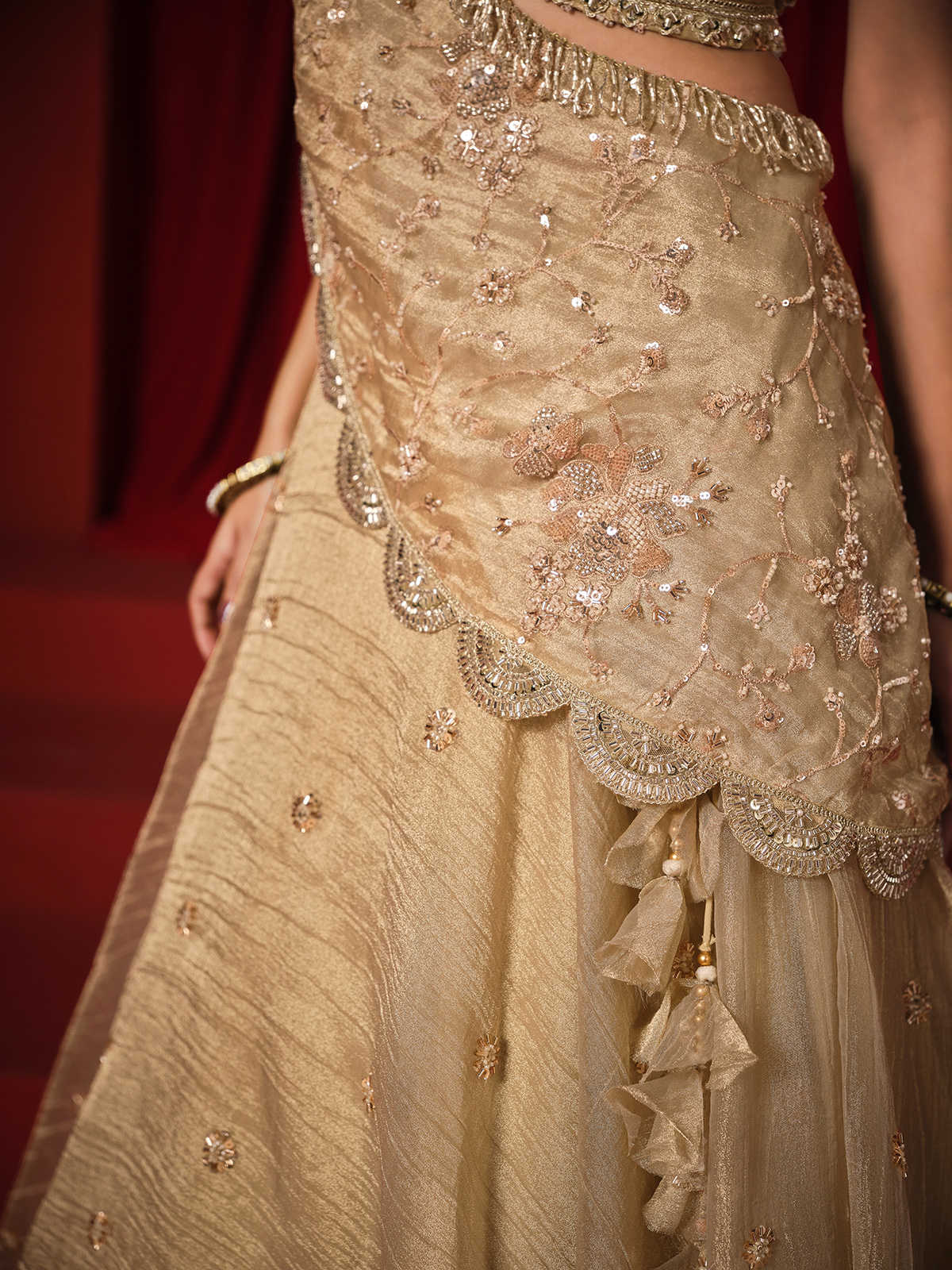Crafted in luminous golden chiffon tissue silk designer lehenga choli is adorned with embroidery, sequins, cutdana and pearls work. The V neck sleeveless choli pairs beautifully with a flowing lehenga and coordinated with attetched dupatta, making it an elegant choice for weddings, receptions and sangeet celebrations.