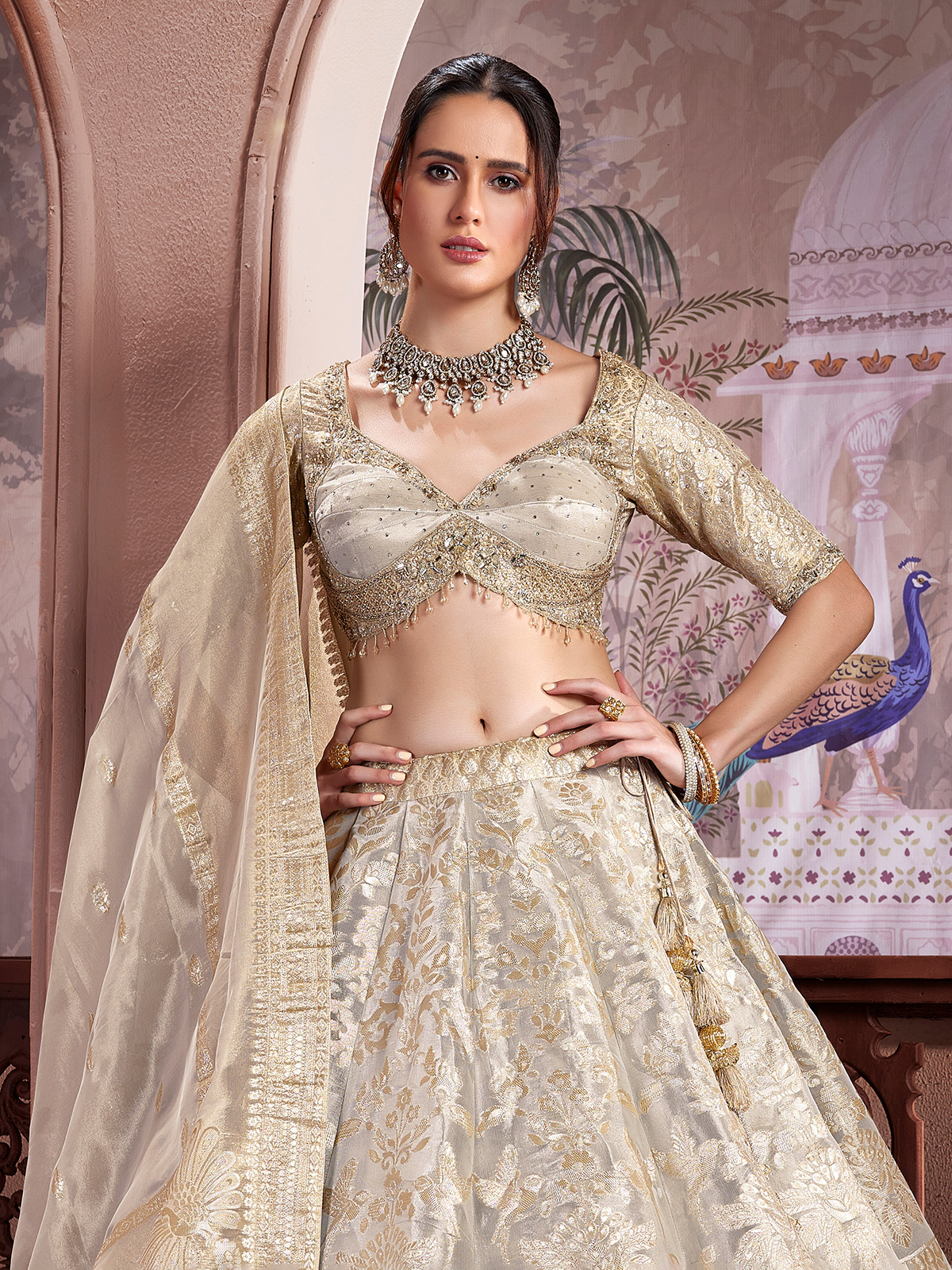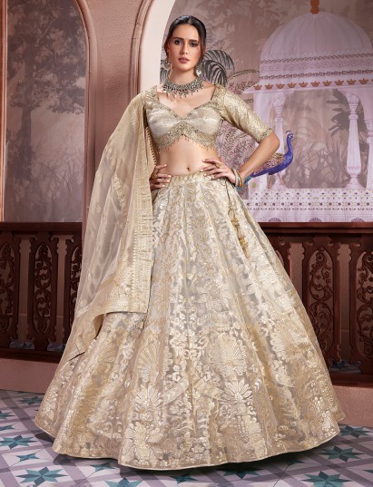 Golden Tissue Silk Sweetheart Neck Lehenga Choli Ensemble