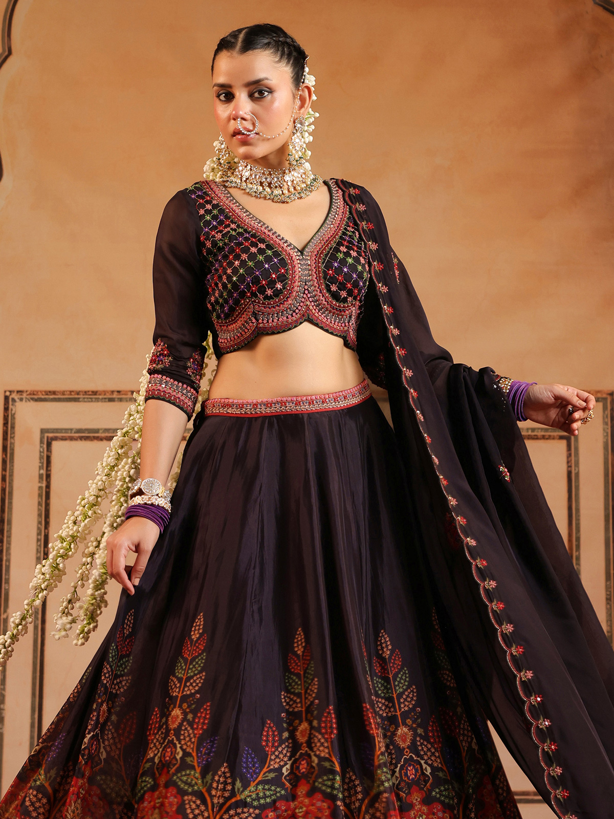Bathed in regal wine hues, this satin silk printed lehenga choli enchants with a sweetheart neckline and quarter sleeve choli with dupatta. Sequins, beads, embroidery, and thread artistry enhance its grandeur. Designed for weddings, it embodies royal splendor and traditional opulence.