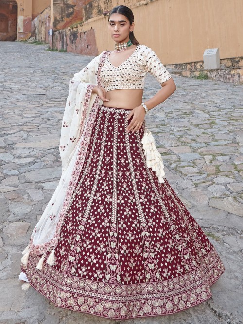 Make a stunning statement with this gorgeous maroon and white georgette lehenga choli with embroidery, sequins, cutdana, resham, and zardosi work. The V neck and half sleeves of the choli complete the elegant look. Comes with a dupatta.
