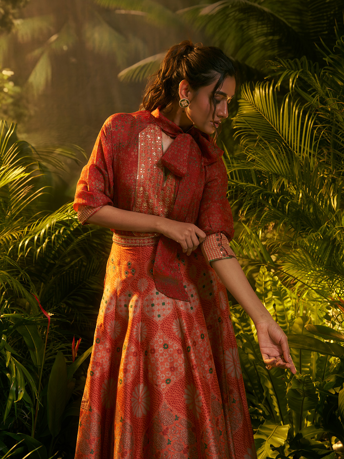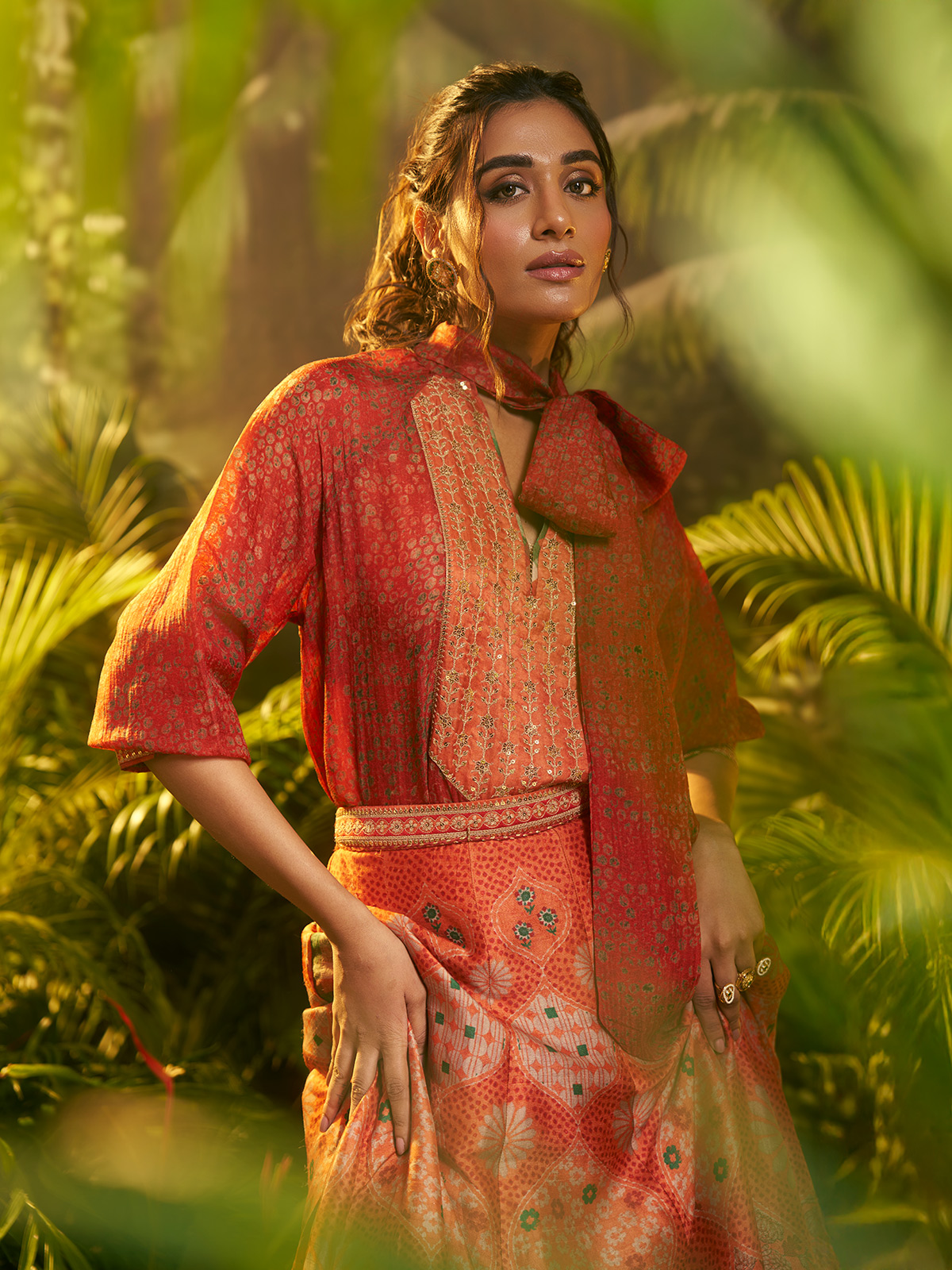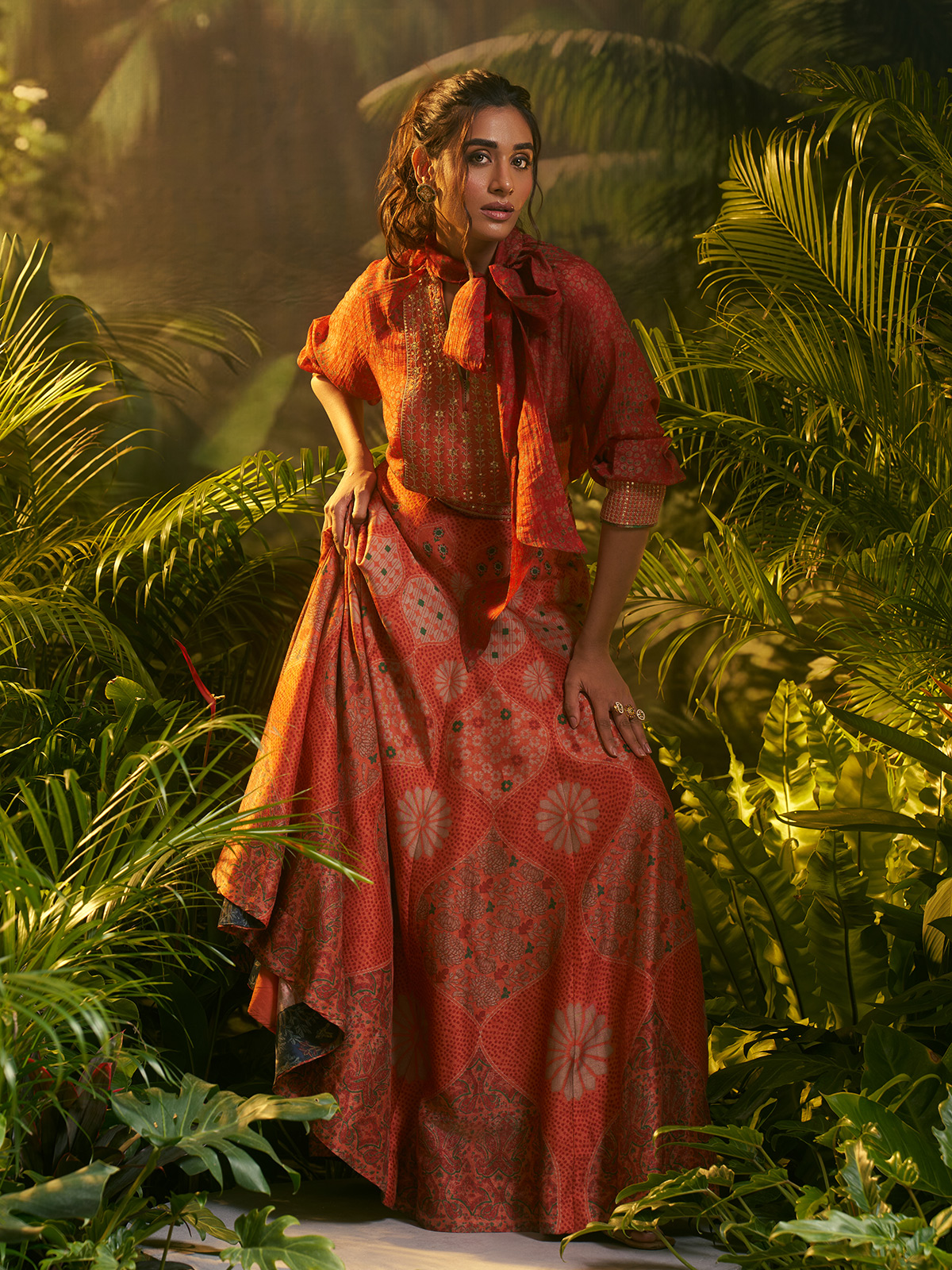 Radiant brilliance shines in this red silk lehenga choli, crafted for bridal opulence. The printed fabric glows with resham and sequins, weaving traditional artistry into every detail. A V-neckline with quarter-sleeved shirt-style choli enhances its charm, creating a majestic choice for wedding occasions filled with festivity and regal allure.